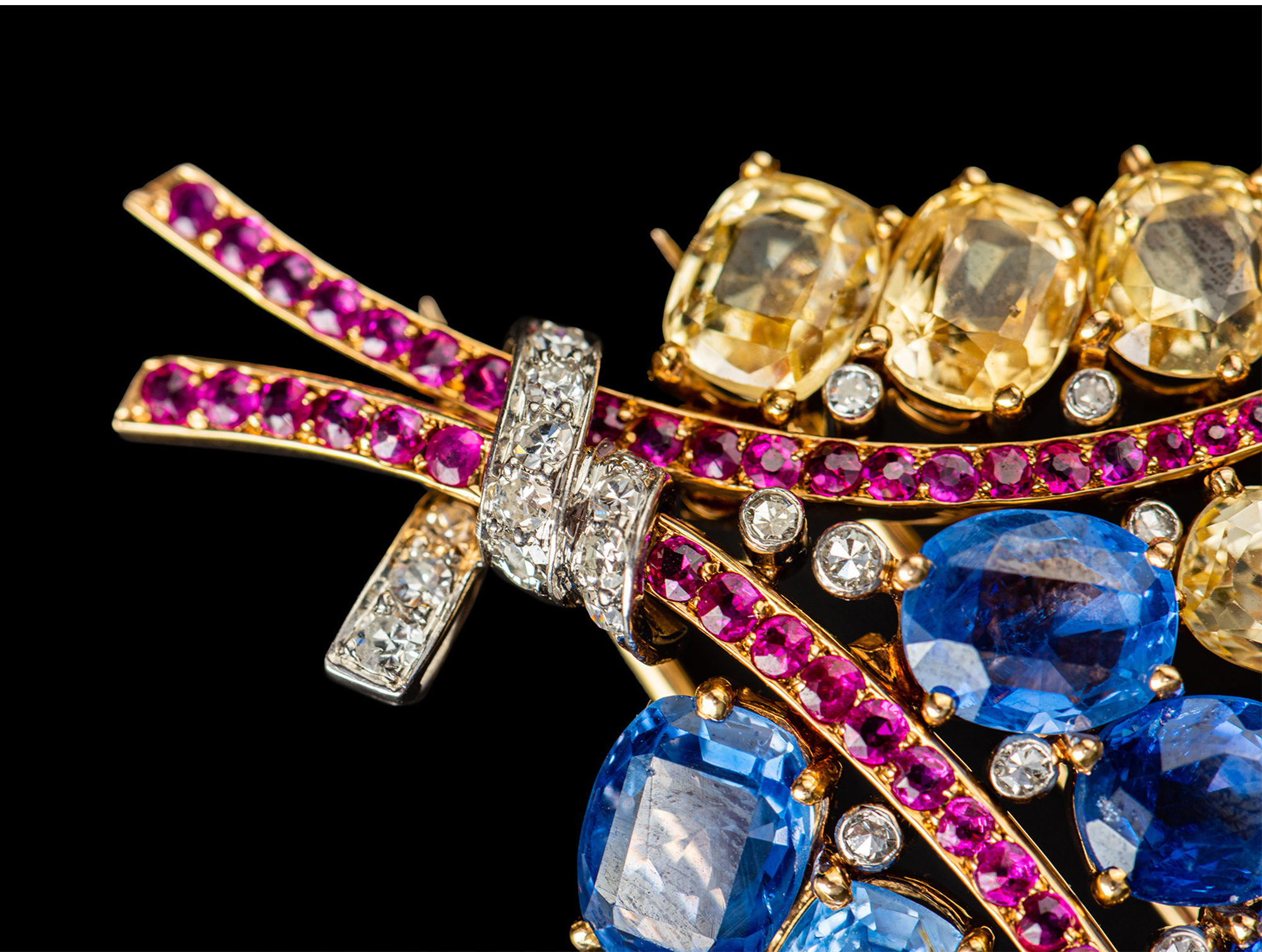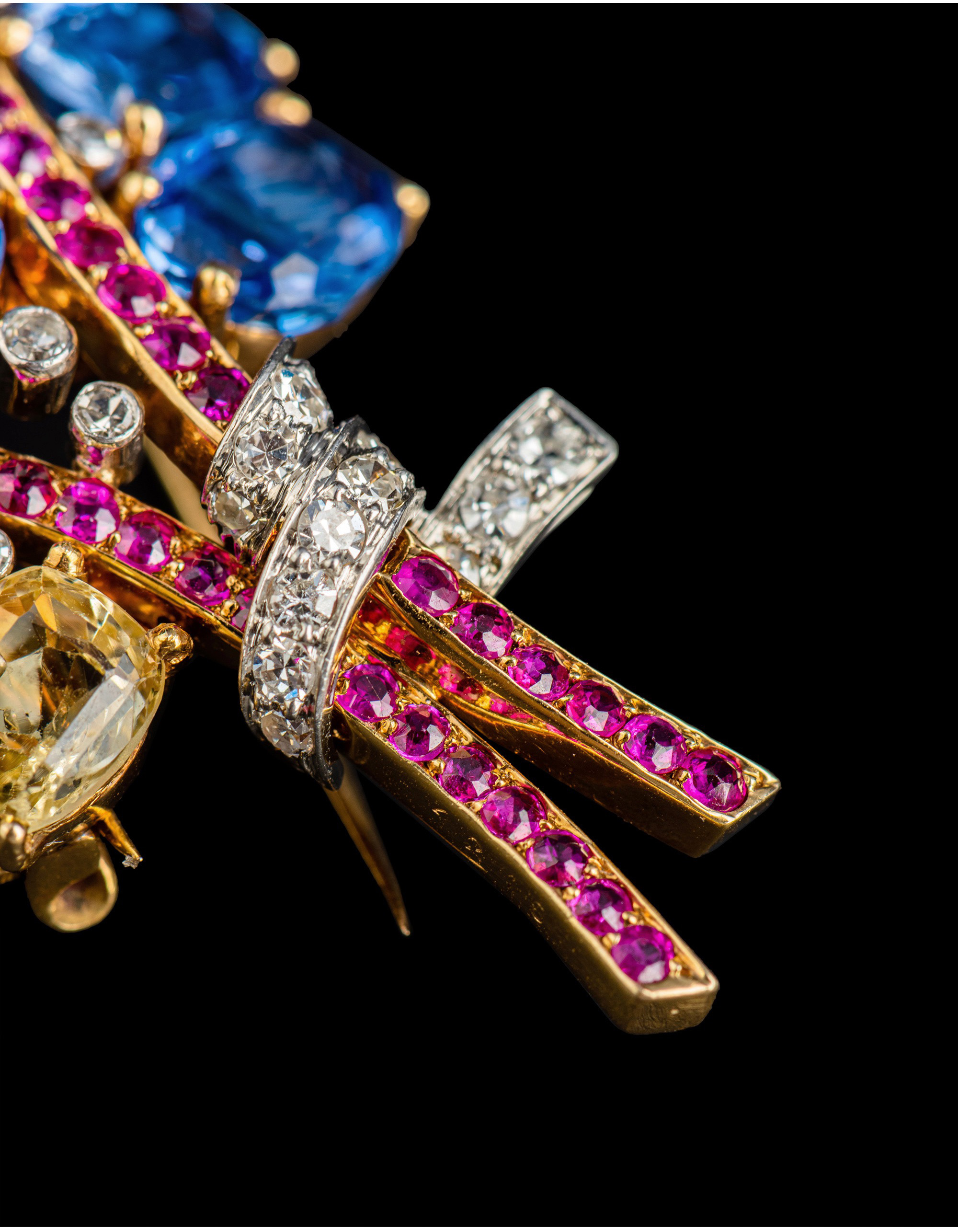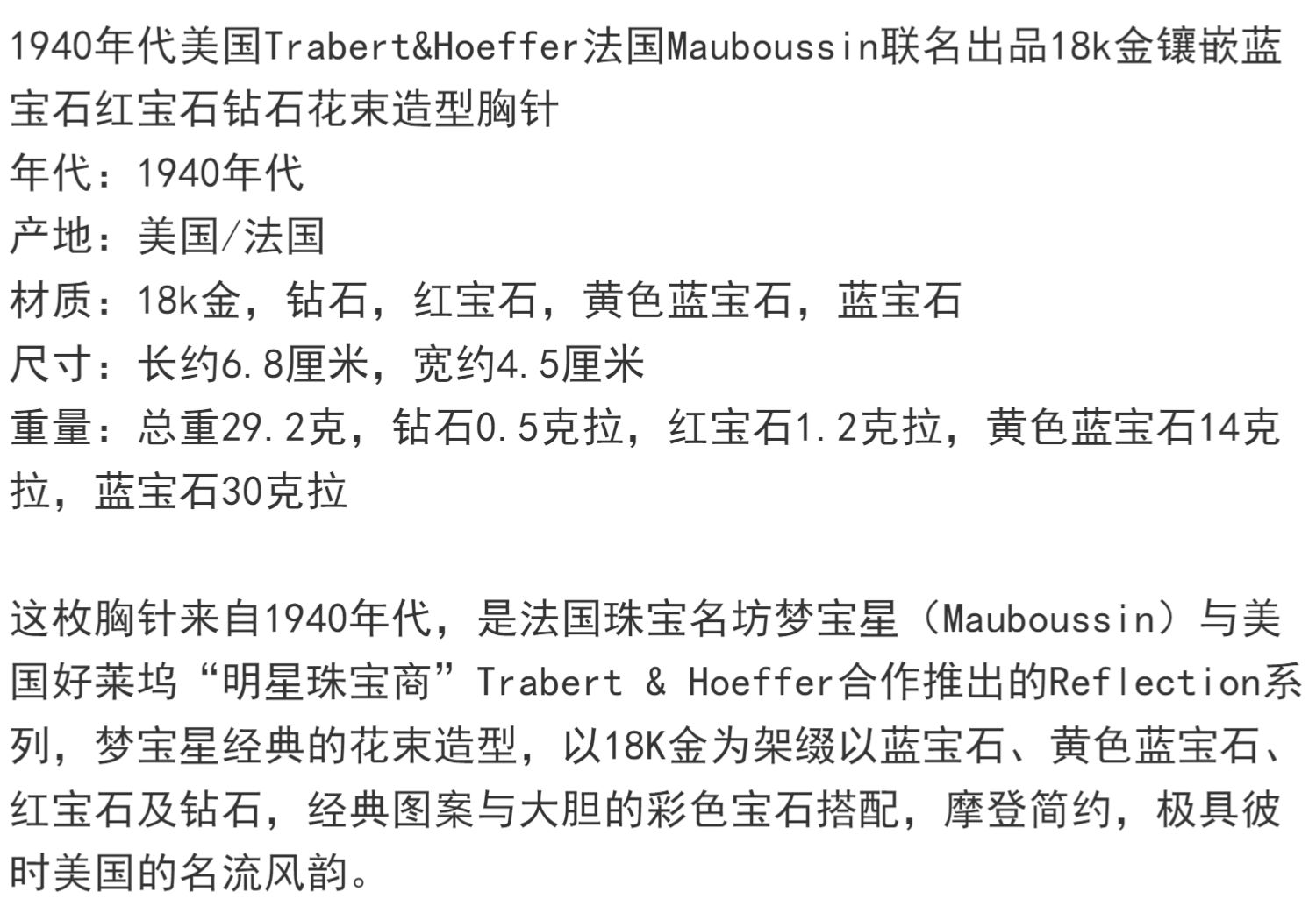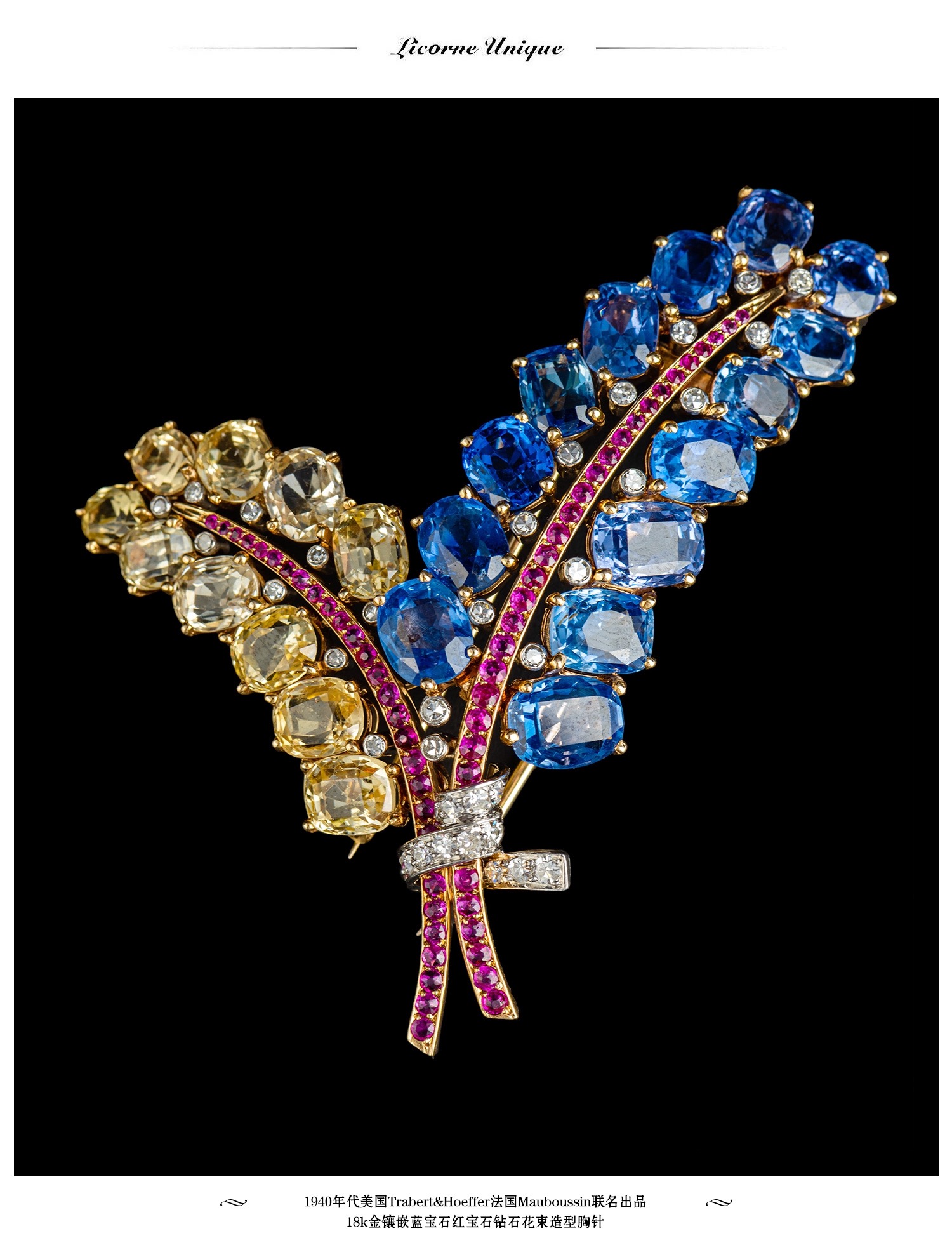 独角鹿西洋古董Mauboussin联名18K金镶蓝宝石红宝石钻石花束胸针