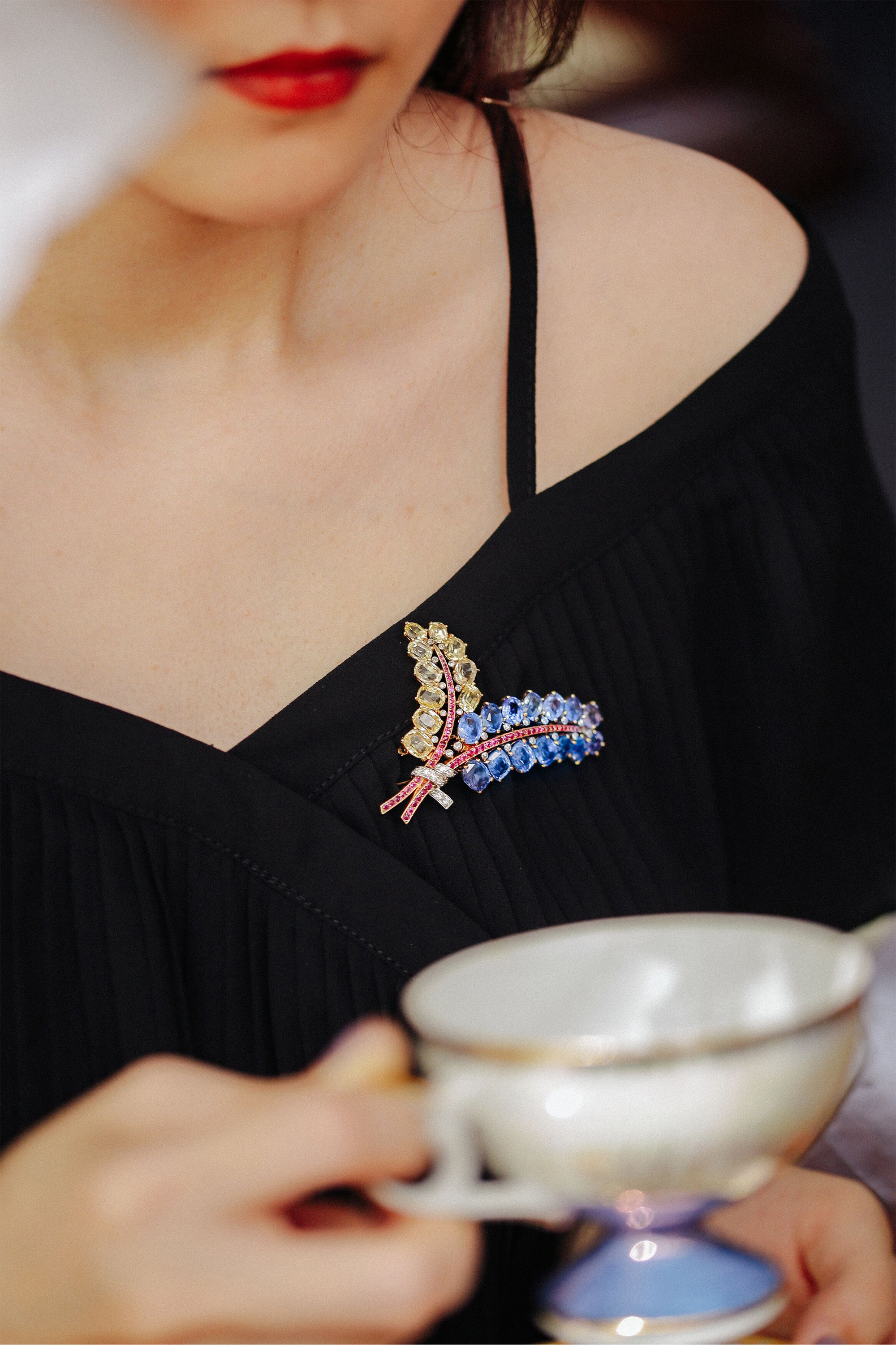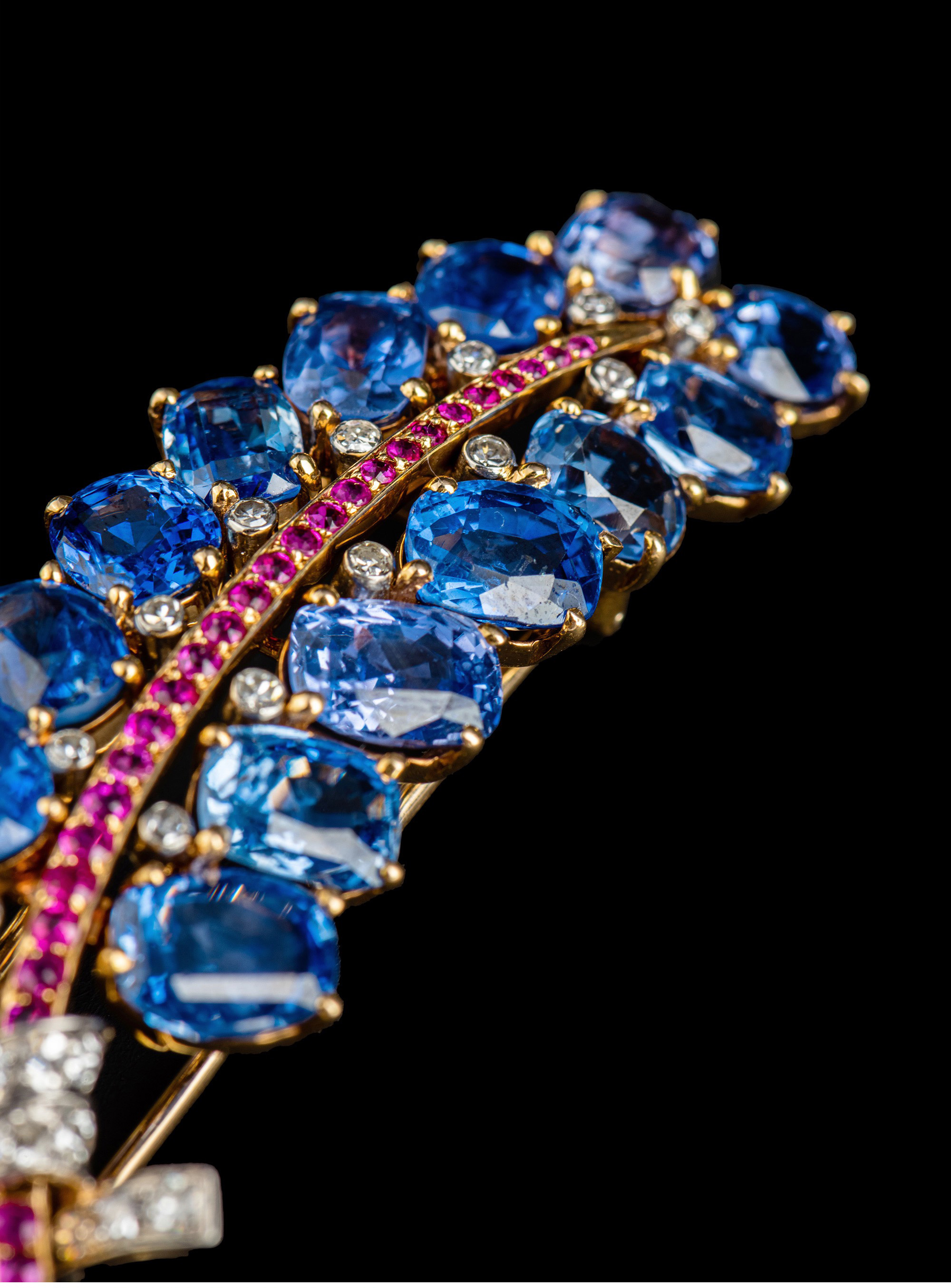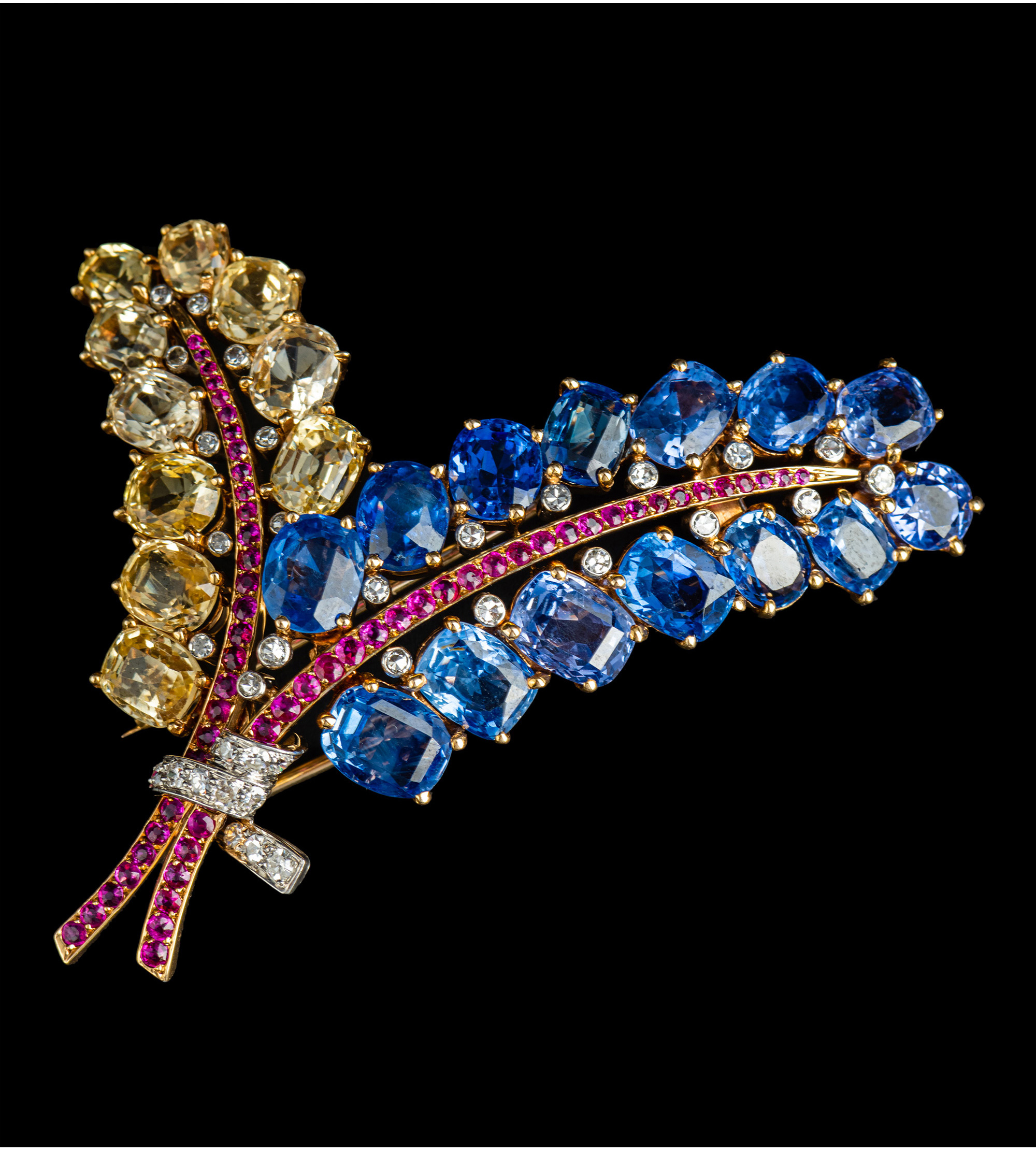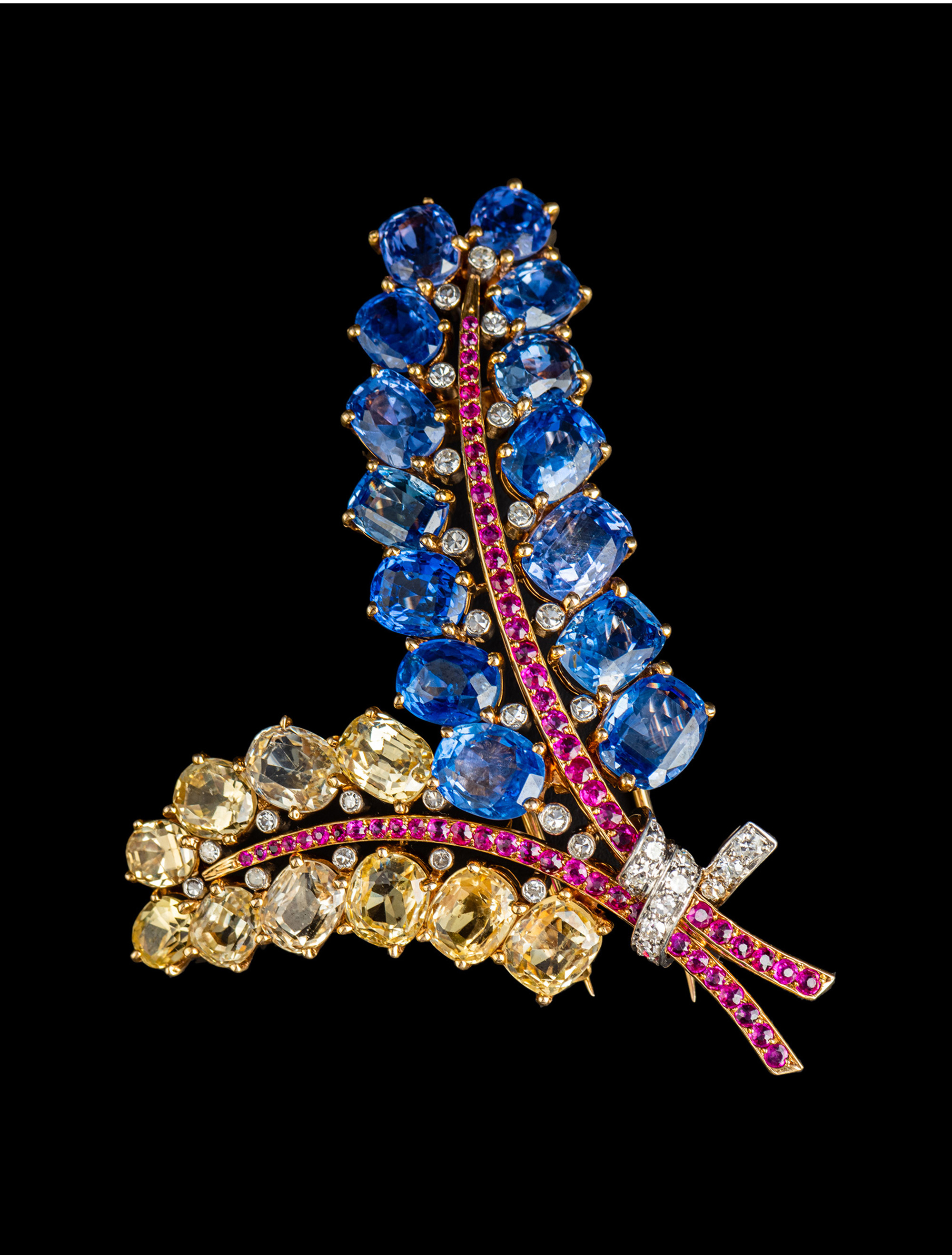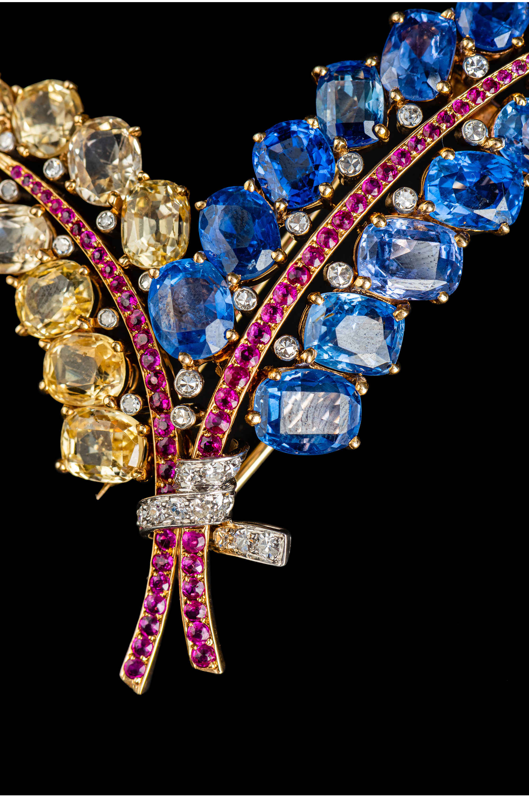 独角鹿西洋古董Mauboussin联名18K金镶蓝宝石红宝石钻石花束胸针