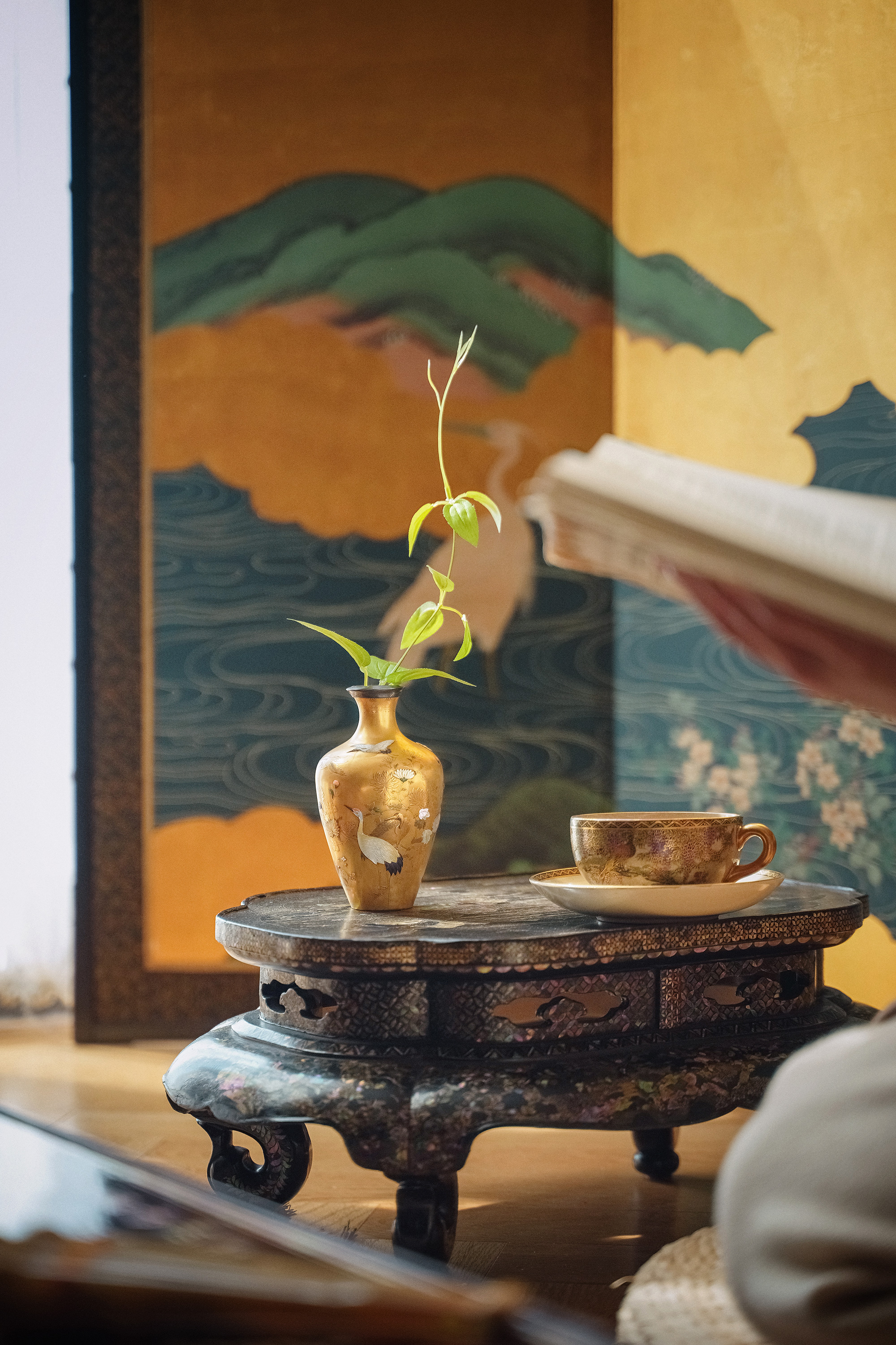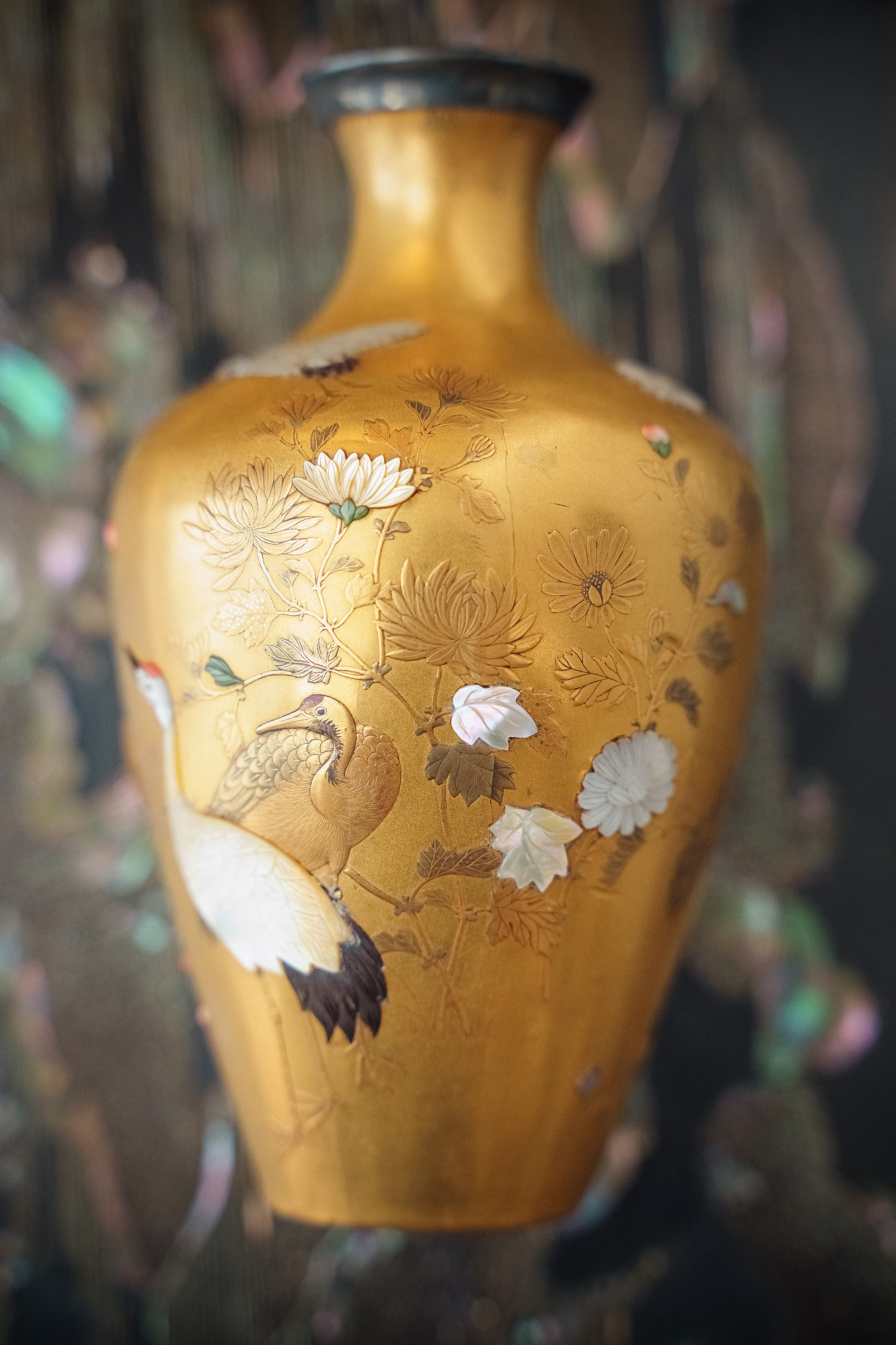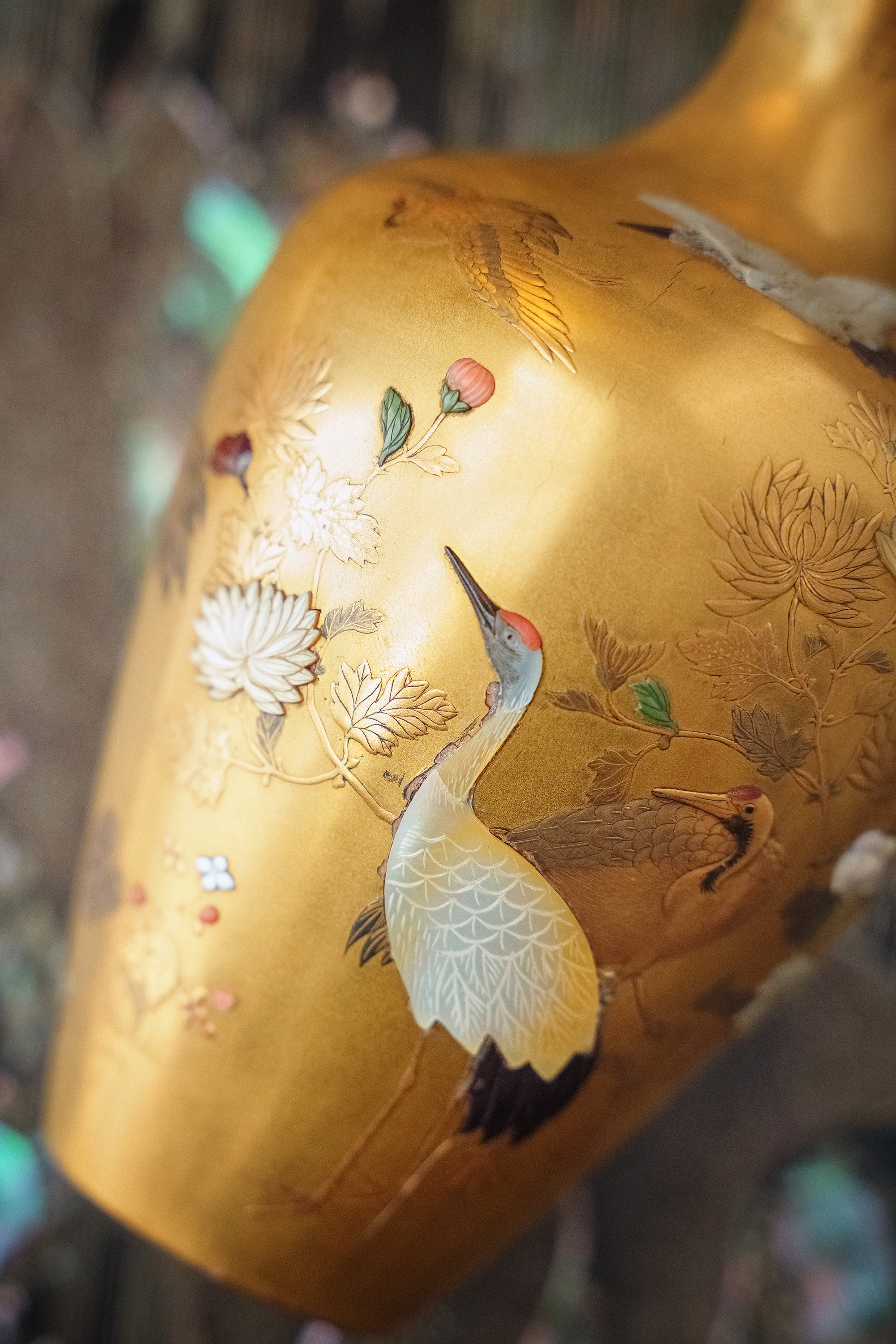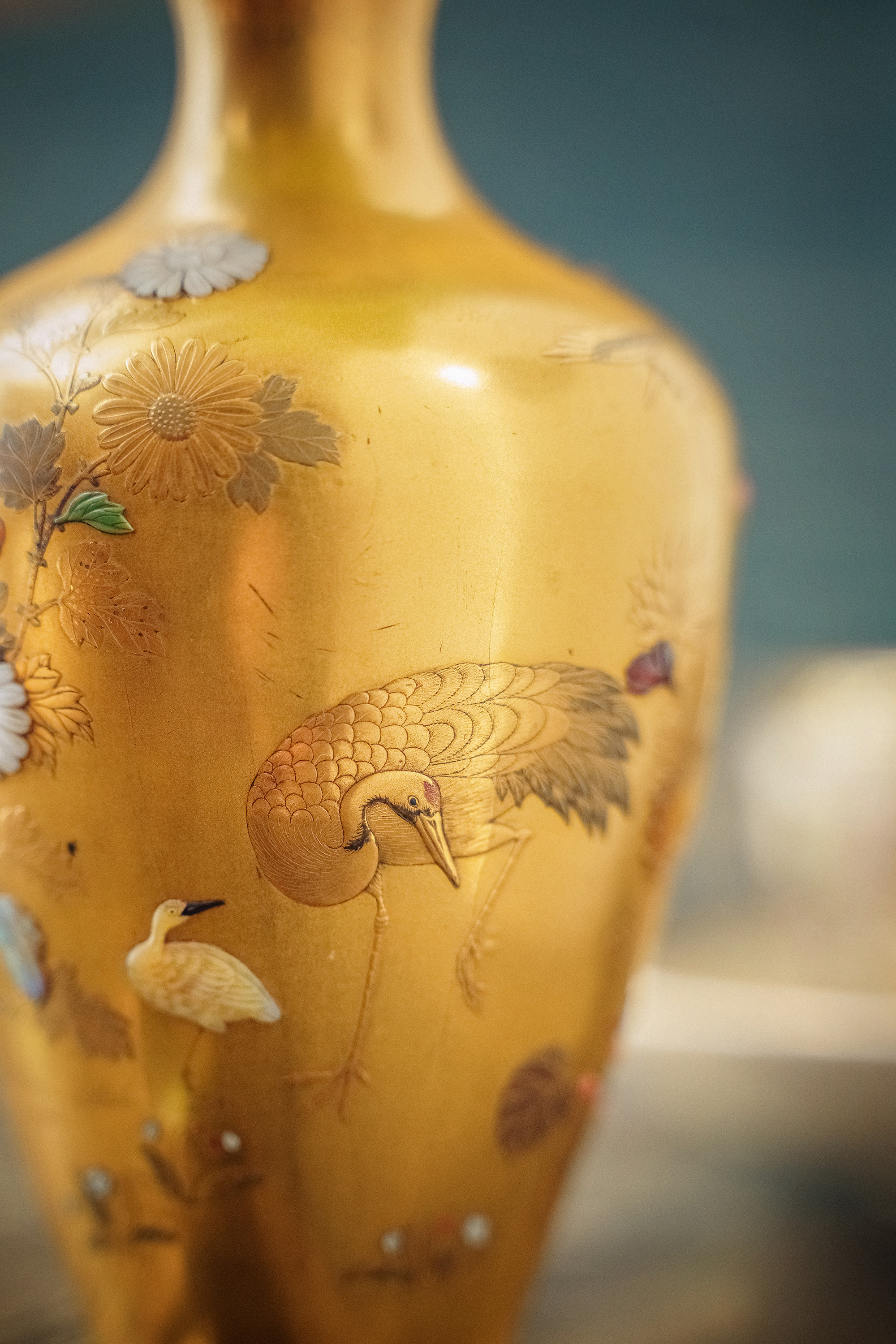 独角鹿西洋古董18-19世纪日本江户时期「抱義斋 幸鸠」款金漆高莳绘芝山镶嵌“鹤寿菊龄”包银口漆器小瓶