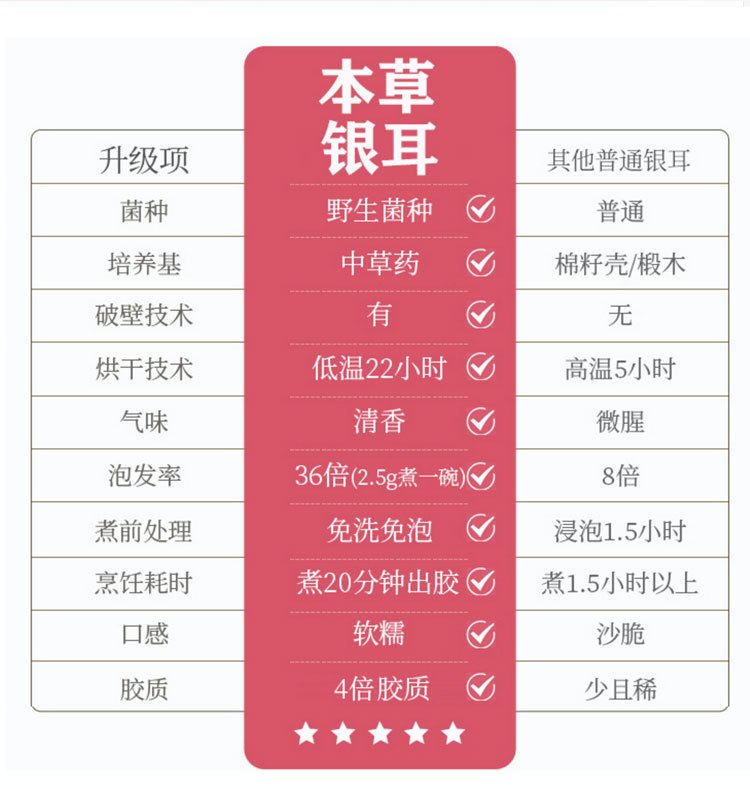 🆚 市面上普通银耳,主要由棉籽壳,麦麸代料培植 不仅煮制时间长,而且营养成份低,胶质少,口感沙翠。