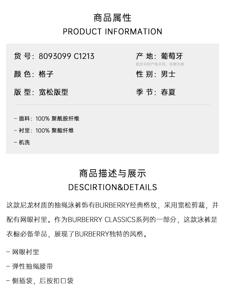 BURBERRY 巴宝莉 男士格纹休闲游泳裤 格子 8093099 C1213