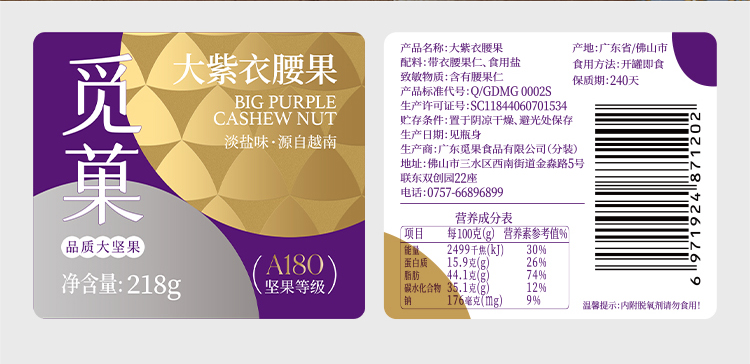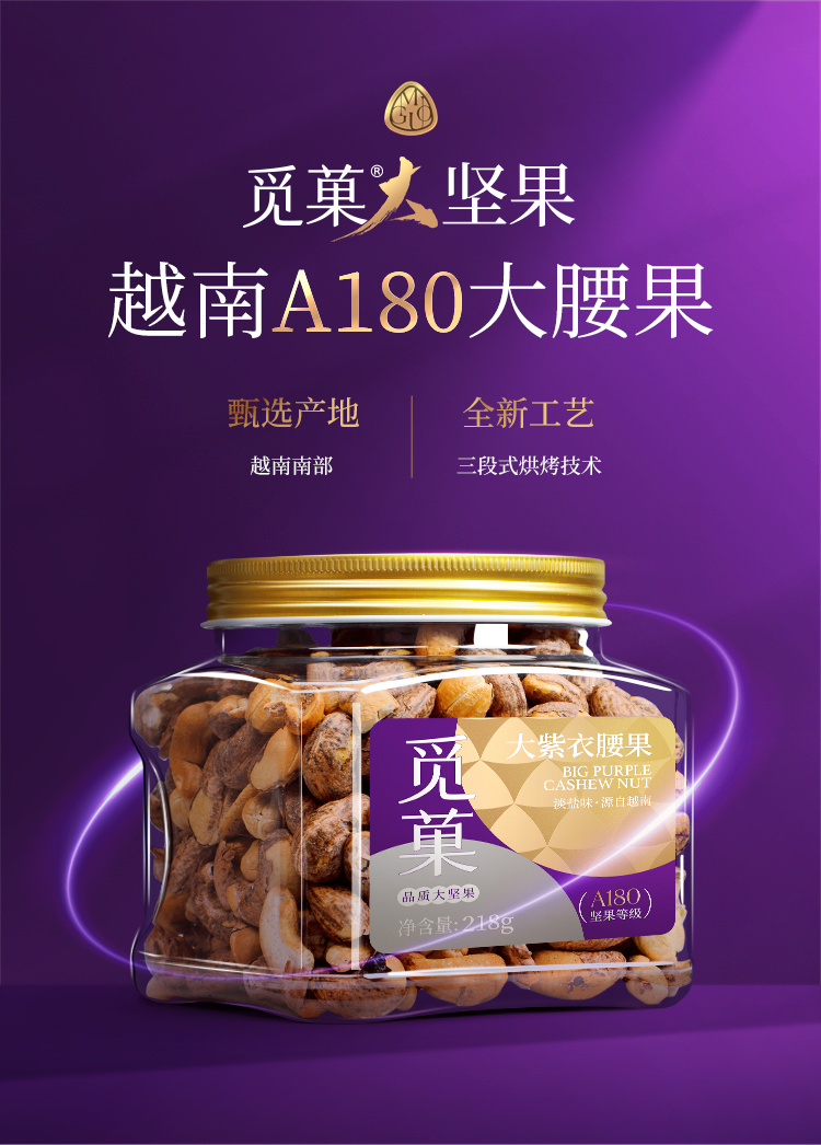 品牌直发 觅菓 晚熟A180越南大紫衣腰果 218g/罐x4