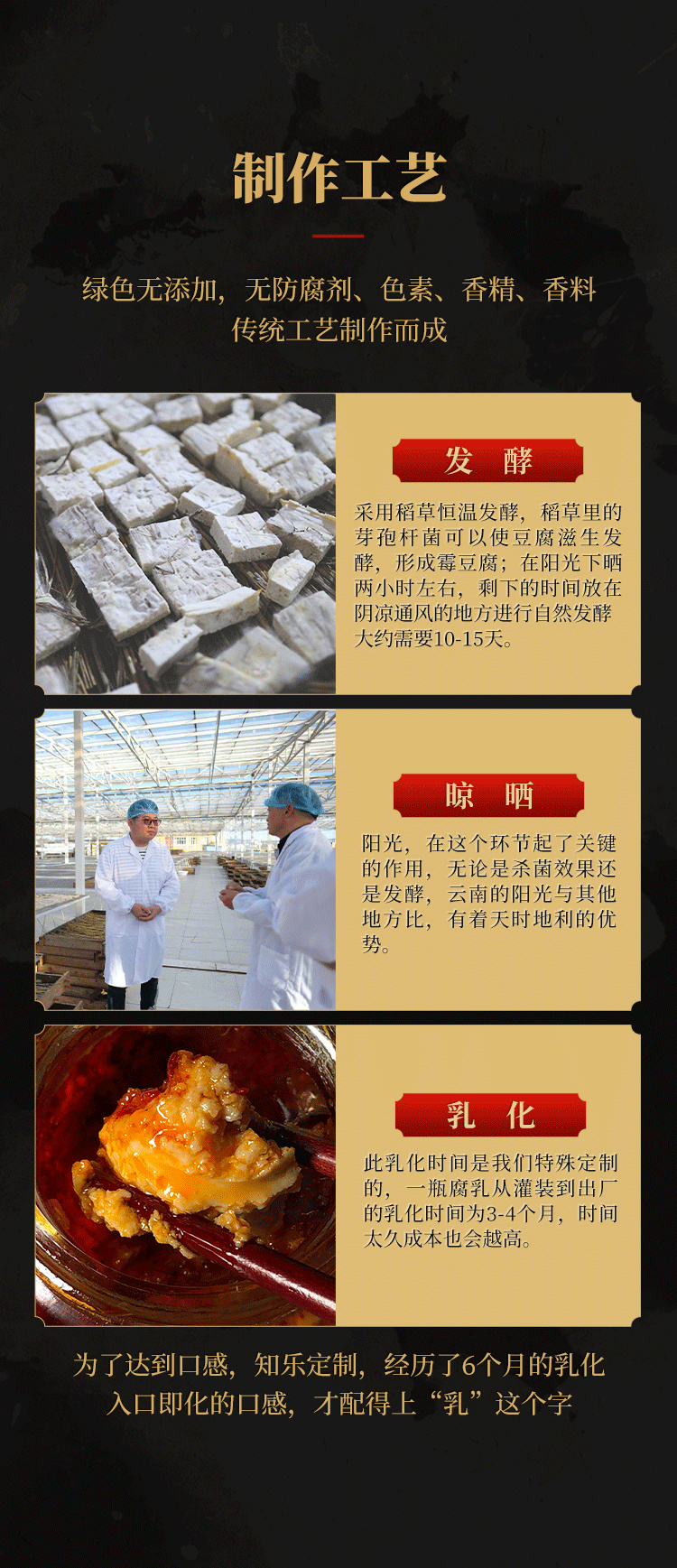 4、乳化:此款腐乳的乳化时间是我们特殊定制的,一般一瓶腐乳从灌装到出厂的乳化时间为3—4个月,时间久了成本也会高,但是为了达到口感,我们的腐乳经历了6个月的乳化时间,只有入口即化的口感,才配的上“乳”这个字。