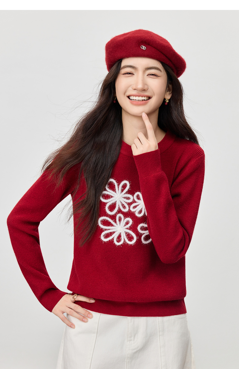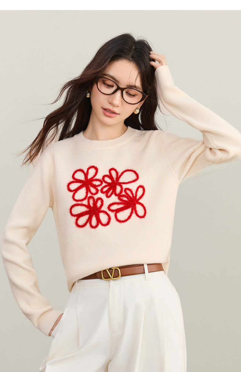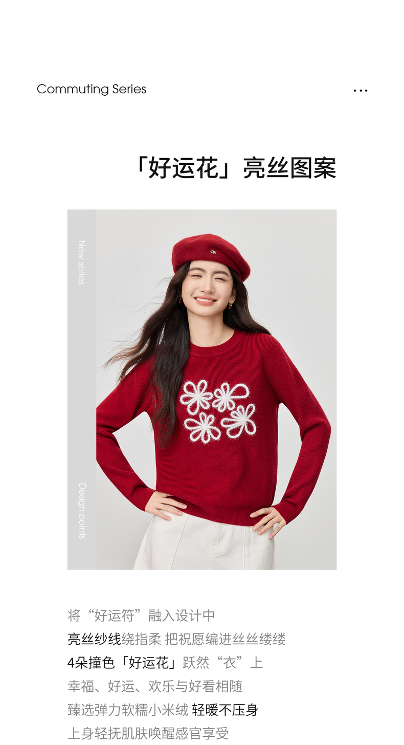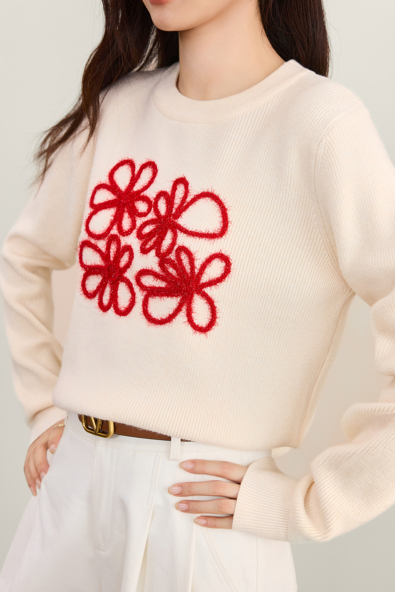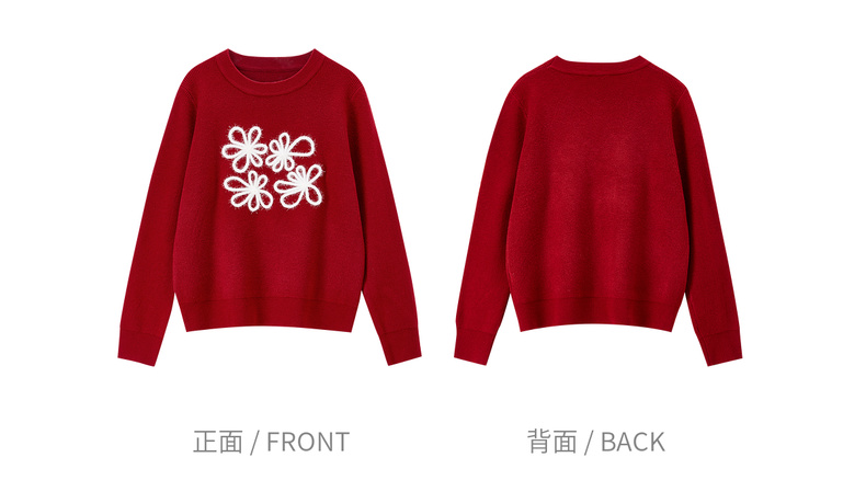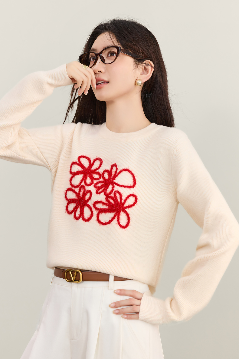 【内购】【好运花】时尚设计感亮丝花朵图案圆领直筒软糯弹力小米绒毛衣-W53EE3864