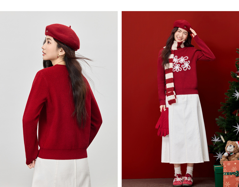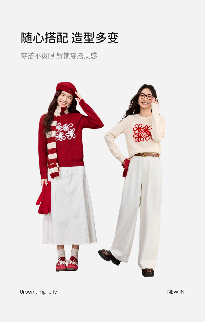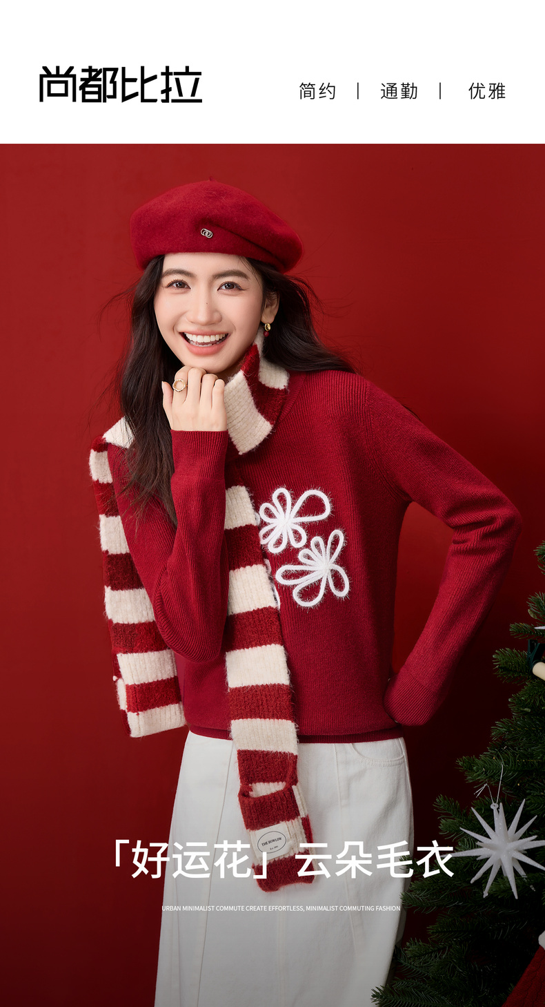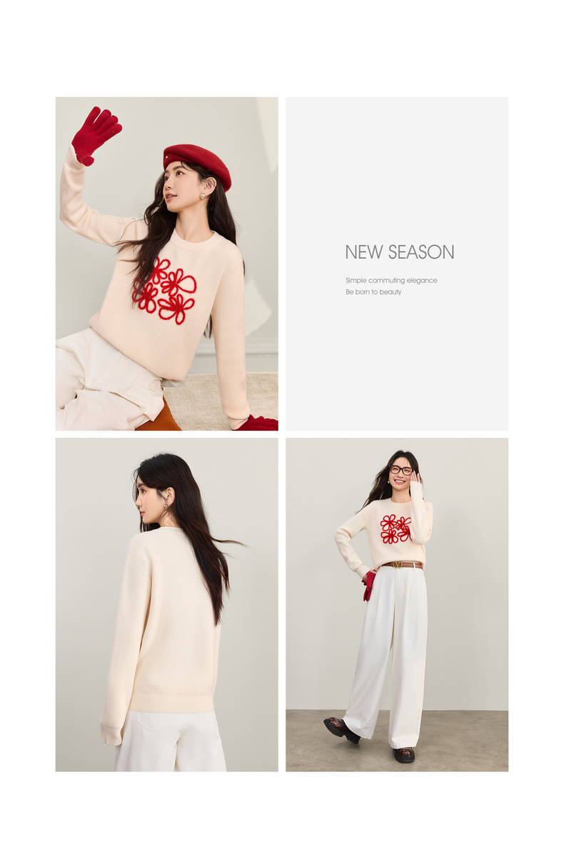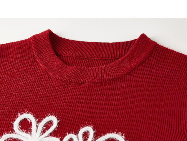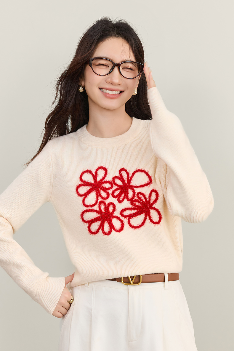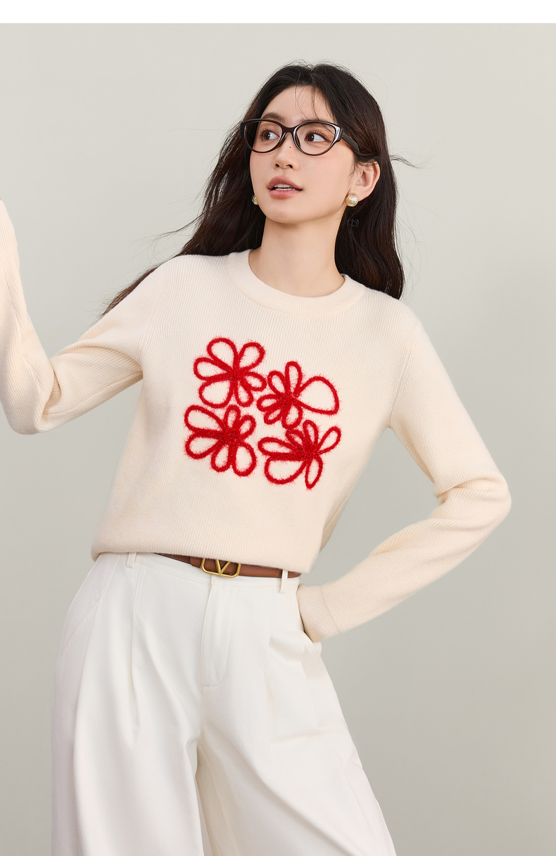 【内购】【好运花】时尚设计感亮丝花朵图案圆领直筒软糯弹力小米绒毛衣-W53EE3864