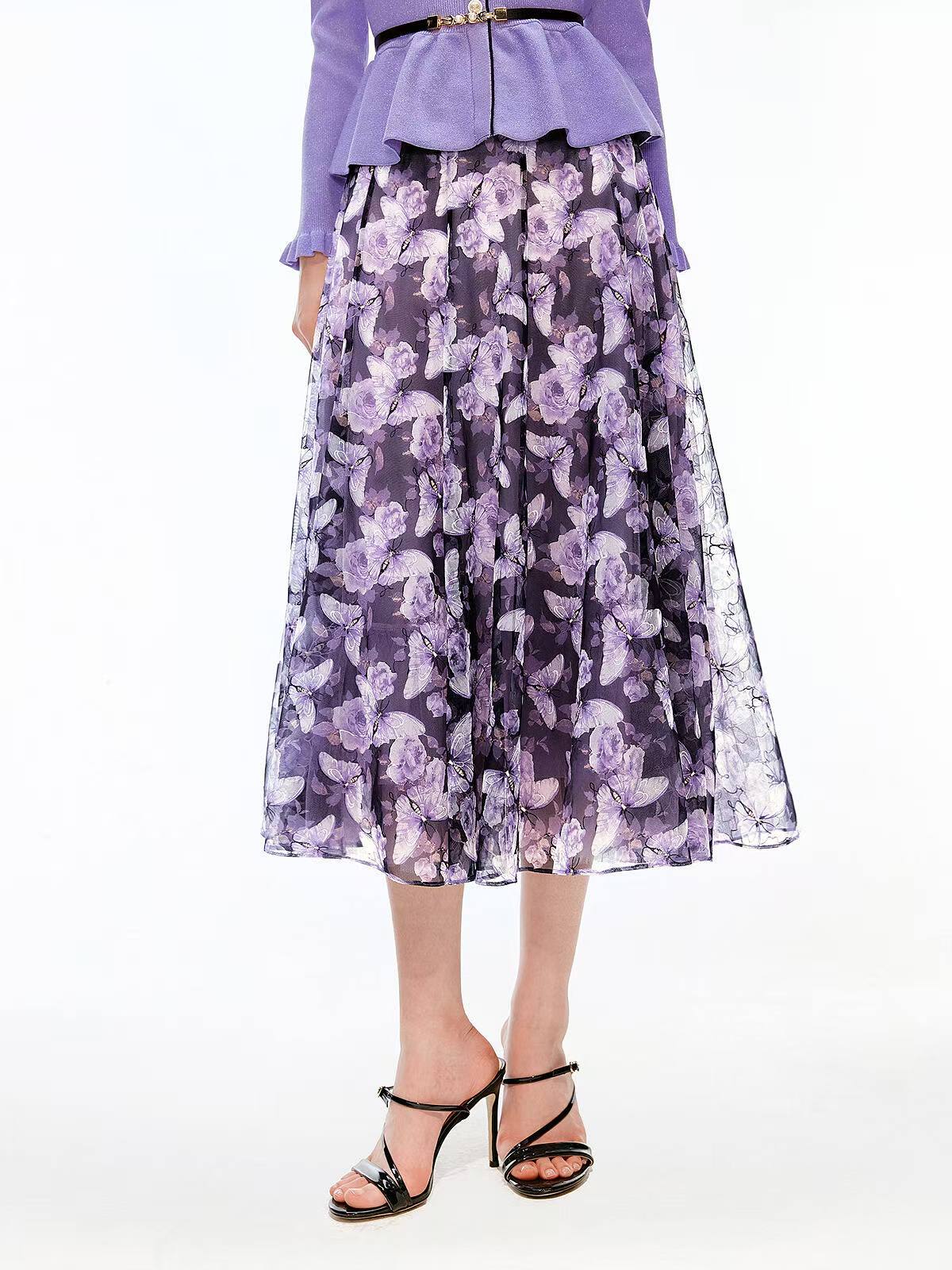 珂莱蒂尔koradior女装半裙紫蝶漫花印绣伞裙KW04018S4