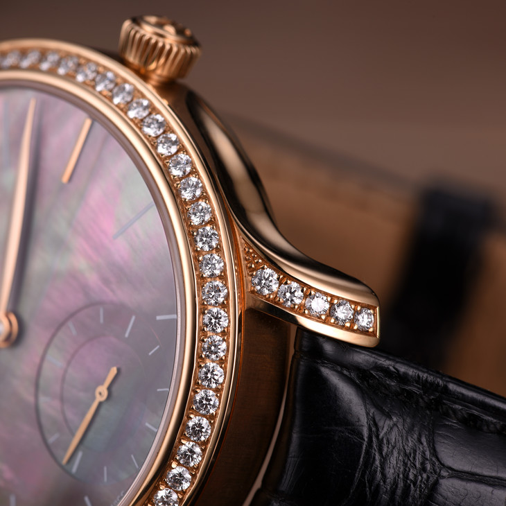 镜面材质 | 蓝宝石水晶玻璃 | 表盘 | 18K玫瑰金镶钻表圈 表耳 珍珠母贝表盘 18K玫瑰金时针分针 偏心秒针,停秒功能能够精确到秒的设置 小三针 透底,动力储备显示 |