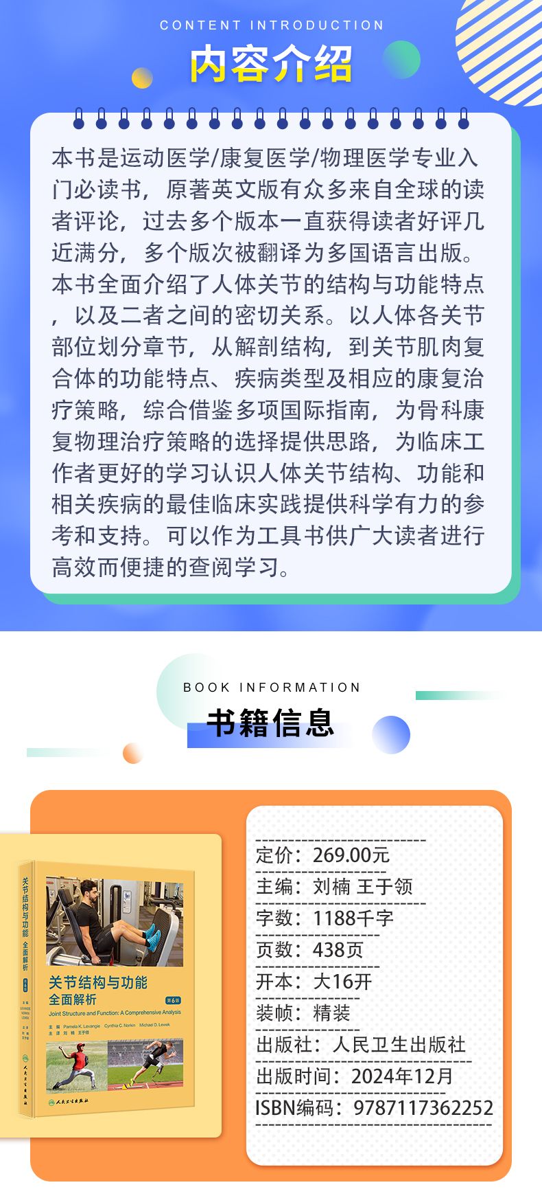 本书是运动医学/康复医学/物理医学专业入门必du书,原著英文版有众多来自全球的读者评论,过去多个版本一直获得读者好评几近满分,多个版次被翻译为多国语言出版。本书全面介绍了人体关节的结构与功能特点,以及二者之间的密切关系。以人体各关节部位划分章节,从解剖结构,到关节肌肉复合体的功能特点、疾病类型及相应的康复治疗策略,综合借鉴多项国际指南,为骨科康复物理治疗策略的选择提供思路,为临床工作者更好的学习认识人体关节结构、功能和相关疾病的最佳临床实践提供科学有力的参考和支持。可以作为工具书供广大读者进行高效而便捷的查阅学习。