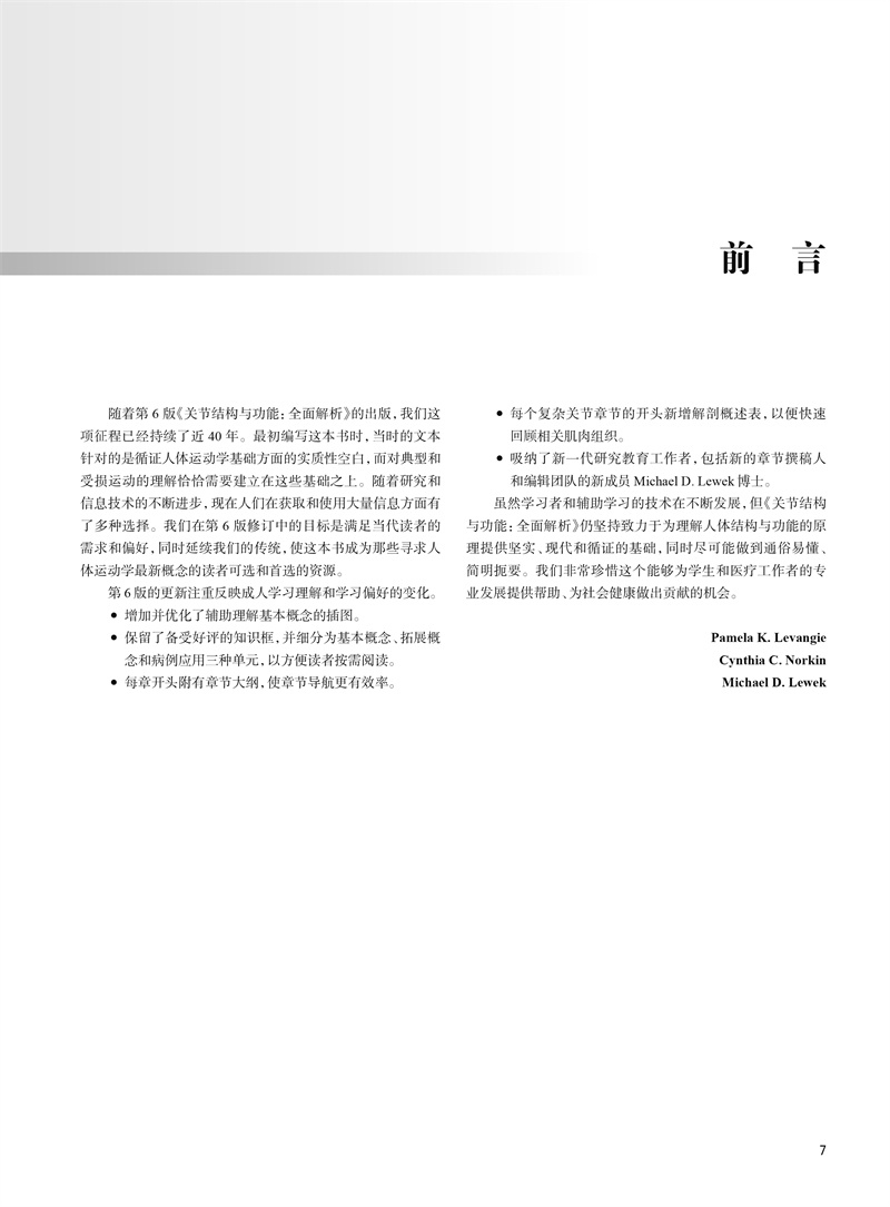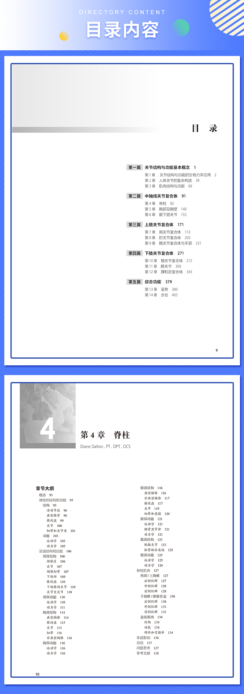 第一篇关节结构与功能基本概念/1 第1章关节结构与功能的生物力学应用/2 第2章人体关节的复杂构造/39 第3章肌肉结构与功能/69 第二篇中轴线关节复合体/91 第4章脊柱/92 第5章胸部及胸壁/140 第6章颞下颌关节/155 第三篇上肢关节复合体/171 第7章肩关节复合体/172 第8章肘关节复合体/205 第9章腕关节复合体与手部/231 第四篇下肢关节复合体/271 第10章髋关节复合体/272 第11章膝关节/306 第12章踝和足复合体/343 第五篇综合功能/379 第13章姿势/380 第14章步态/403