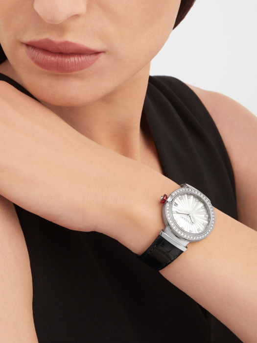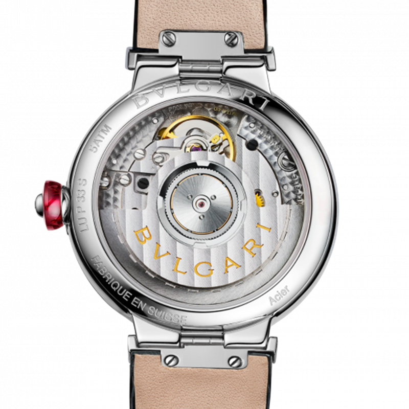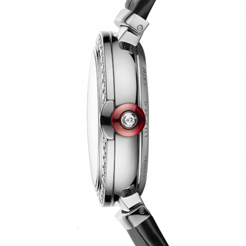 镜面 材质 | 蓝宝石水晶玻璃 | 表盘 | 精钢表壳 灰色珍珠母贝嵌花细工表盘 精钢表冠镶嵌1颗凸形蛋面切割科技红碧玺 透底 |
