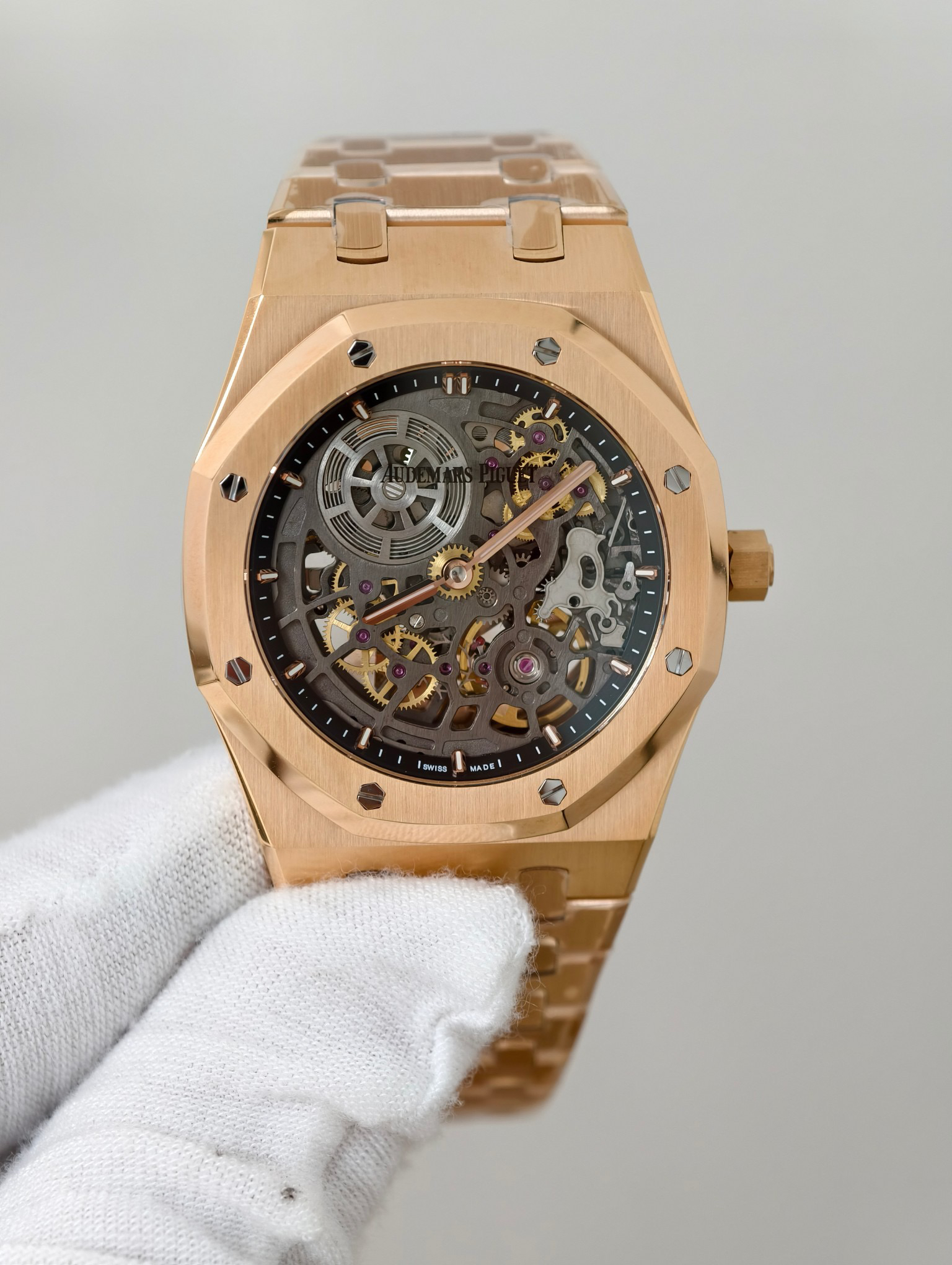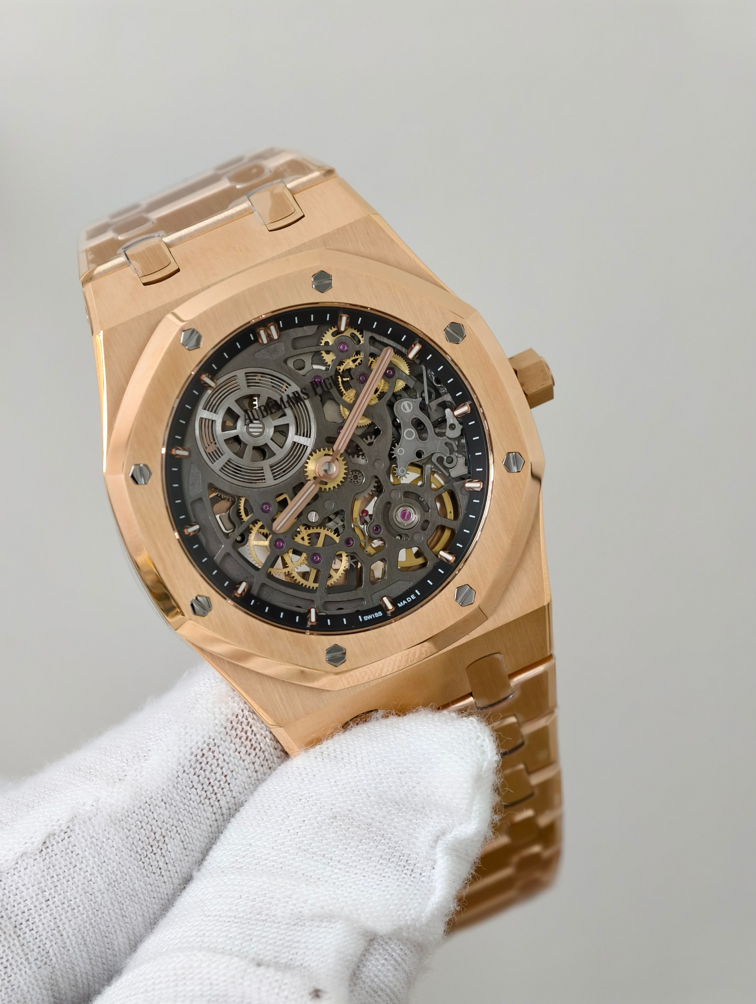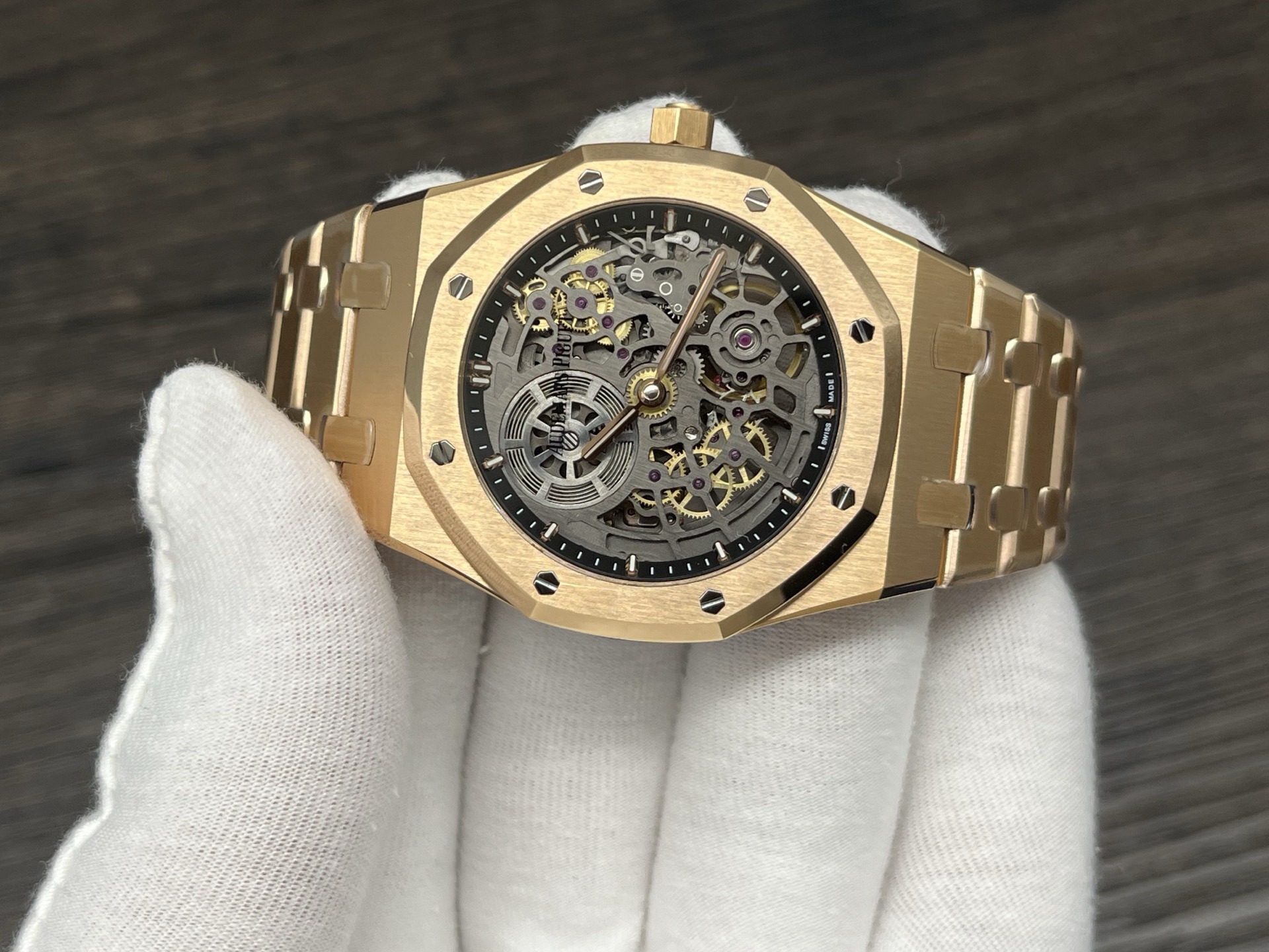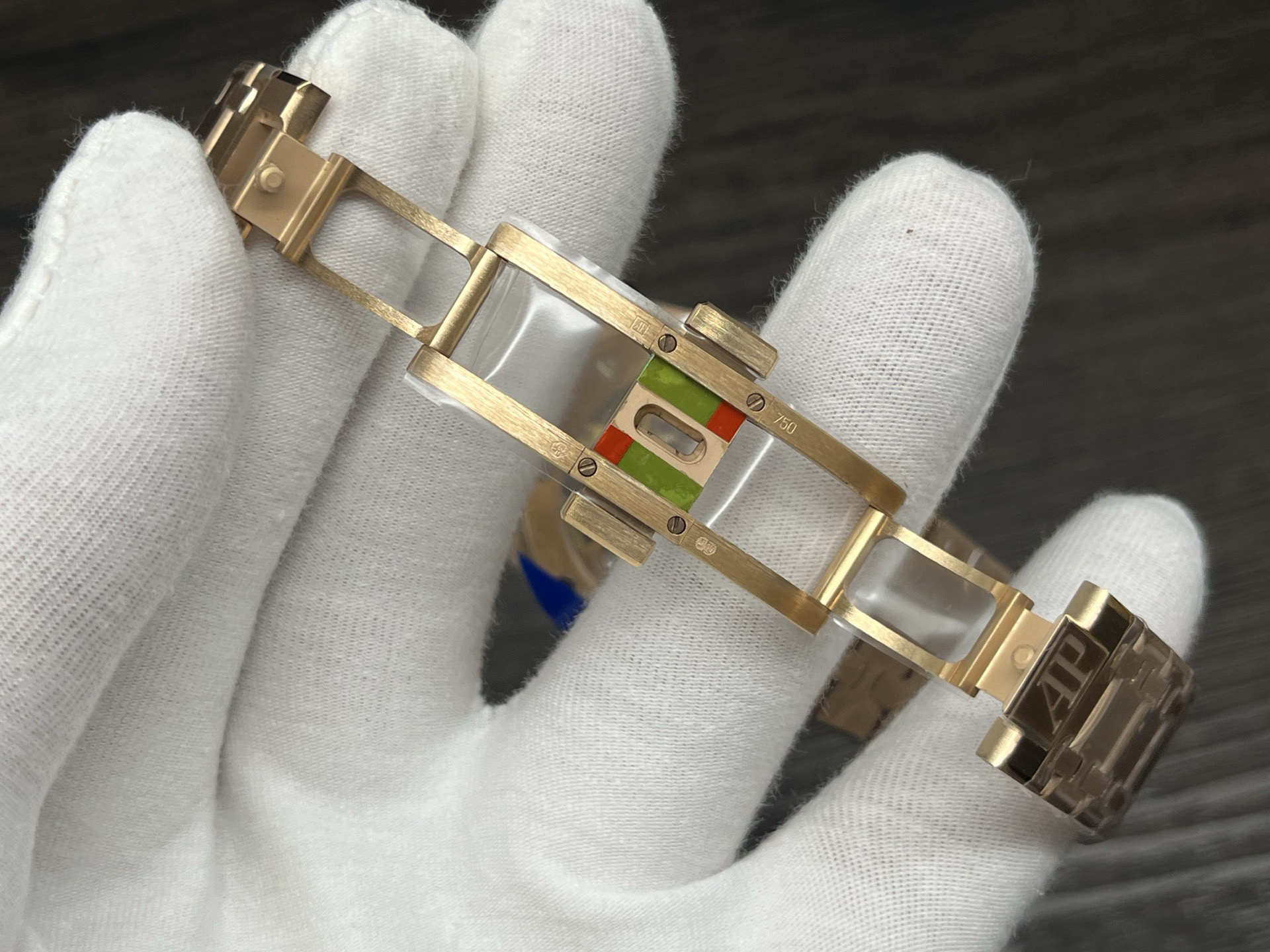 The highly recognizable octagonal 39MM case adopts advanced CNC machining technology to preliminarily cut and shape the stainless steel raw materials, and then uses exquisite wire drawing technology and forging surface polishing treatment to perfectly interweave on the case, presenting a unique luster and texture. The watch strap links are also produced through multiple complex polishing processes, making the surface of the links delicate, tightly connected, and flexible. Ensure comfort and fit when wearing. The AP logo on the watch buckle is finely carved, with clear lines and a three-dimensional steel structure. On the side of the case, the lugs naturally connect with the strap, creating a smooth transition and showcasing a harmonious beauty that is seamlessly integrated!