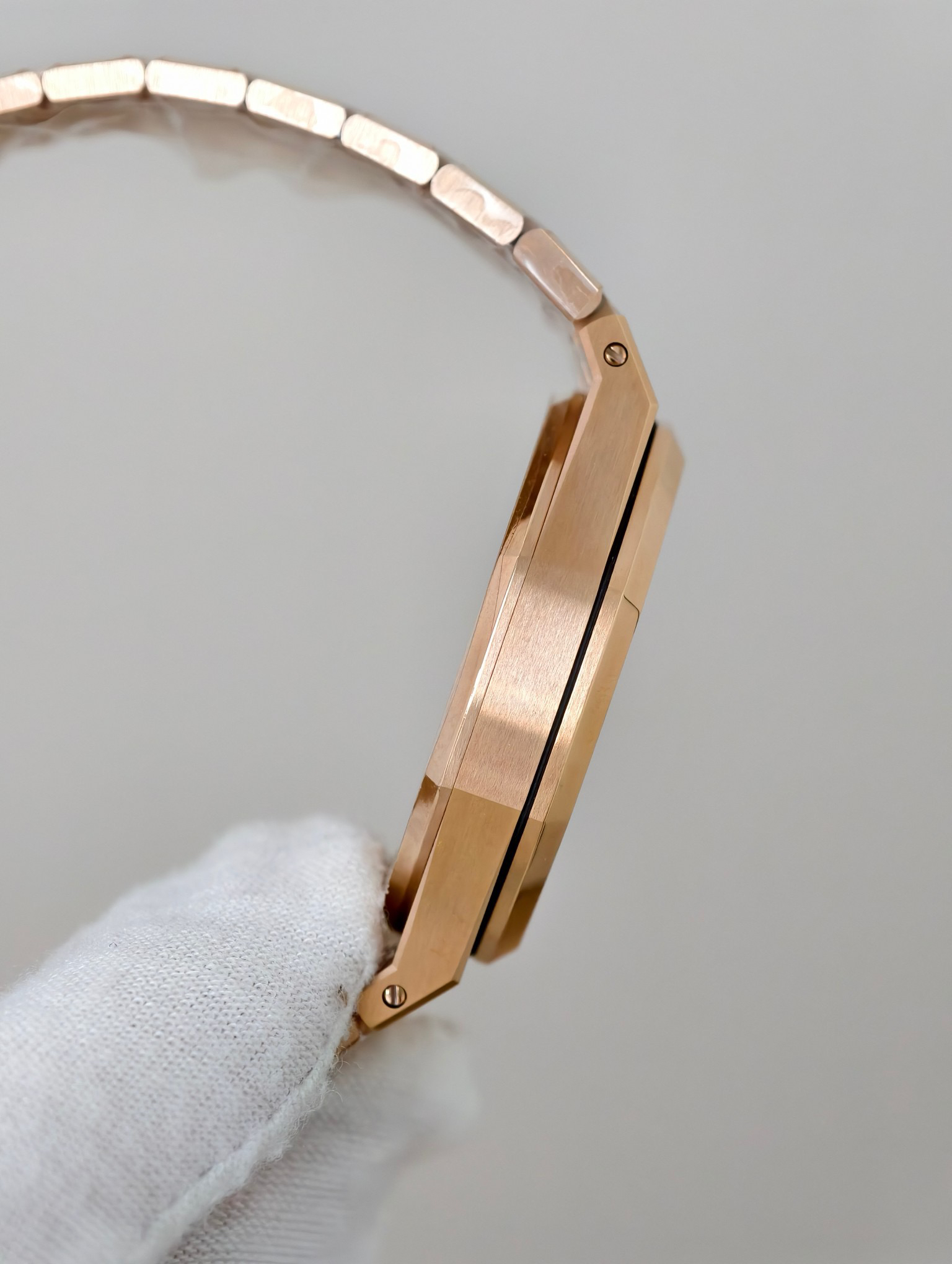 【壳套】高辨识度的八角形39MM表壳,采用先进的CNC数控加工技术对精钢原料进行初步切割与塑形,再使用精湛的拉丝工艺和锻面抛光处理在表壳上完美交织,呈现出独特光泽与质感。表带链节同样经过多道复杂打磨抛光工序制作,使链节表面细腻感十足,衔接紧密且灵活。确保佩带时的舒适度与贴合度。表扣上的AP标志,经过精雕细刻,线条清晰,钢硬立体。在表壳侧面,表耳与表带自然衔接,过渡圆润,展现出浑然一体的和谐美感!
