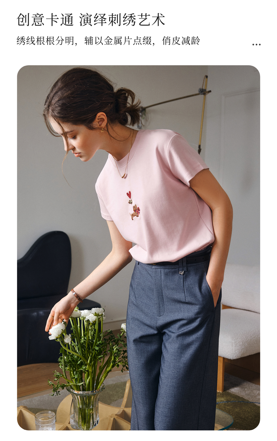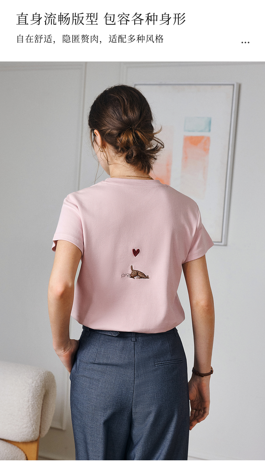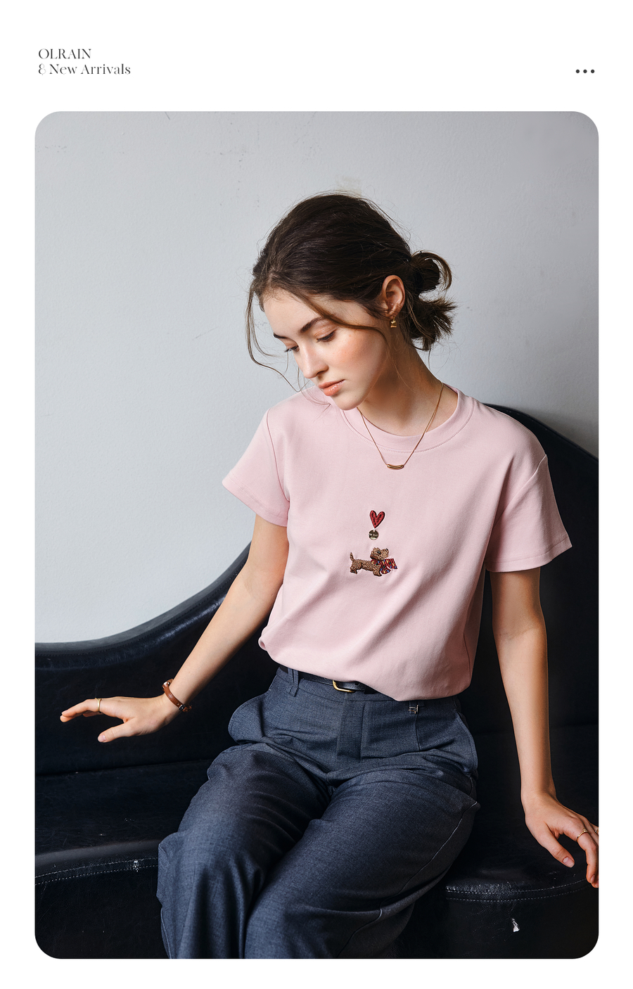 OLrain欧芮儿粉色短袖T恤女夏季2025年新款休闲百搭刺绣上衣