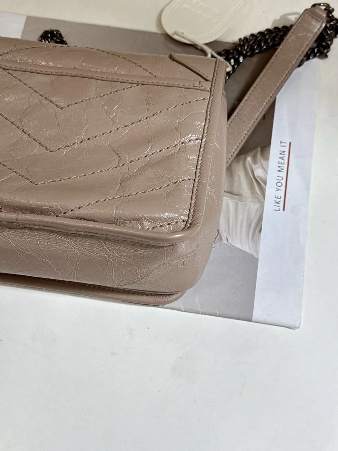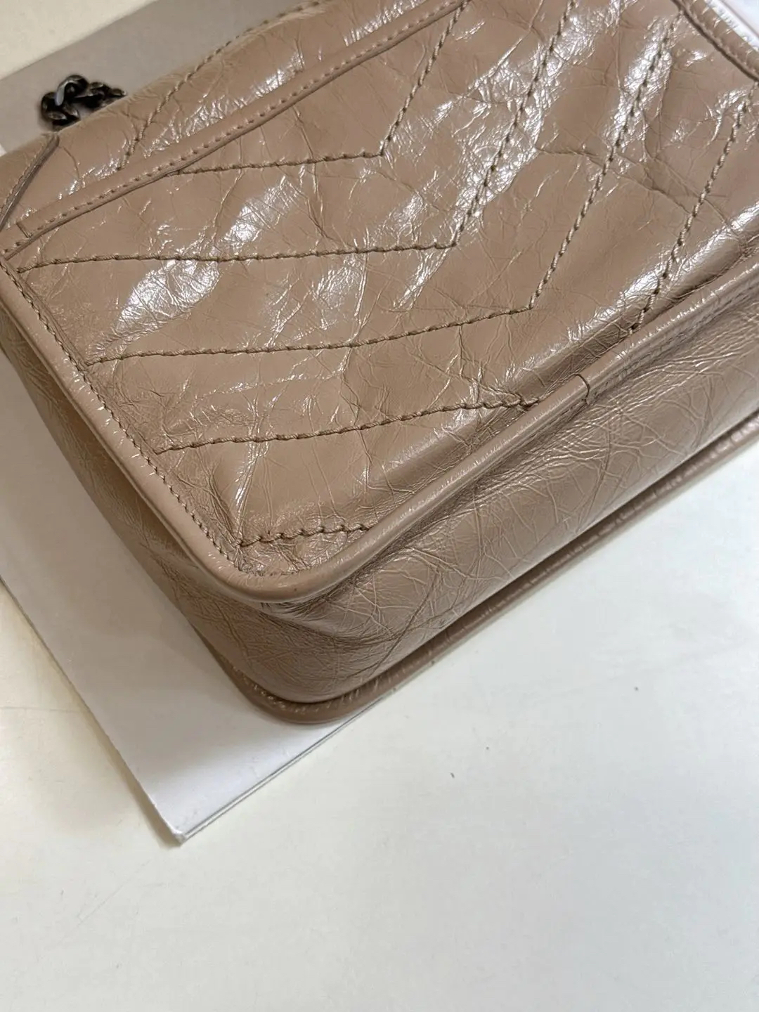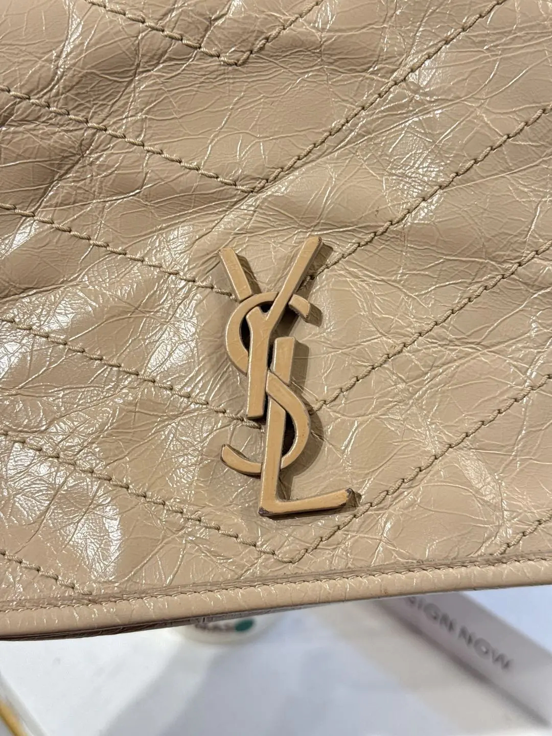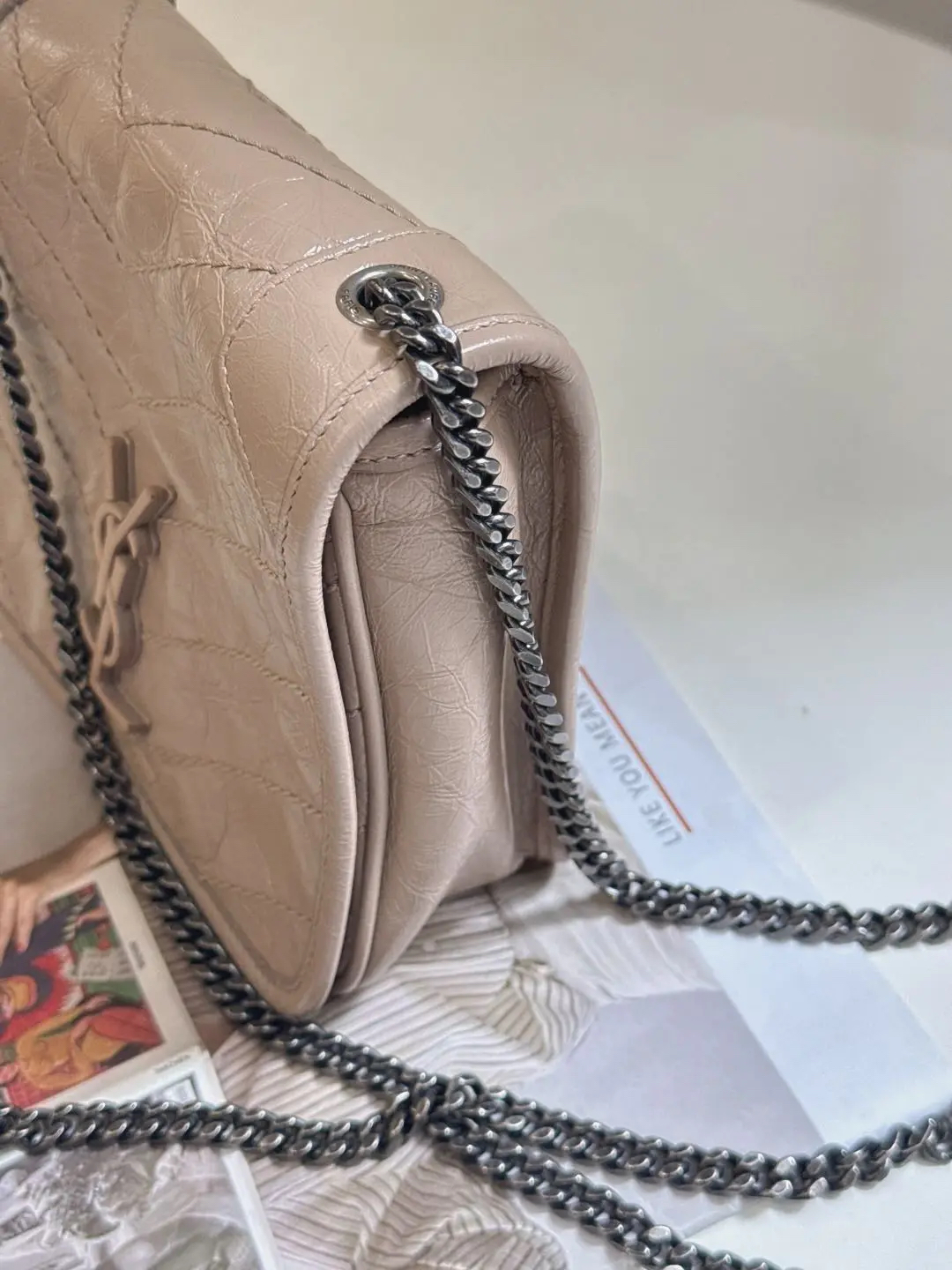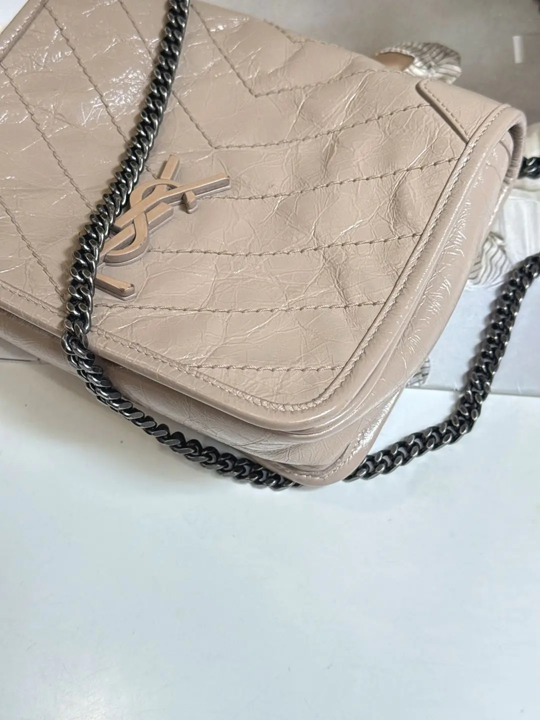 【商品详情】正品二手 YSL Niki mini 奶茶色 牛皮 翻盖包🍬95新 18x16。logo边角正常使用感。慵懒又时尚 可盐又可甜💗