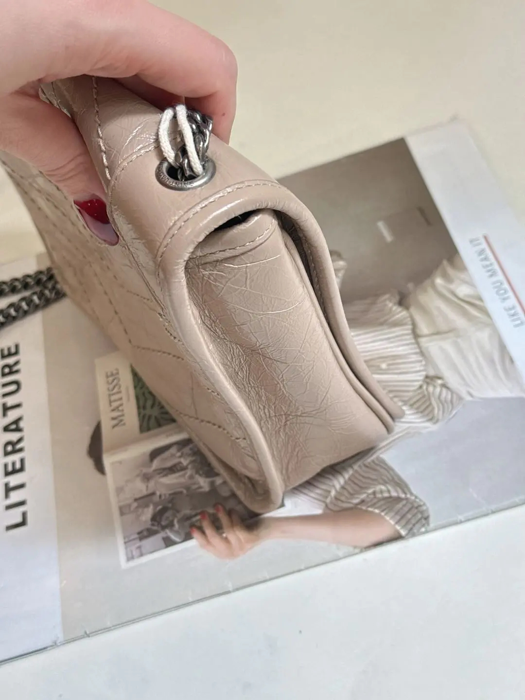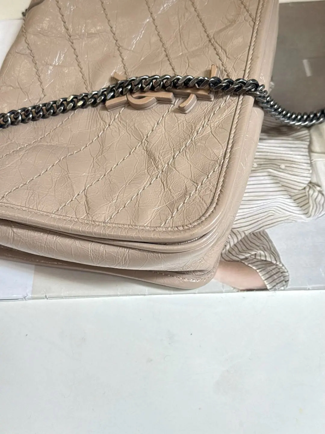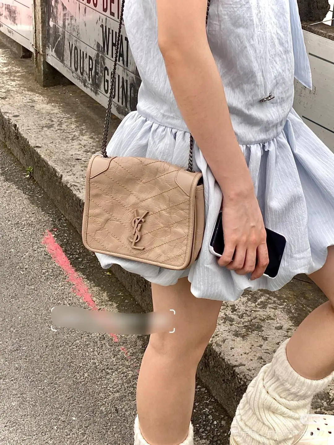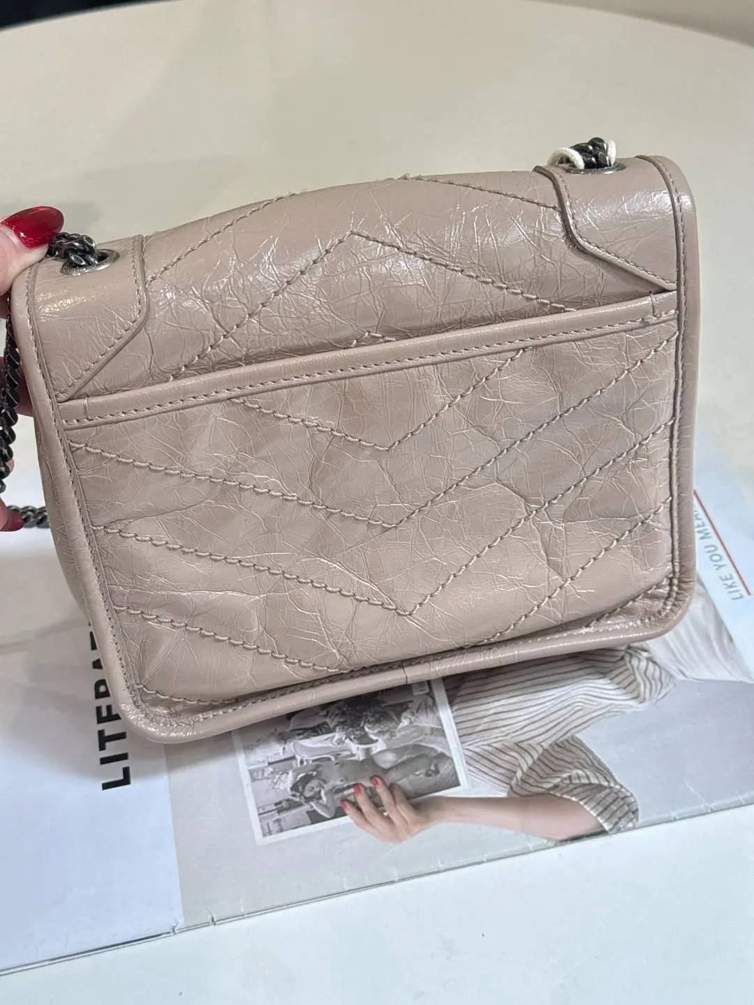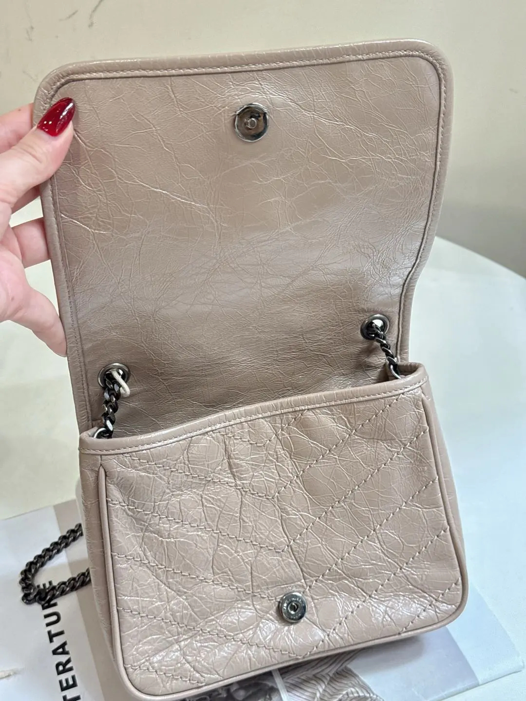 【商品详情】正品二手 YSL Niki mini 奶茶色 牛皮 翻盖包🍬95新 18x16。logo边角正常使用感。慵懒又时尚 可盐又可甜💗