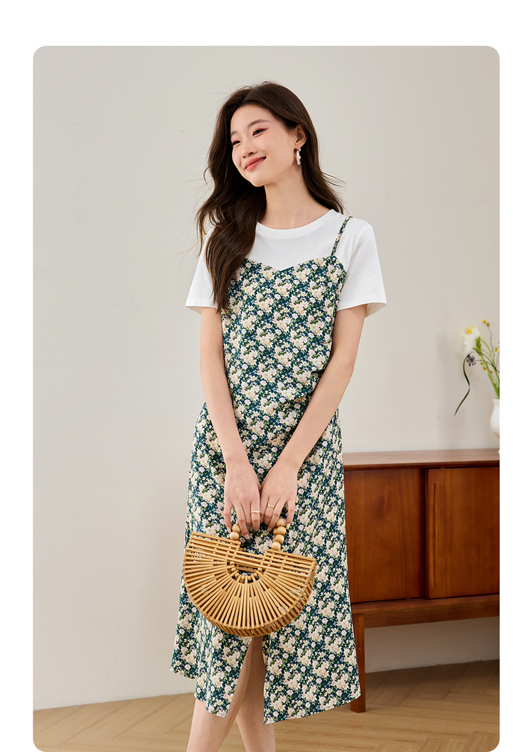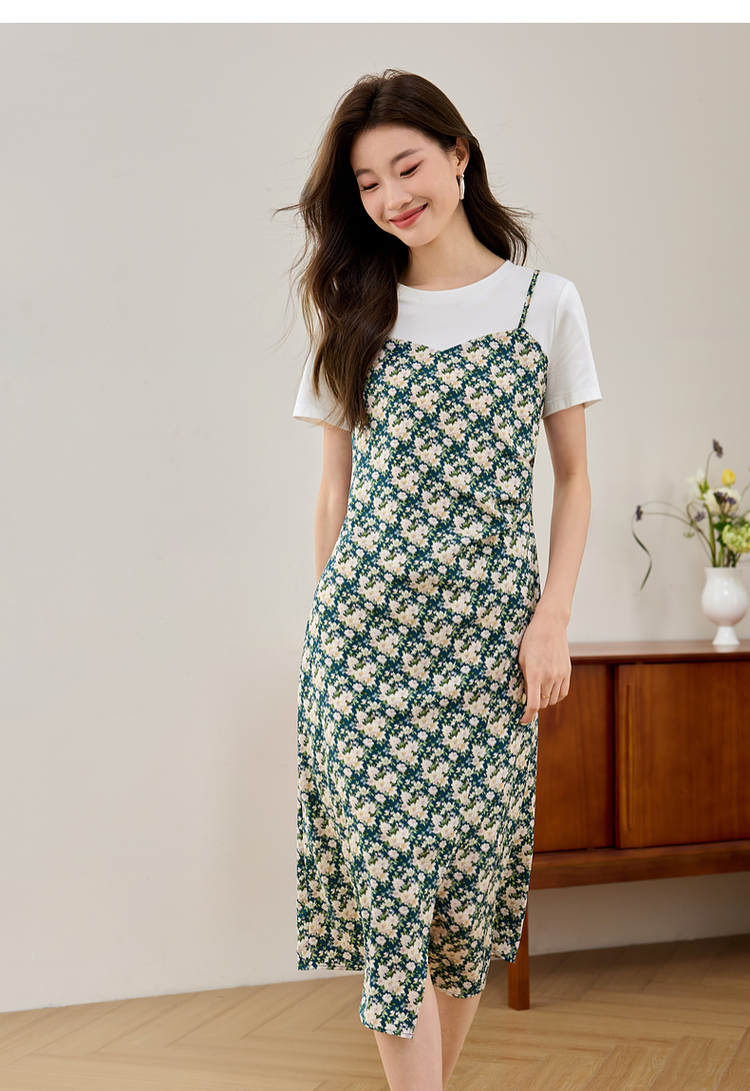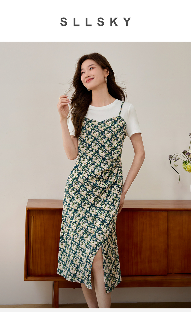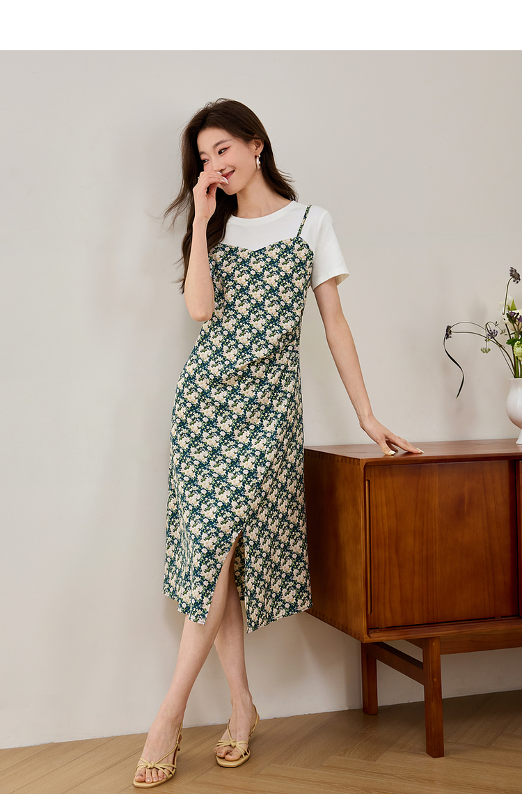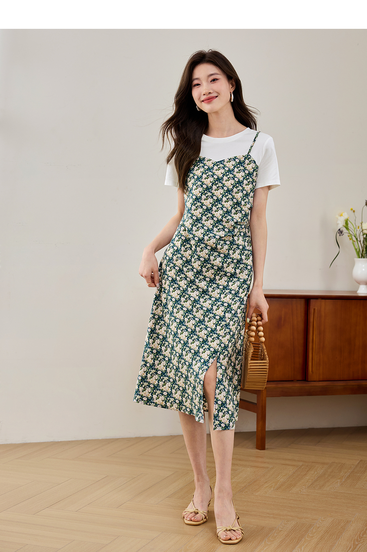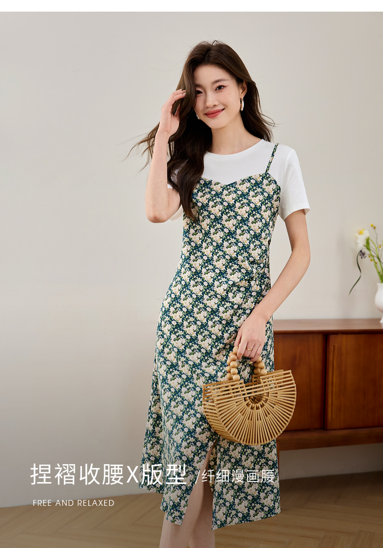 【专属特价】熙世界气质开叉碎花连衣裙2025夏天新款修身显瘦假两件吊带裙子
