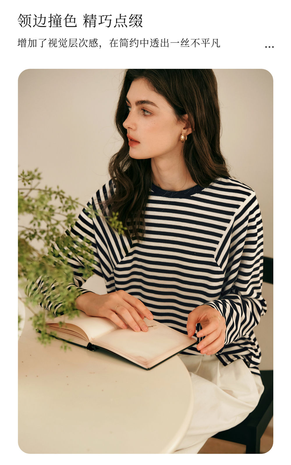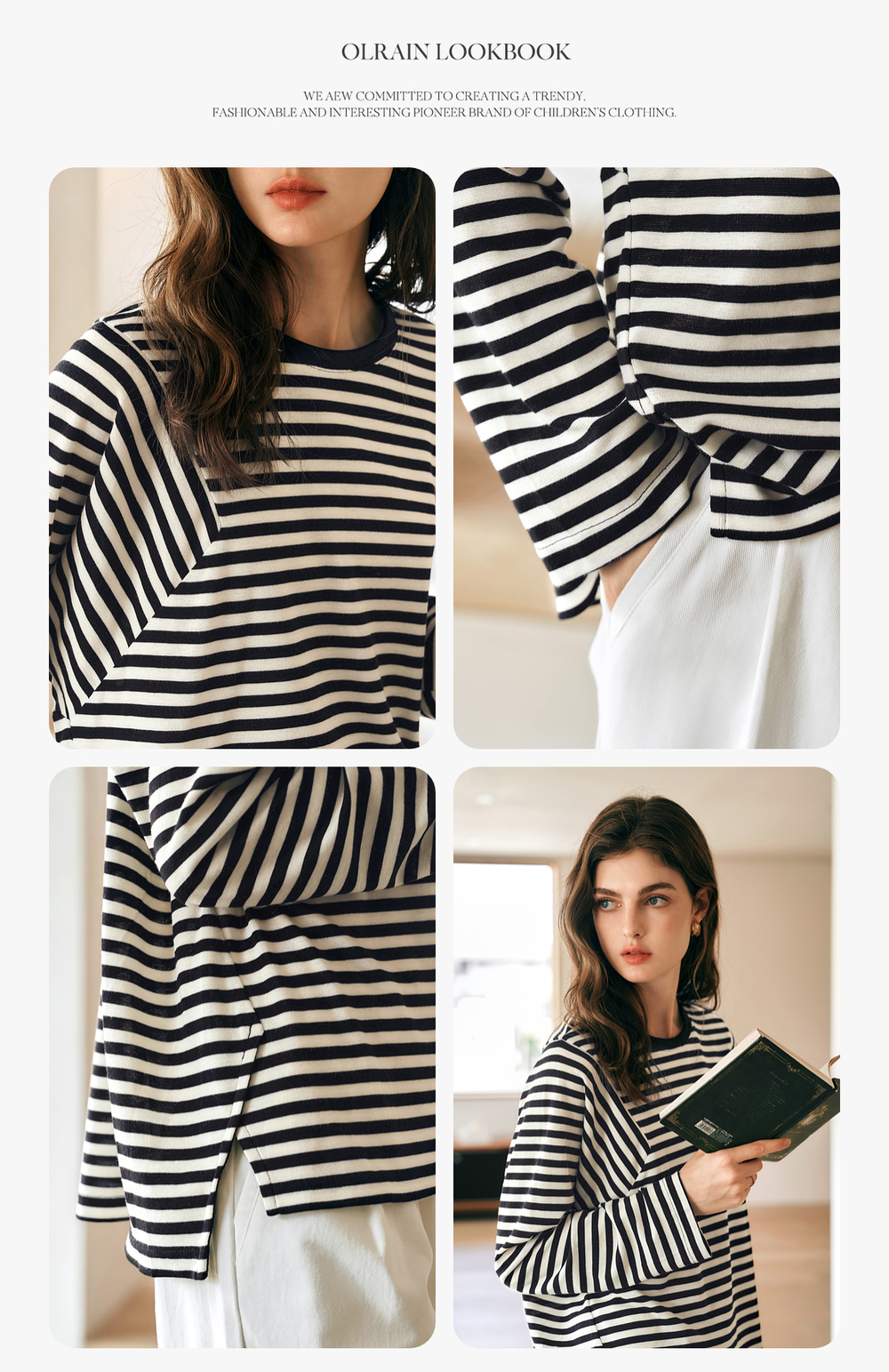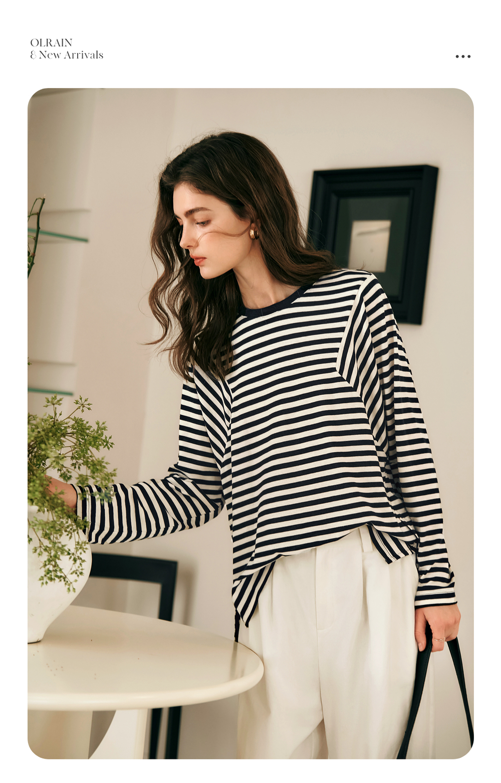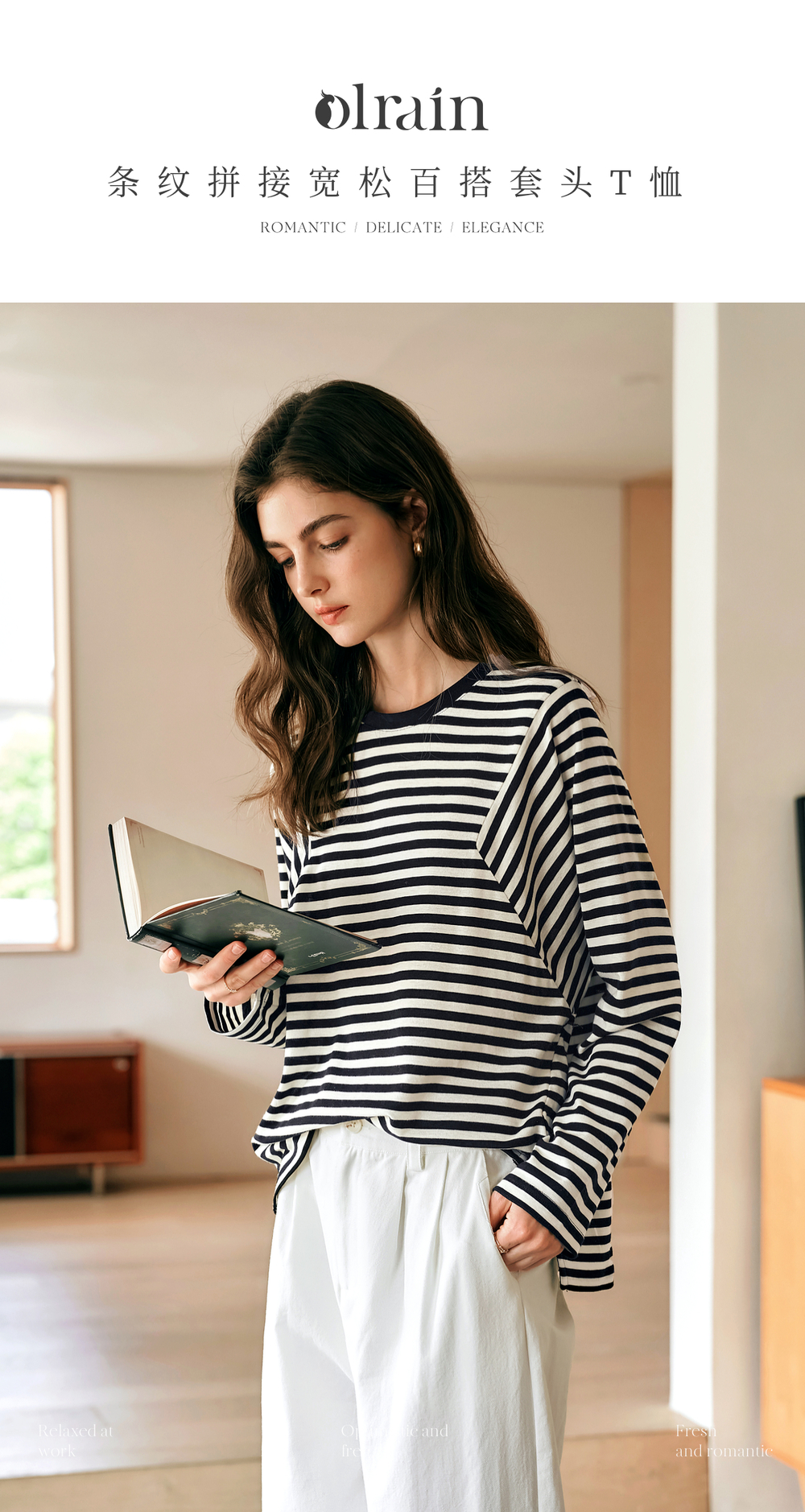 OLrain欧芮儿黑白条纹T恤女冬季2024年新款百搭休闲长袖套头衫