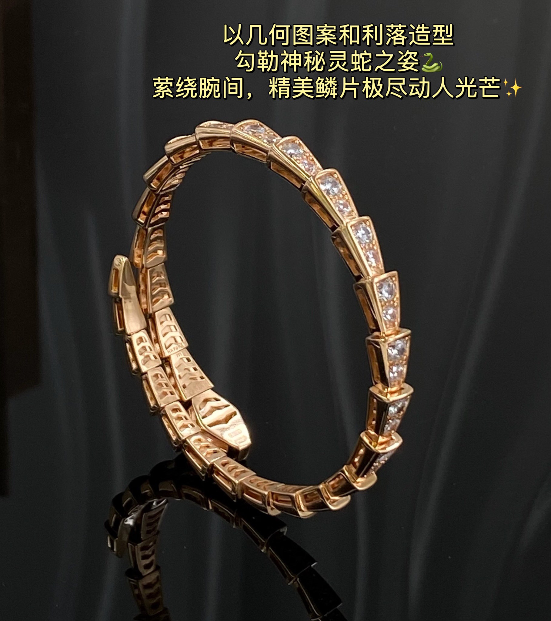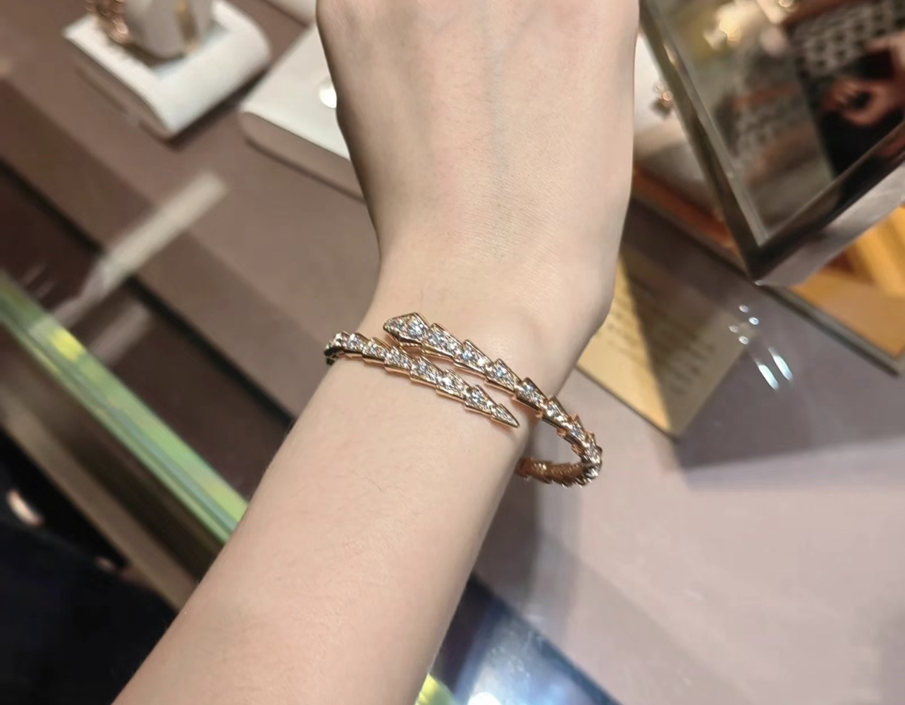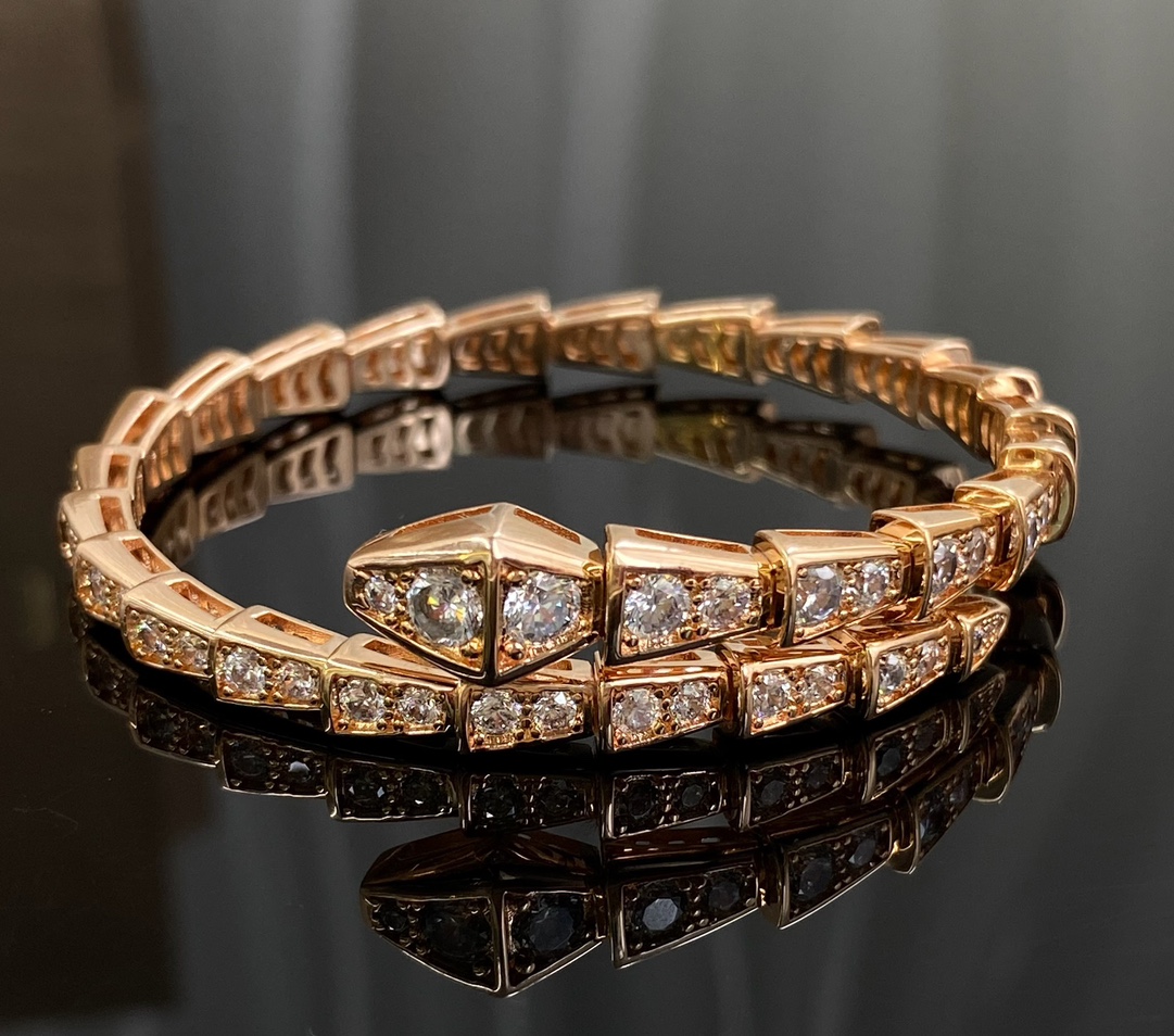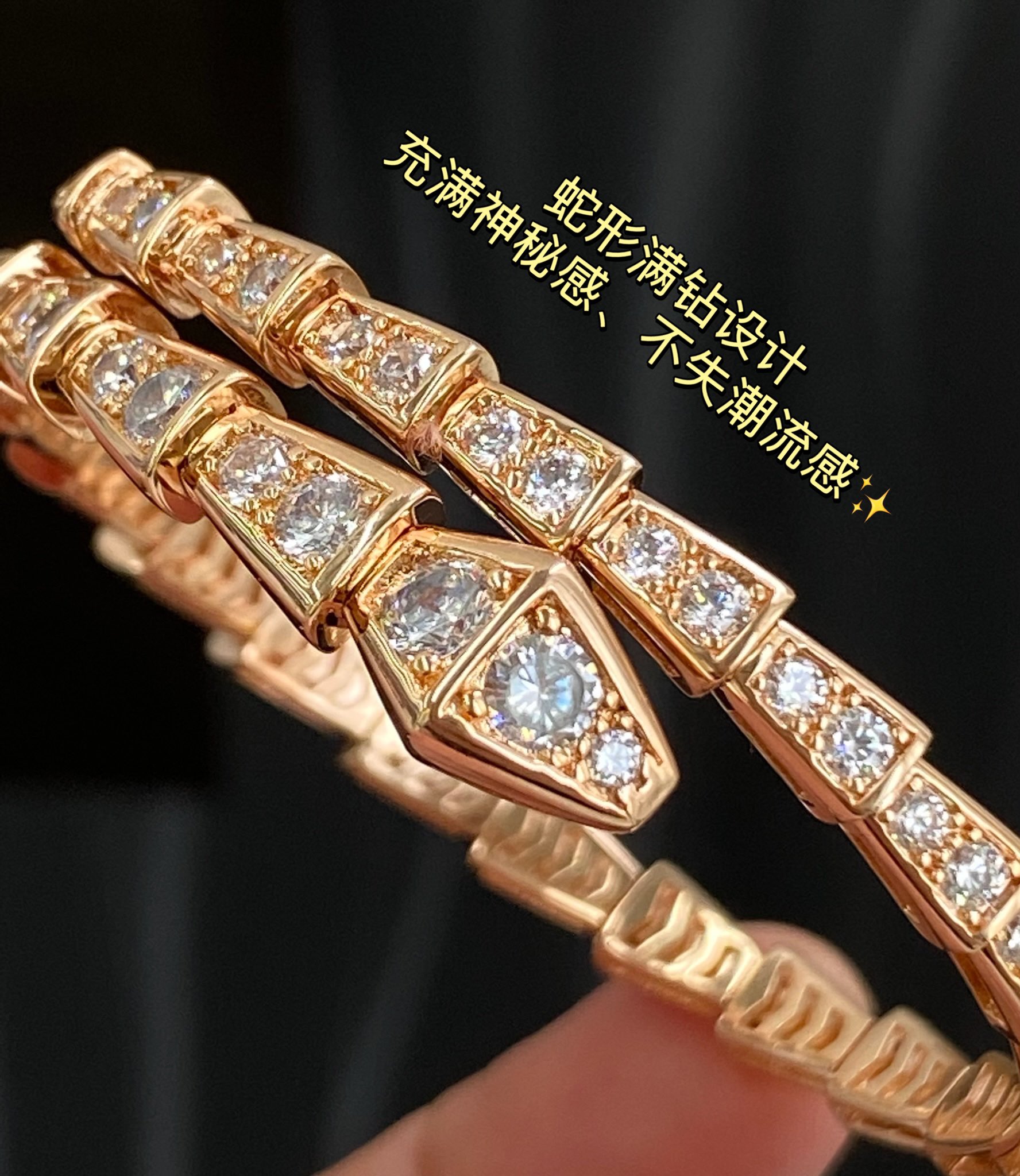 独家对版CNC数控精雕 精工高定 宝格丽BVLGARI SERPENTI系列 蛇形满钻手镯 玫瑰金显温柔显肤色、上手很显手细,又显气质✅单戴叠戴都好看,最重要的是很闪✨