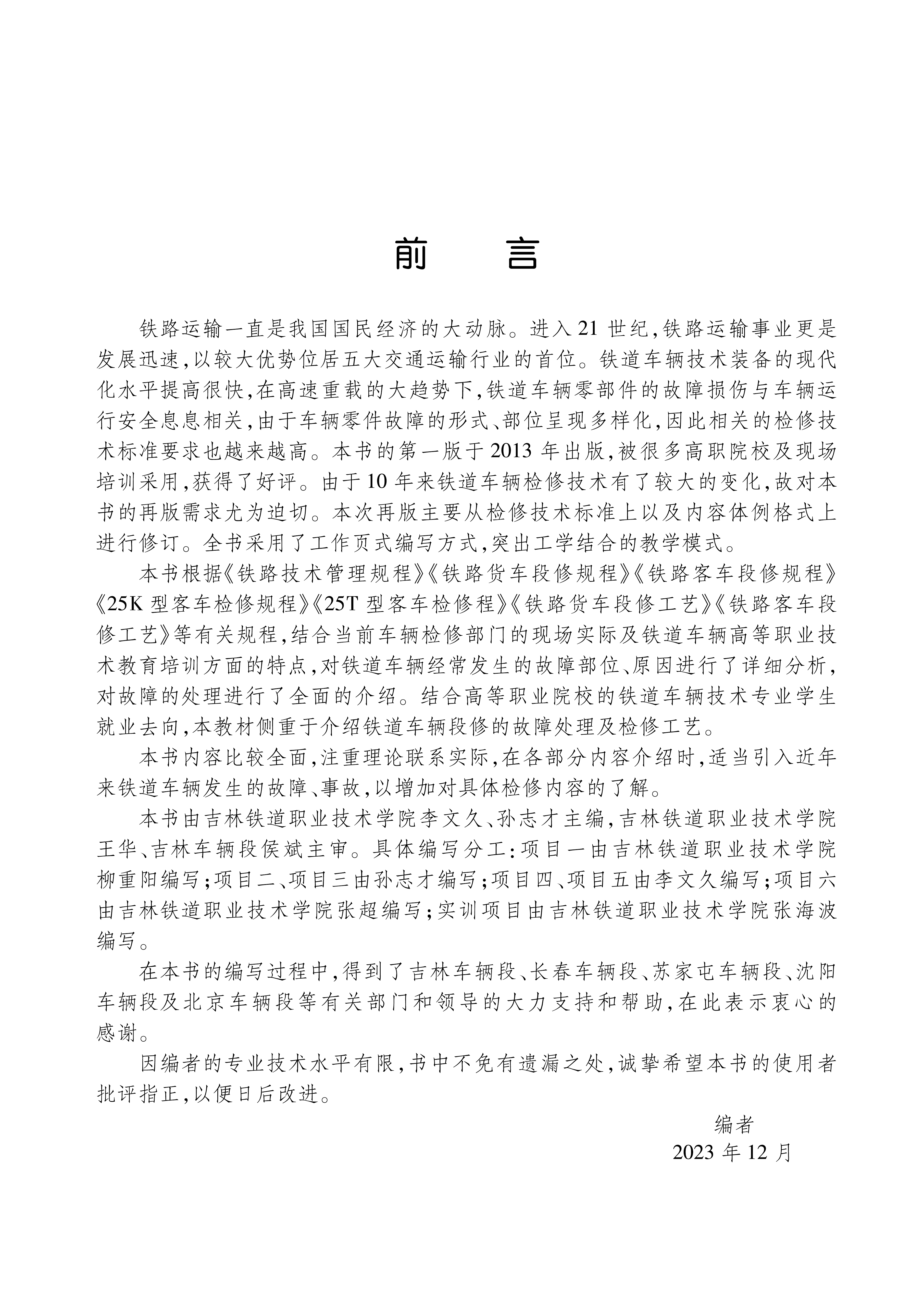 本书可作为高等职业院校铁道车辆技术专业教材,也可作为车辆部门职工培训、从事车辆检修的技术人员学习参考书。