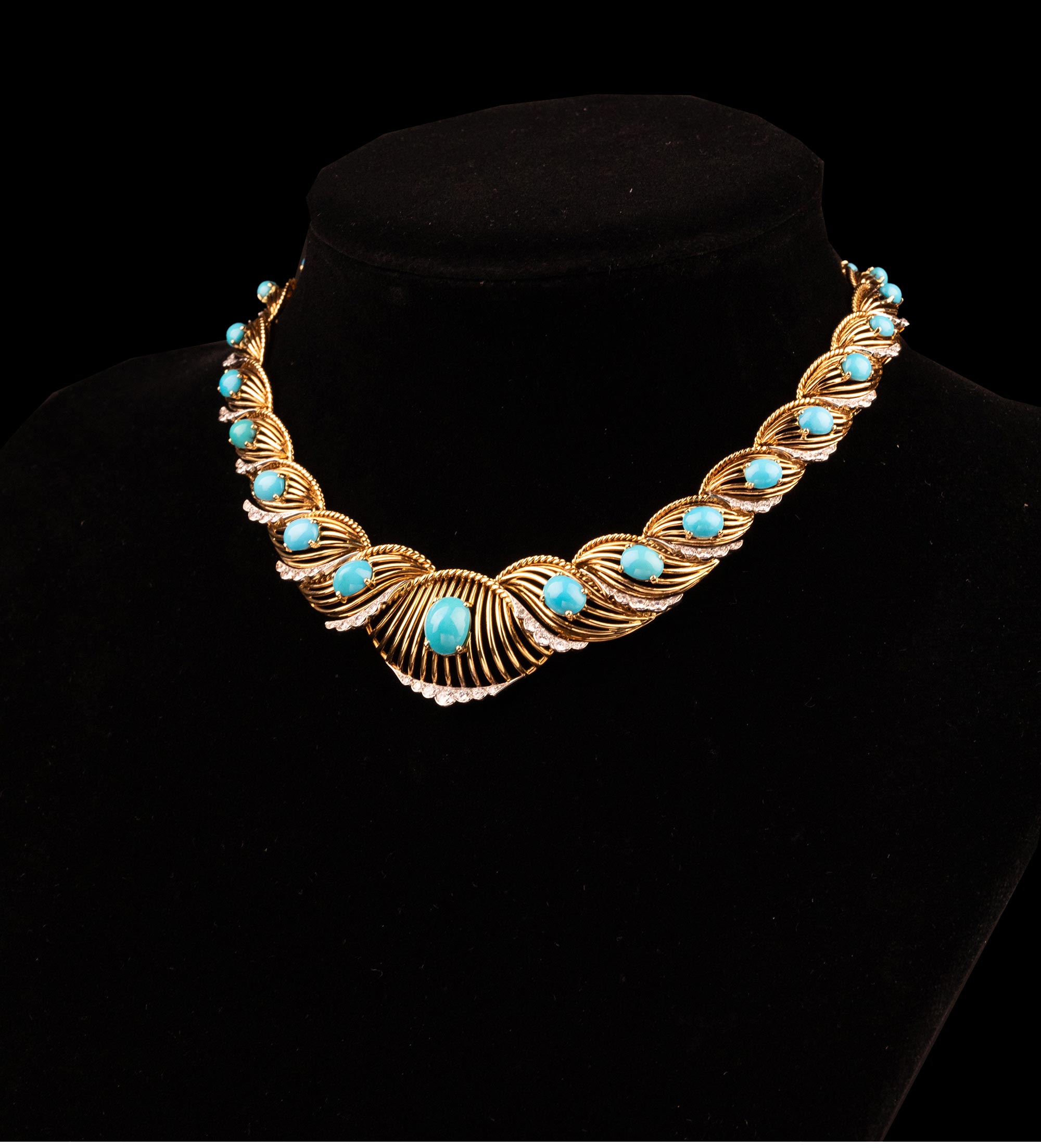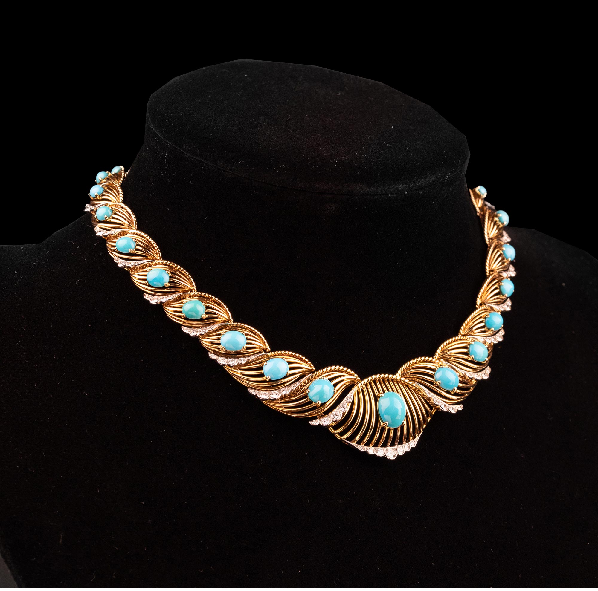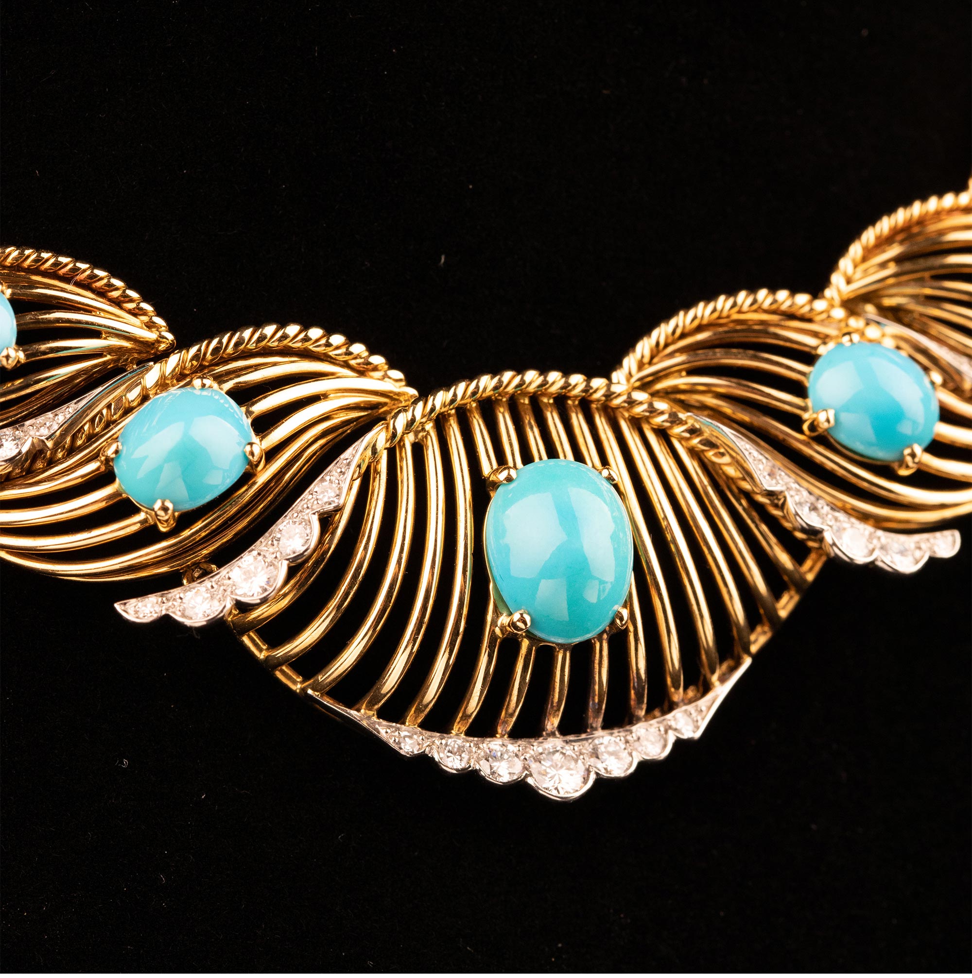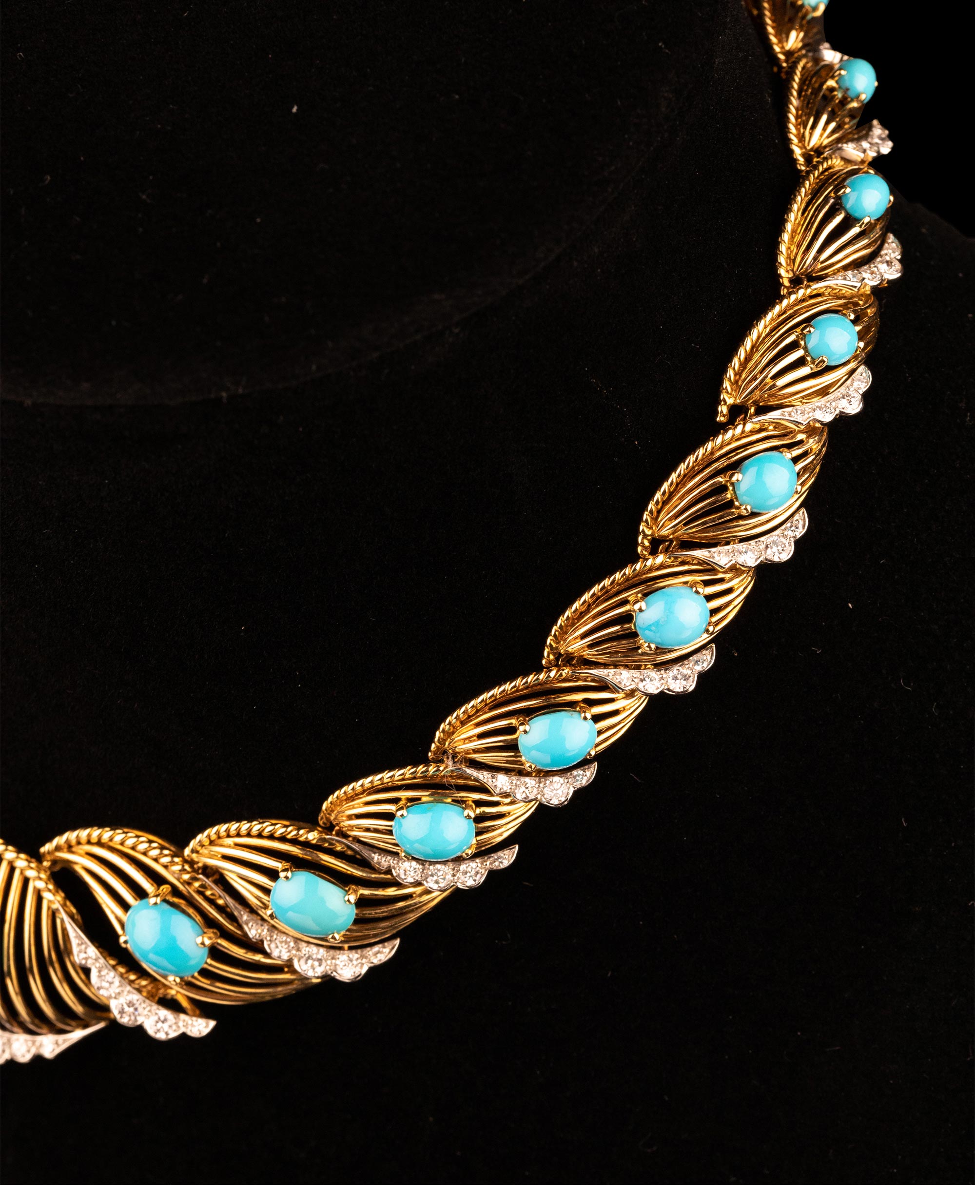 20世纪法国珠宝品牌出品编织纽纹造型18K黄金白金镶嵌钻石及绿松石项链