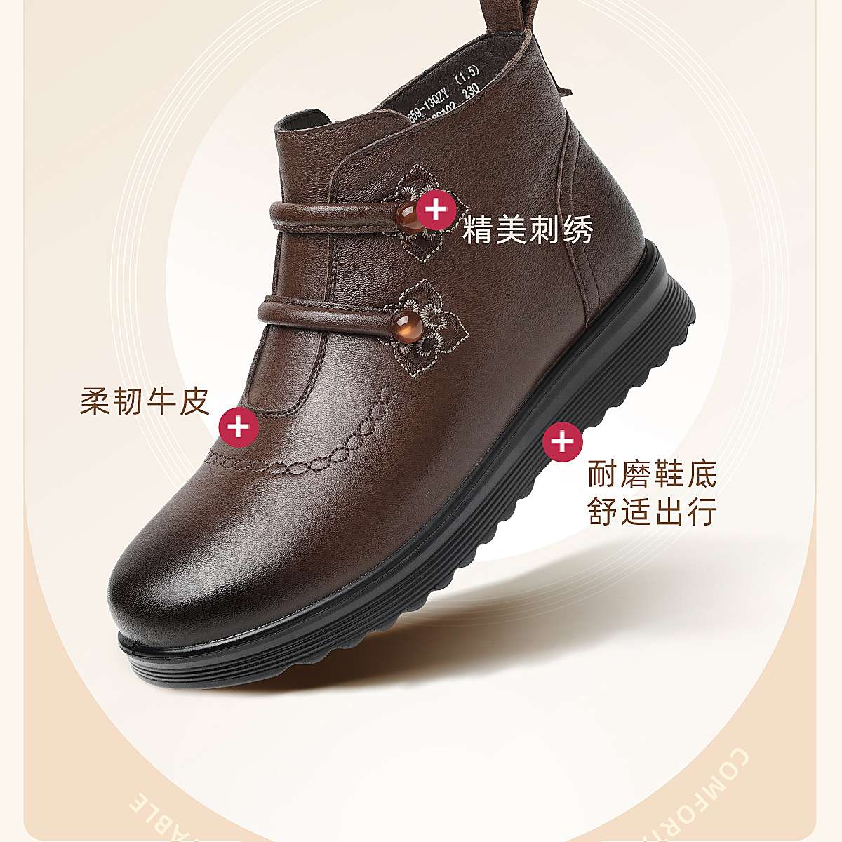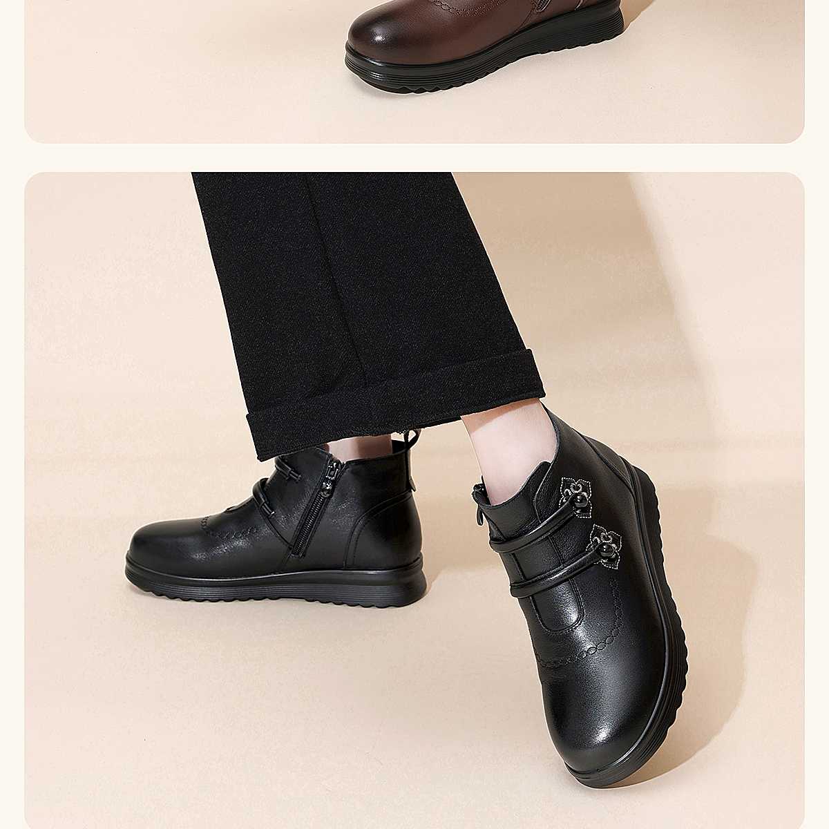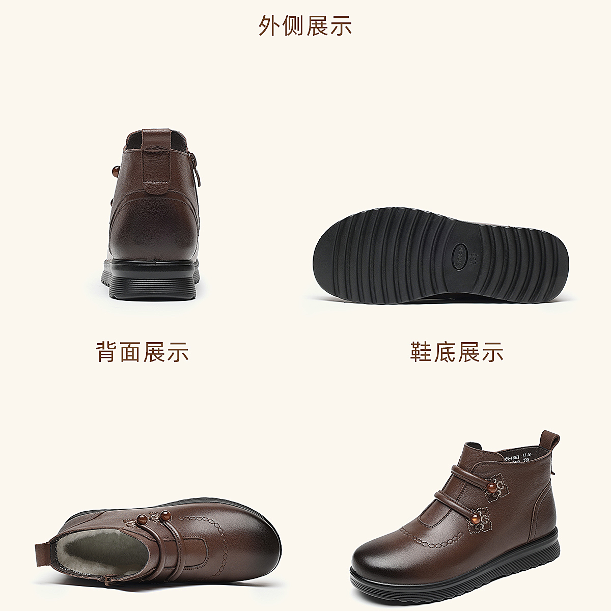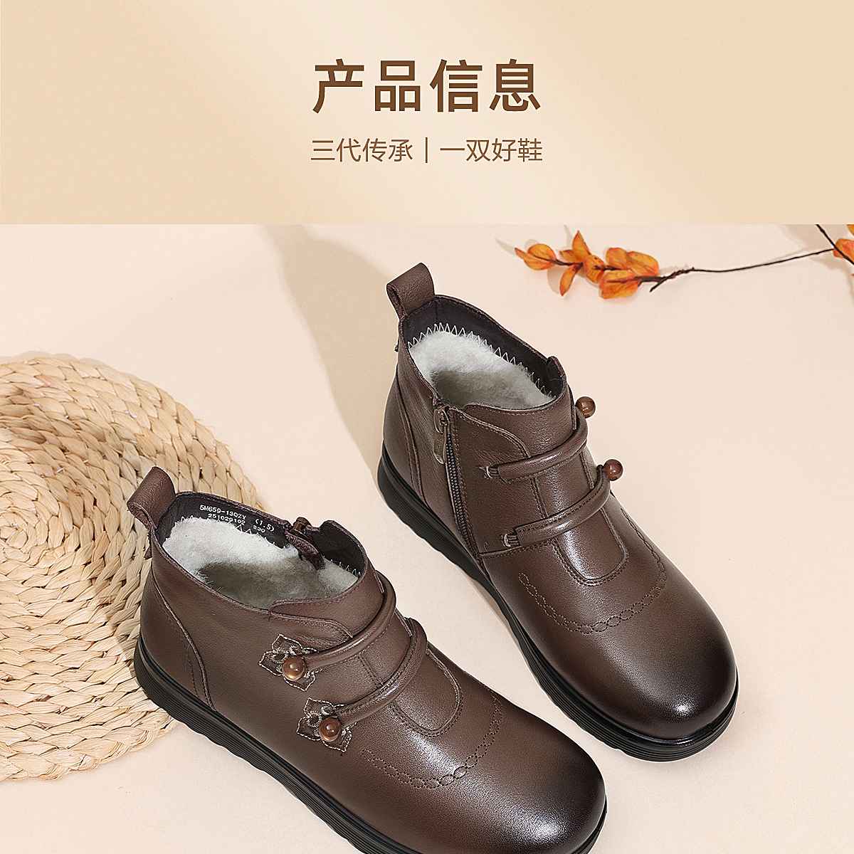 信诺真皮妈妈鞋加绒短靴女平底软底舒适皮鞋羊毛棉鞋2025冬季新款5M659-13QZY