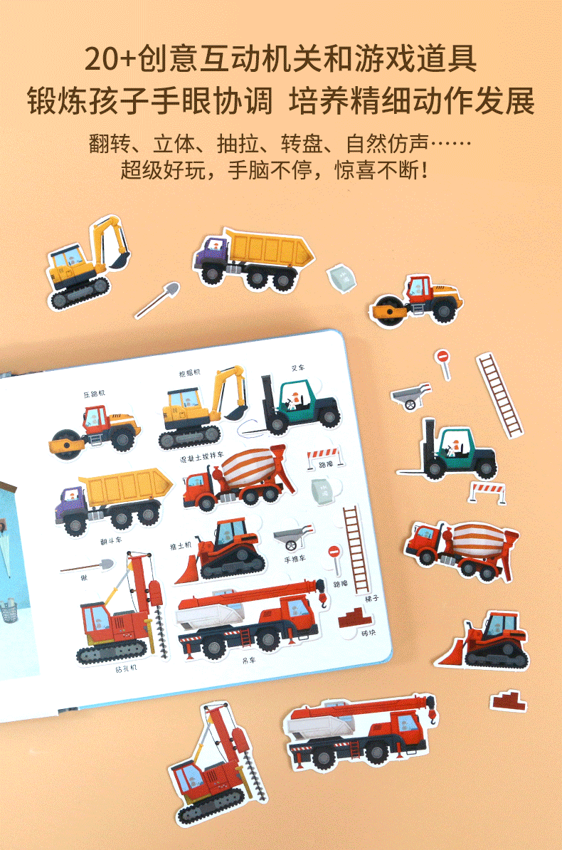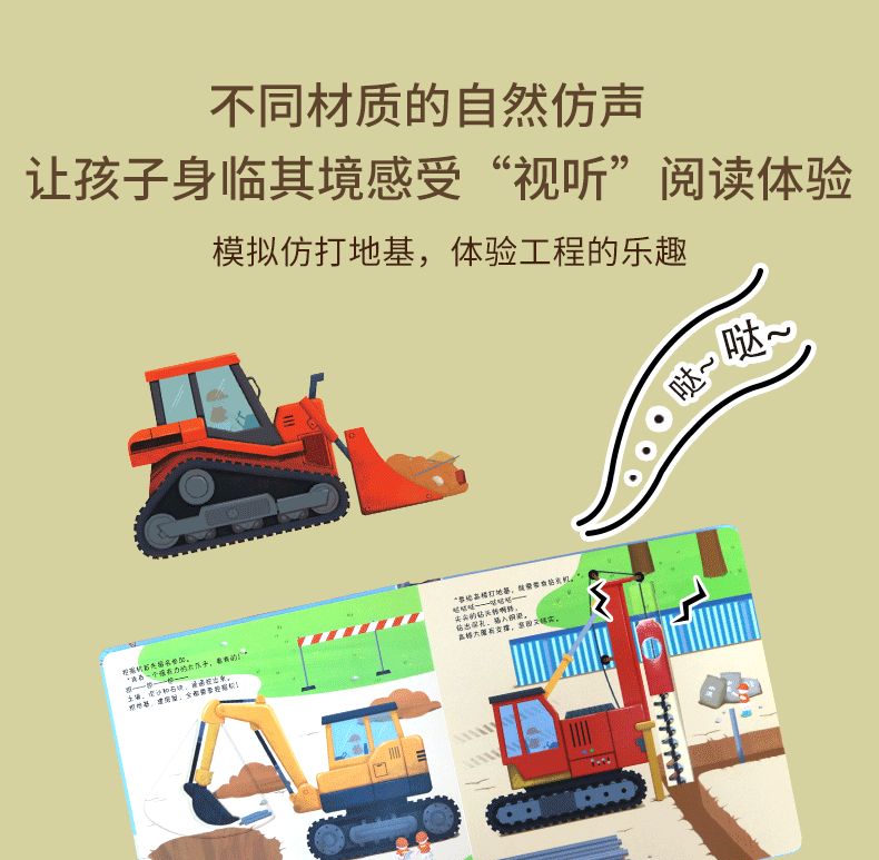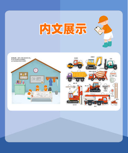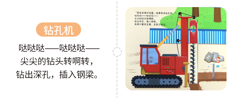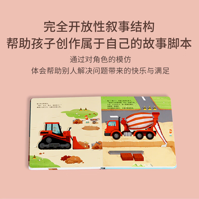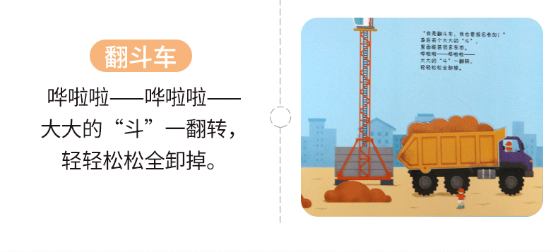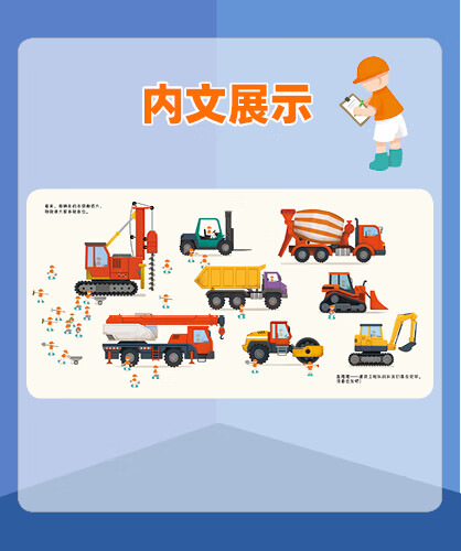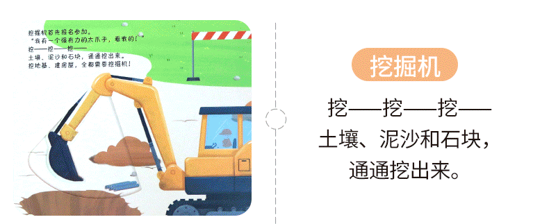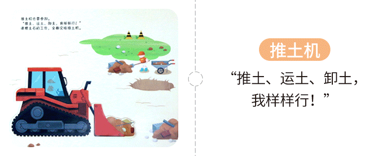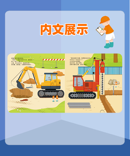书中设计了多种小机关,还有有趣的自然仿声设计,让孩子通过抽拉、推动、翻转等“操作”各类工程车,亲自参与到工程建设中,熟悉和了解工程车。滑一滑,帮助挖掘机用强有力的大爪子挖挖挖,挖出土壤、泥沙和石块;转一转,帮助混凝土搅拌机搅拌混凝土,并且卸下混凝土;推一推,帮助钻孔机用尖尖的钻头钻出深孔;拉一拉,帮助压路机用宽又重的大滚轮把马路压平……从了解和熟悉工程车的工作原理和功能中,孩子能体会每辆车都各有所长,要完成一项任务分工、合作的重要性,这也有助于孩子对社会生活的认知,增强其社会性。