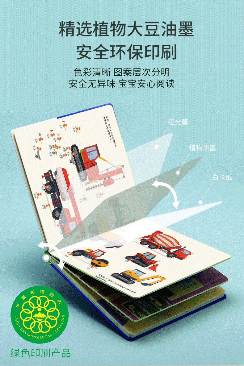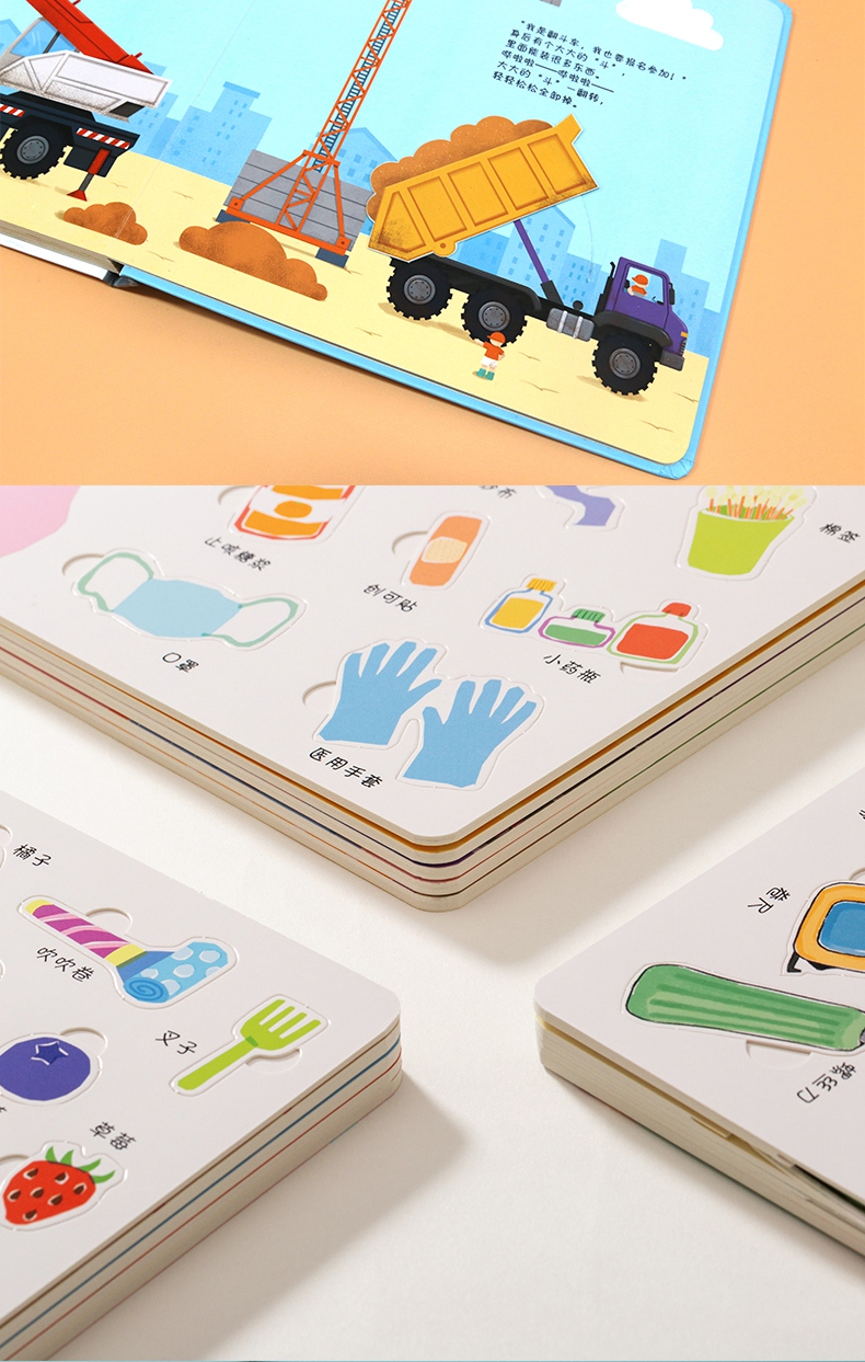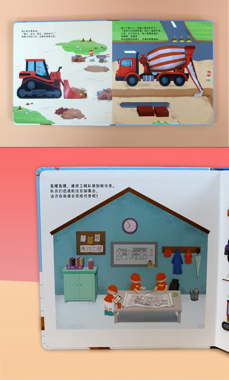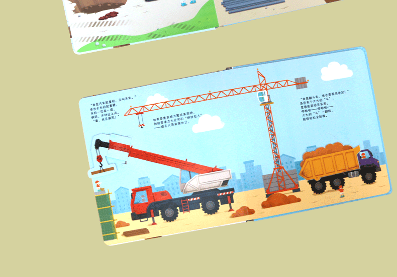书中设计了多种小机关,还有有趣的自然仿声设计,让孩子通过抽拉、推动、翻转等“操作”各类工程车,亲自参与到工程建设中,熟悉和了解工程车。滑一滑,帮助挖掘机用强有力的大爪子挖挖挖,挖出土壤、泥沙和石块;转一转,帮助混凝土搅拌机搅拌混凝土,并且卸下混凝土;推一推,帮助钻孔机用尖尖的钻头钻出深孔;拉一拉,帮助压路机用宽又重的大滚轮把马路压平……从了解和熟悉工程车的工作原理和功能中,孩子能体会每辆车都各有所长,要完成一项任务分工、合作的重要性,这也有助于孩子对社会生活的认知,增强其社会性。