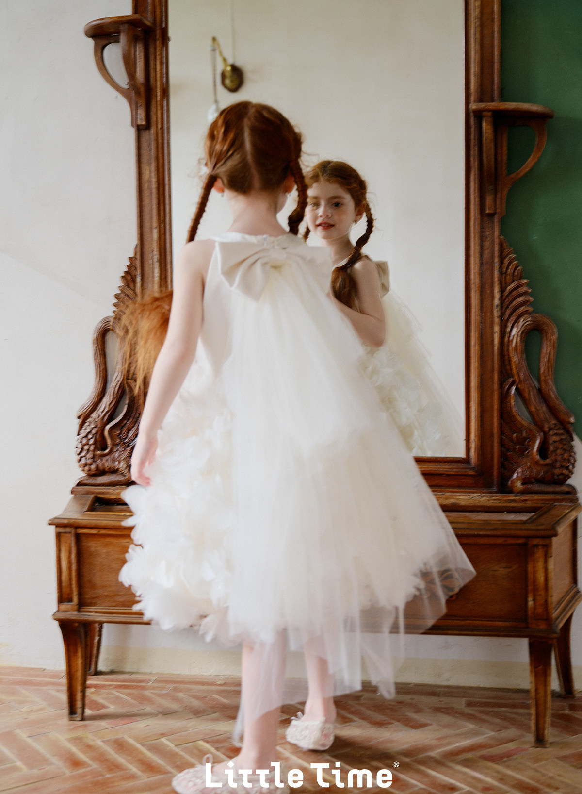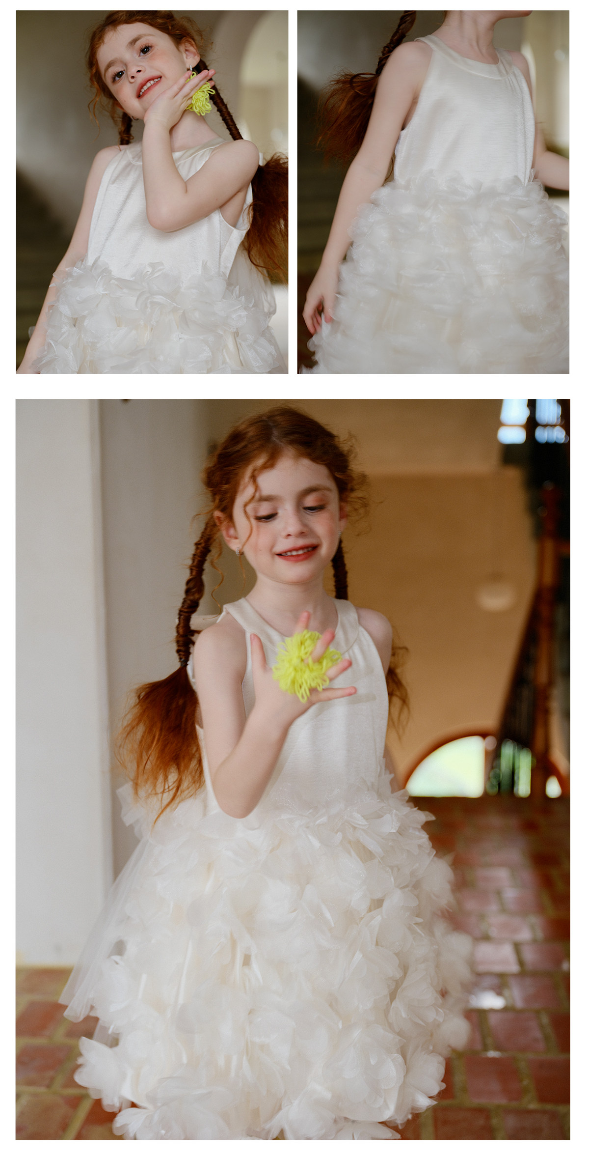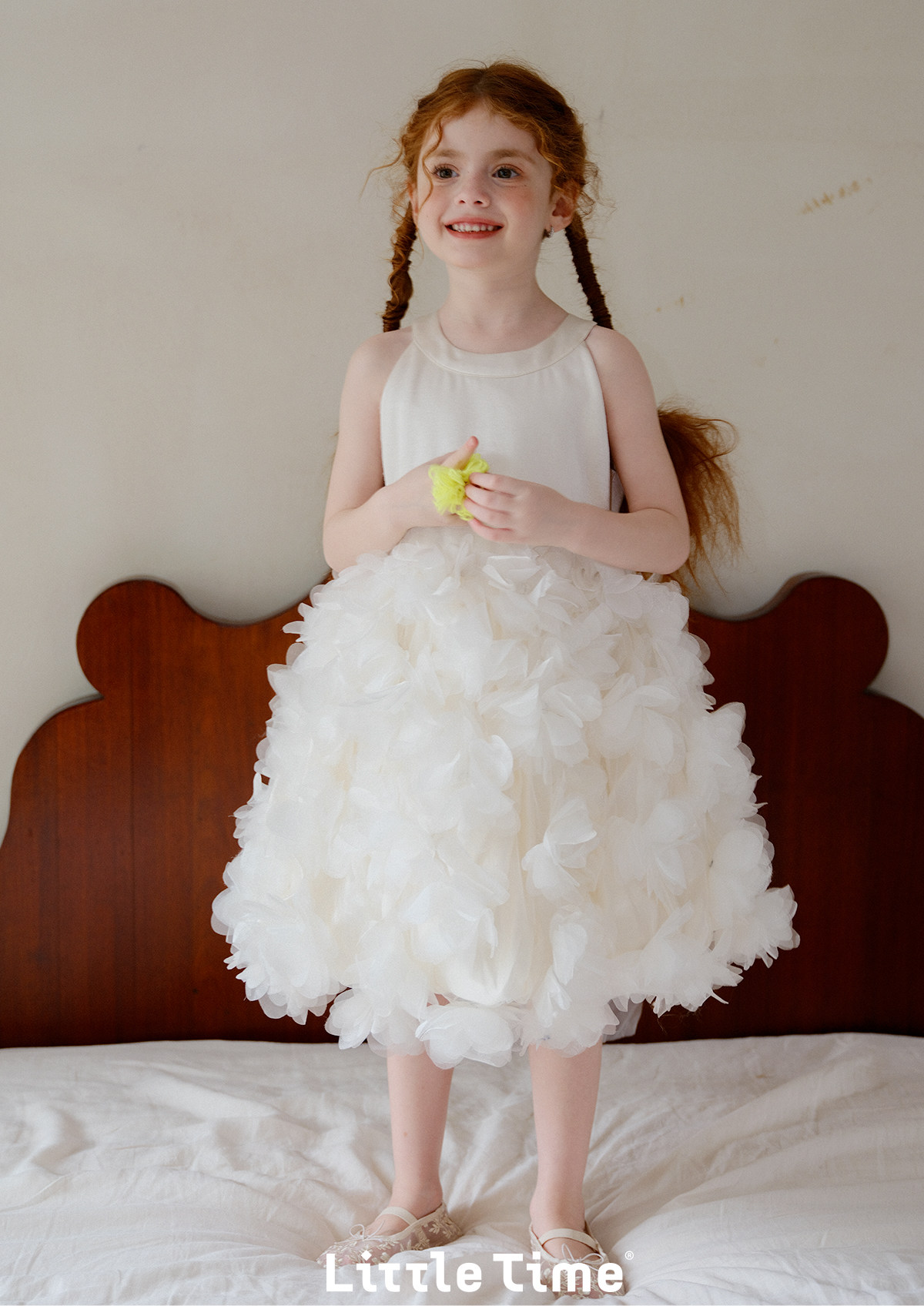 littletime26春夏女童公主婚纱挂脖网纱连衣裙白色立体花朵蛋糕裙