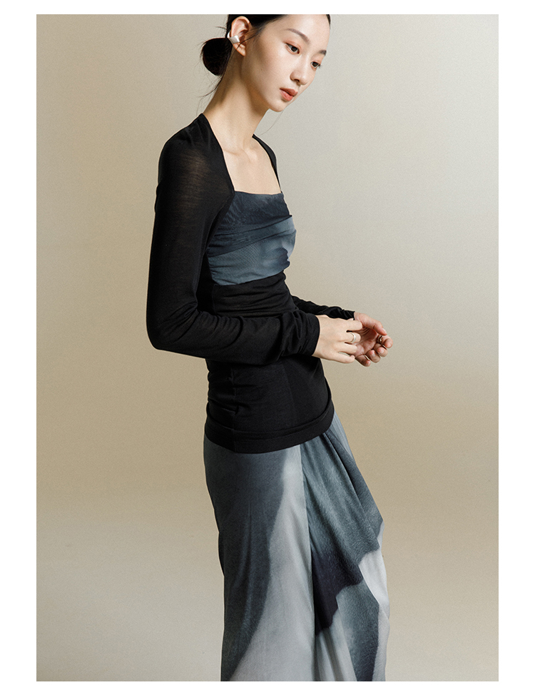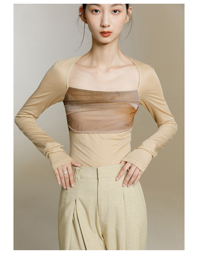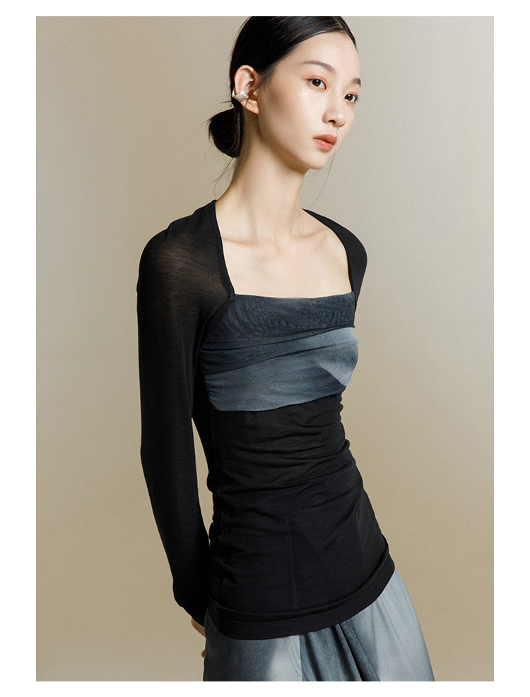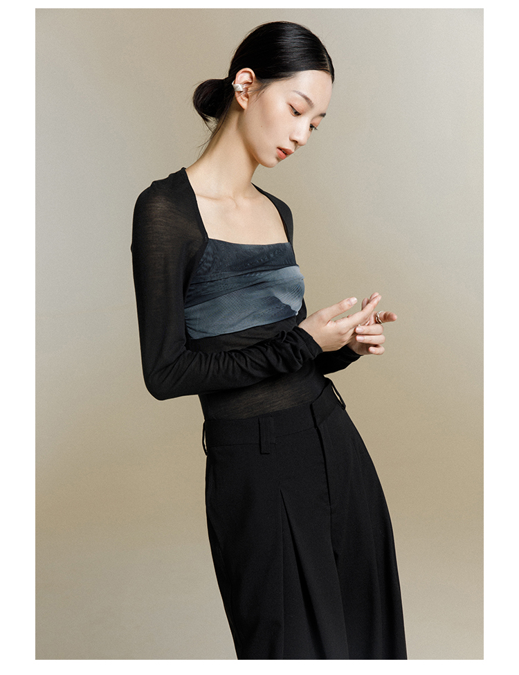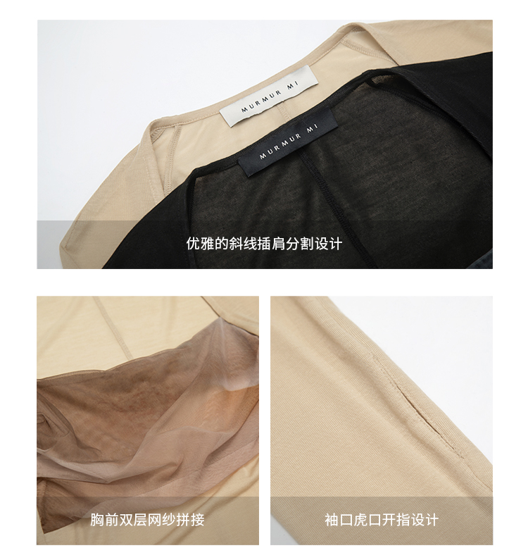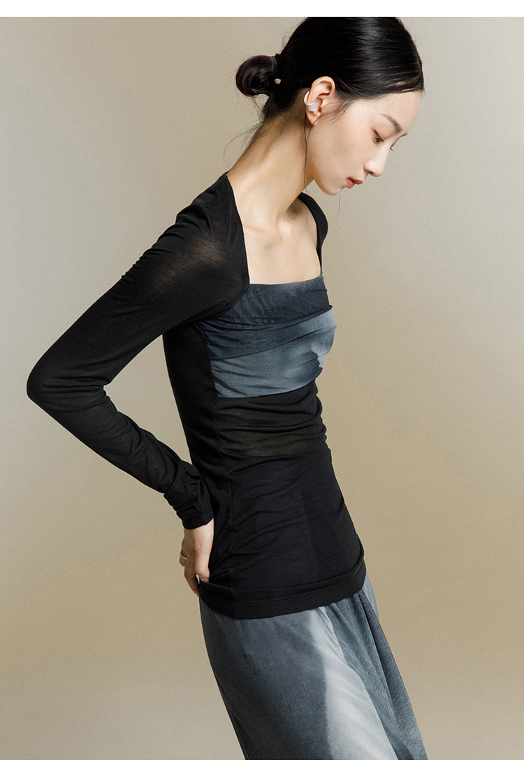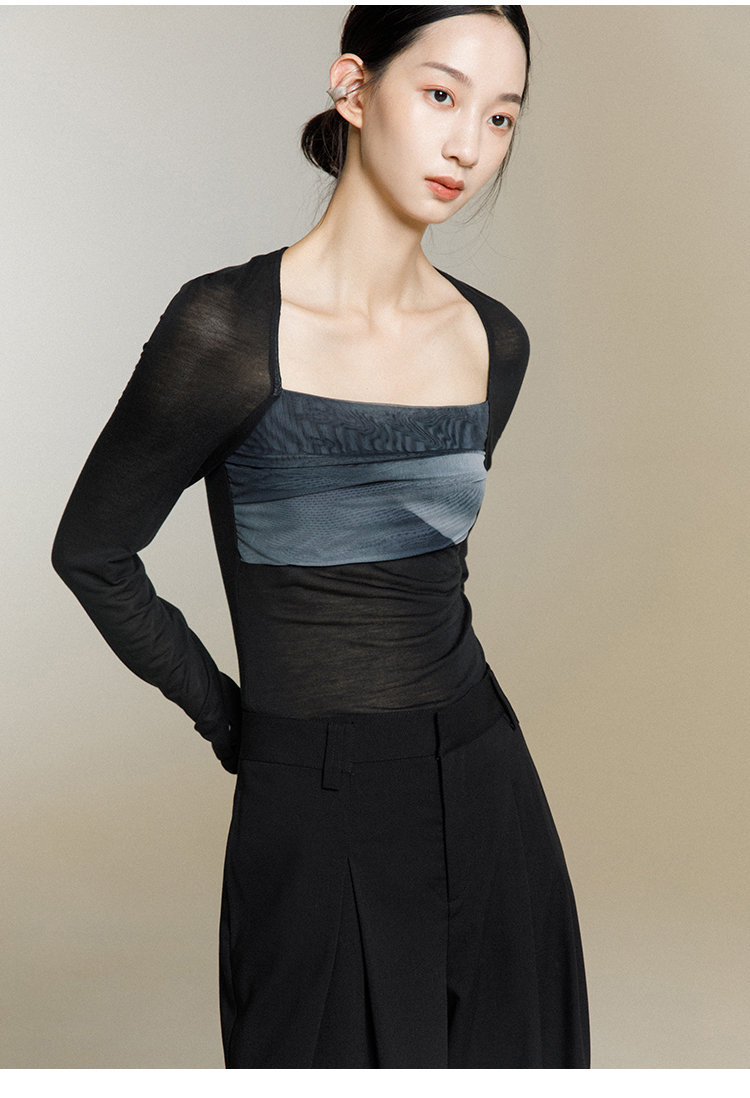 MURMURMI/MT166/印花拼接方领T恤 女初秋长袖上衣