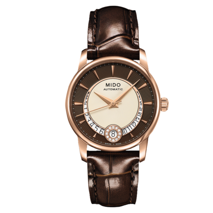 镜面 材质 | 蓝宝石水晶玻璃 | 表盘 | PVD镀金表壳 棕色表盘,镶嵌12颗钻石(0.025克拉) 大三针 日期显示 透底 |