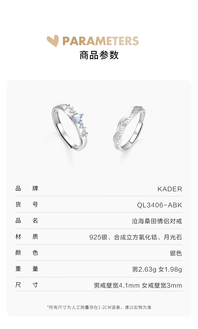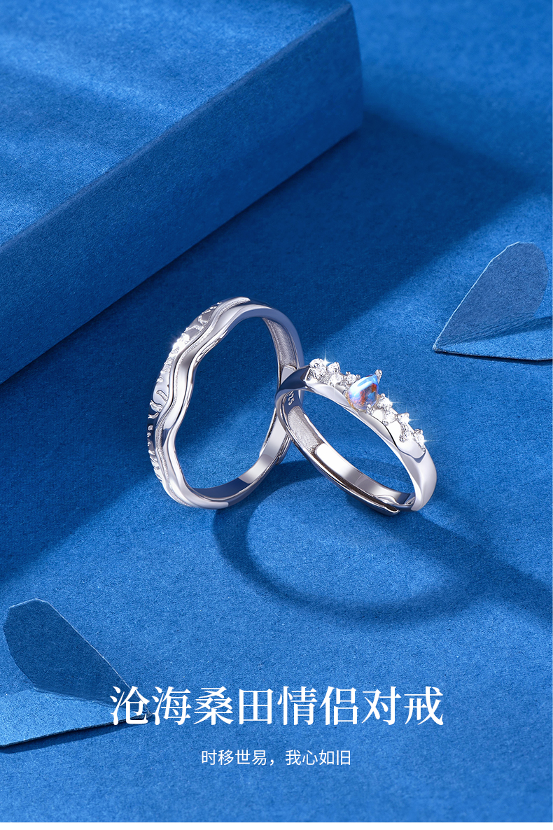 卡蒂罗/KADER 在逃公主系列 沧海桑田情侣对戒 925银浪漫永恒山海造型设计开口可调节一对 光年之境钟爱久久为爱加冕