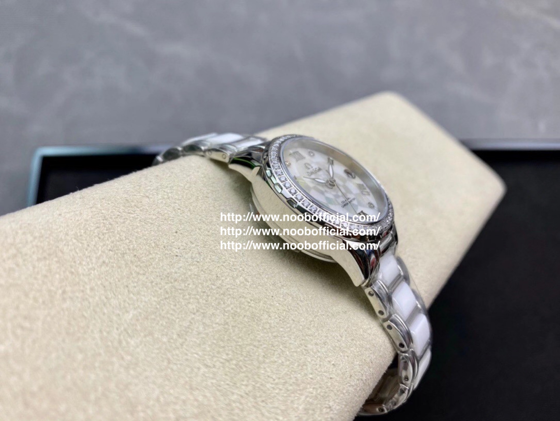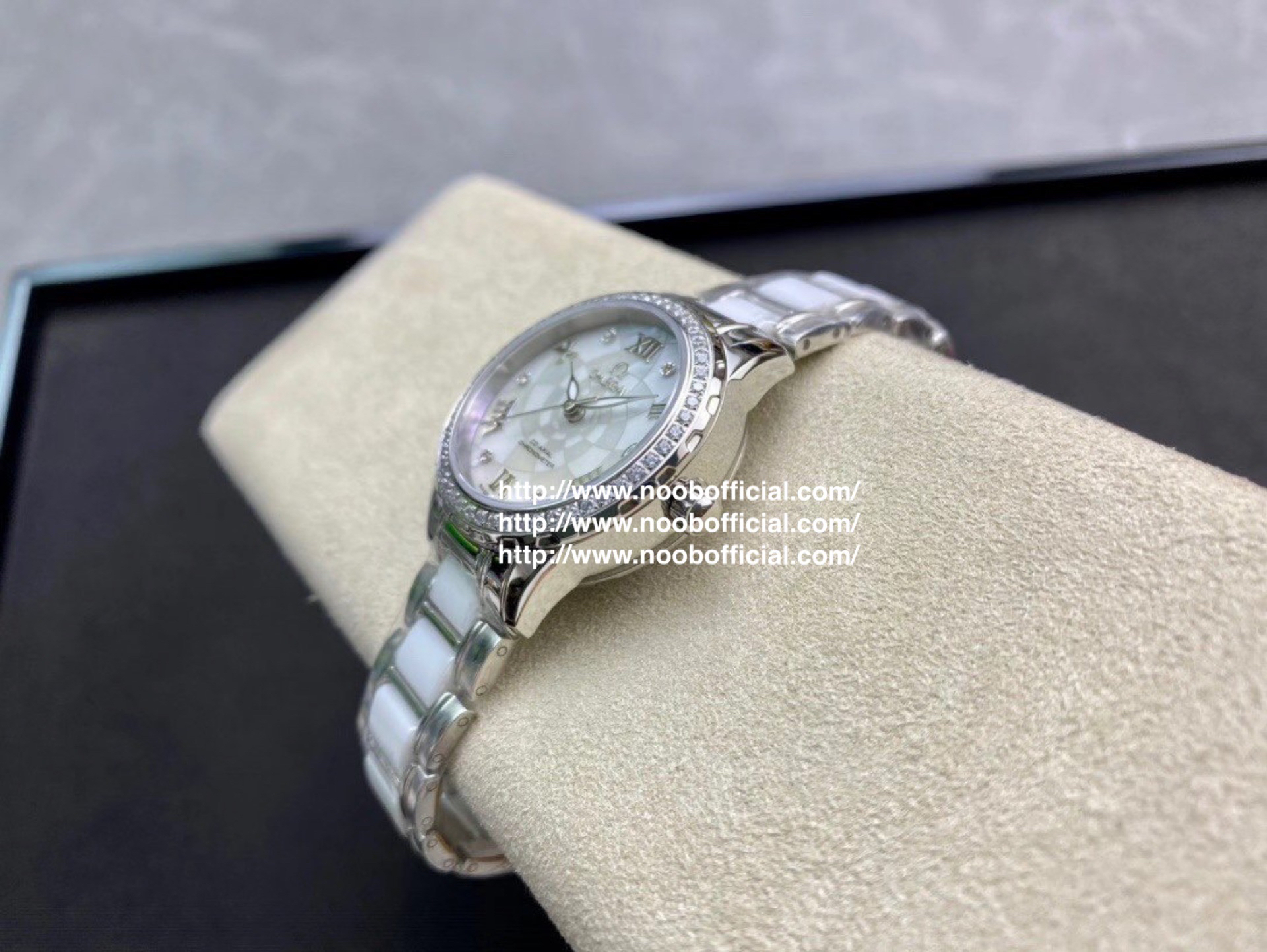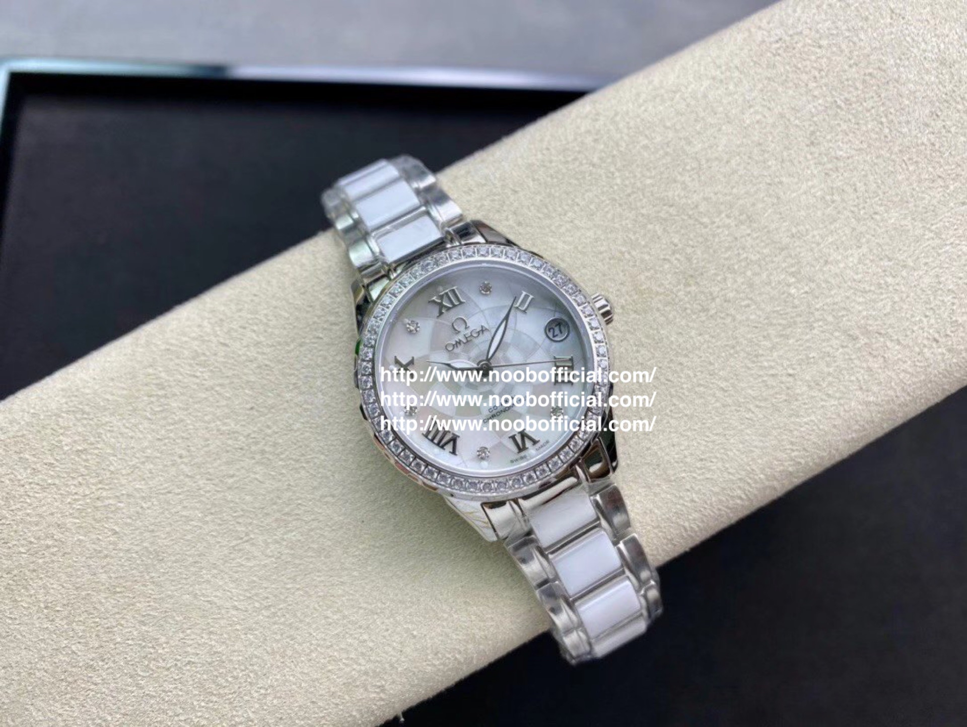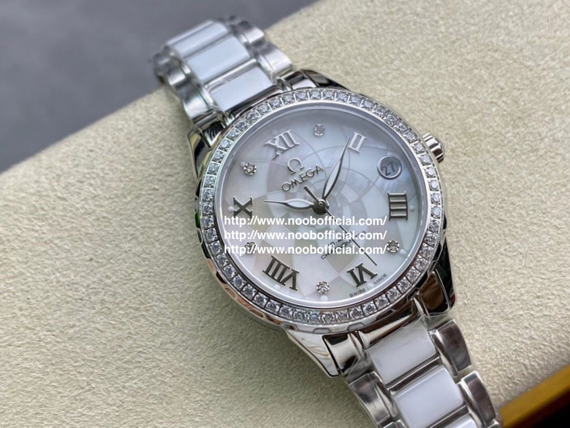 欧米茄 淑女珠宝系列 采用高端珍珠贝母表盘时尚女表 简约三针,夜时超强夜光💕独特3⃣️字位日历💕 搭载原装进口全自动机械机芯(零返修),316L精钢表壳(厚度10mm),壳上采用高品质施华洛世奇水晶钻石💎,镜面9级蓝宝石水晶防刮玻璃,防水深度:50米💦表带:陶瓷钢带,精细打磨,清新优雅,大方得体💃🏻女神必备款💃🏻高品质 送爱人 送闺蜜 五星推荐!!