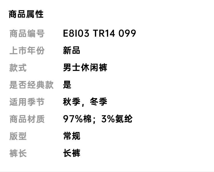 【一】ZEGNA 杰尼亚 男士弹力棉质休闲裤 黑色 E8I03 TR14 099