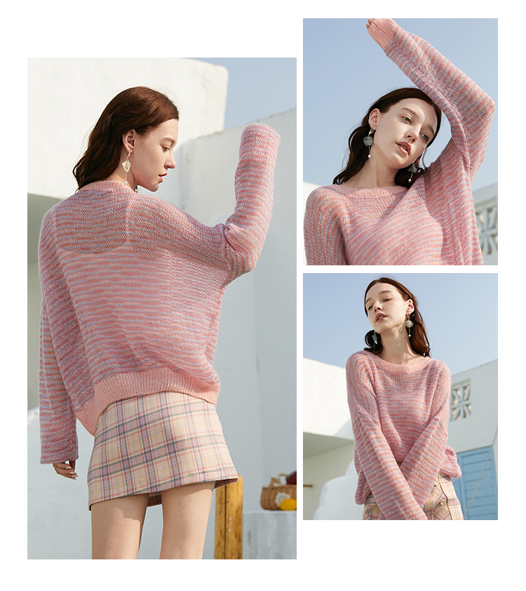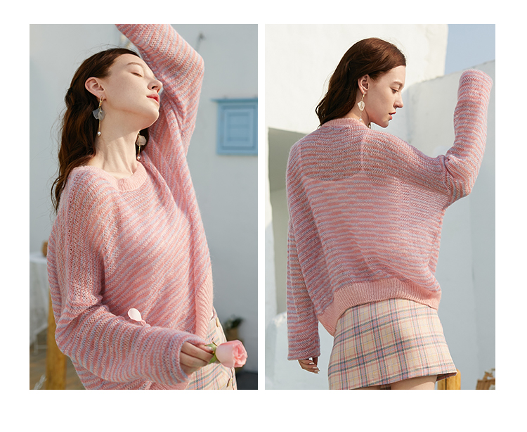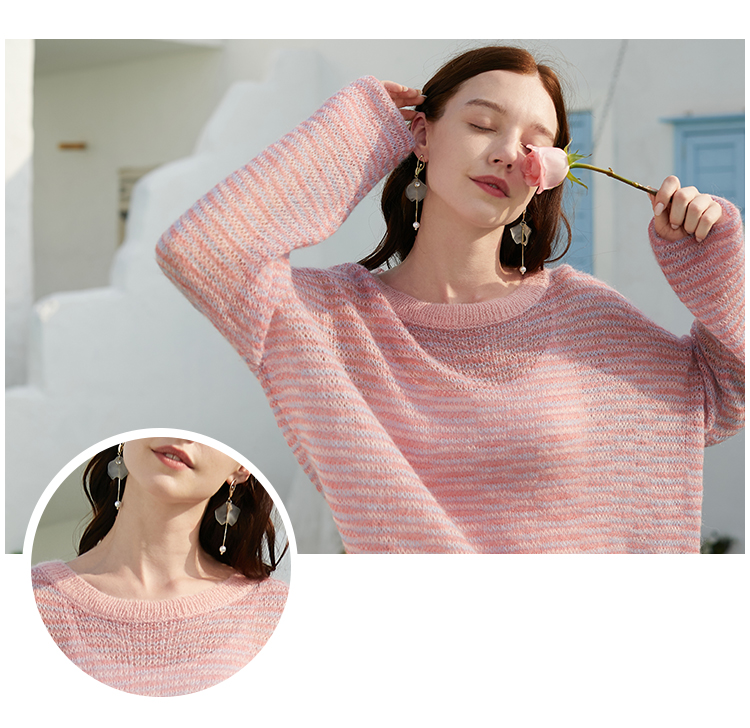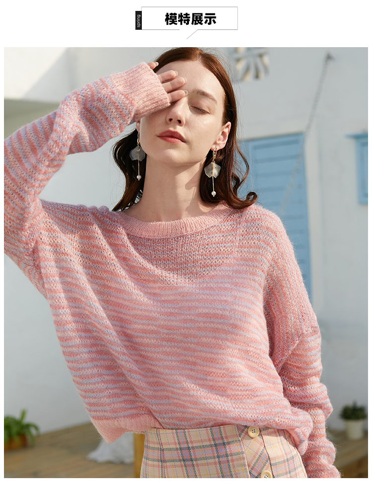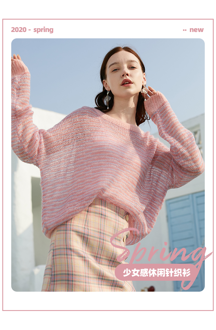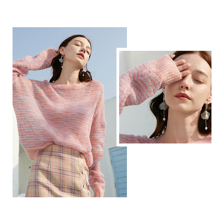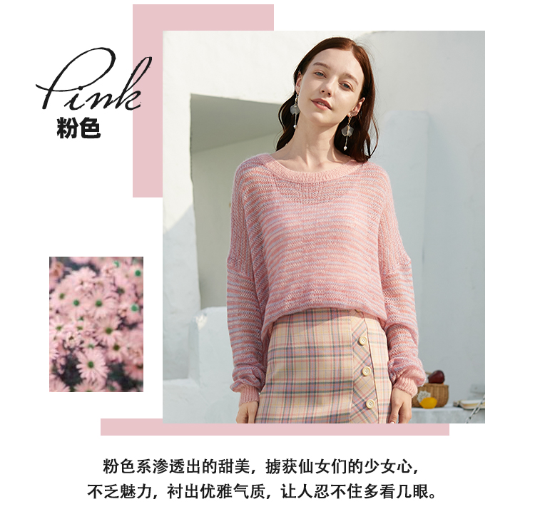 欧芮儿年春新款长袖慵懒风粉色毛衣女套头宽松内搭毛针织衫