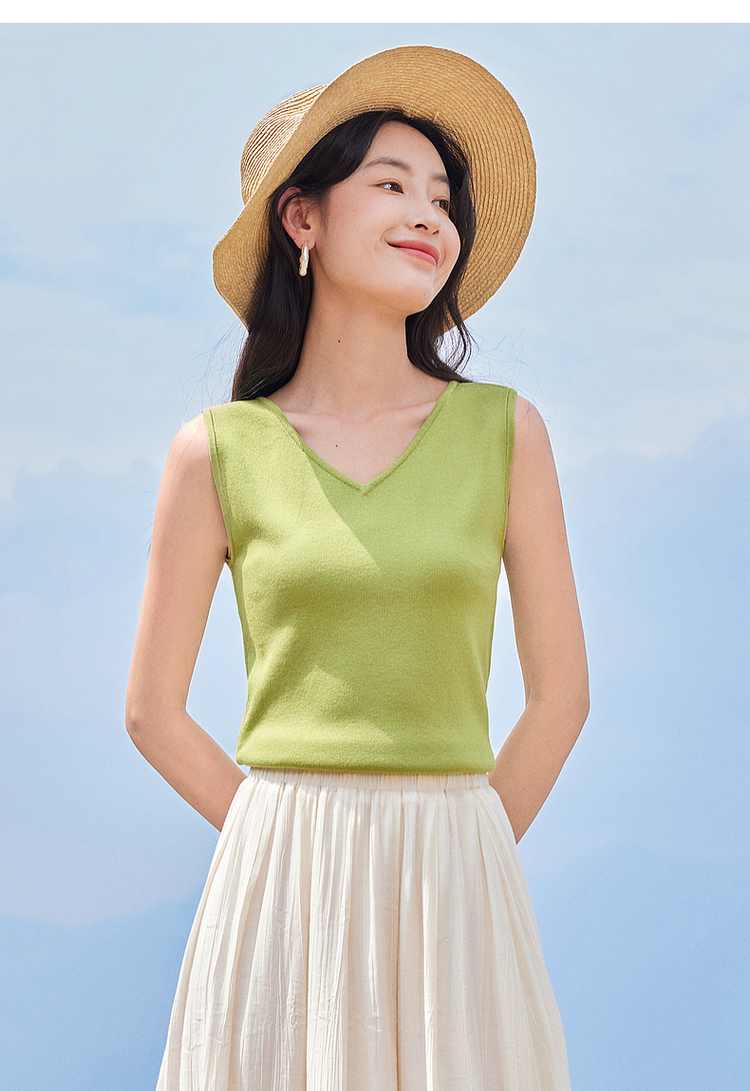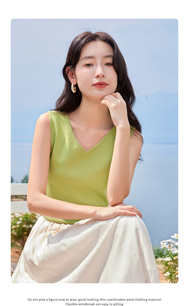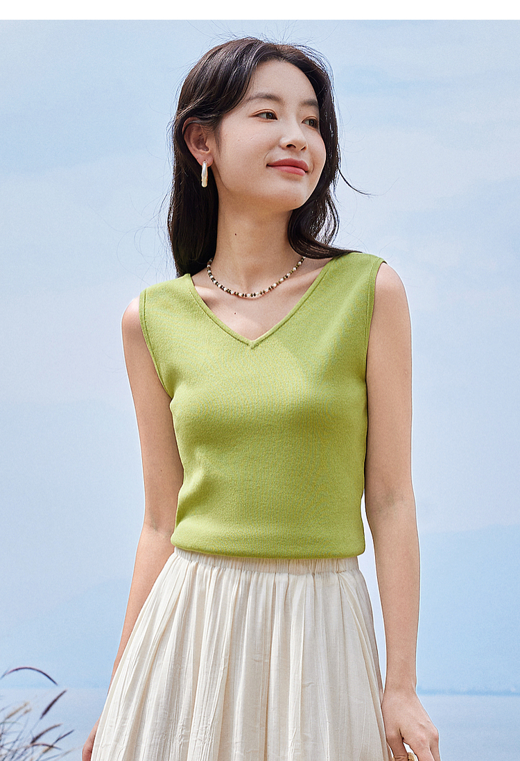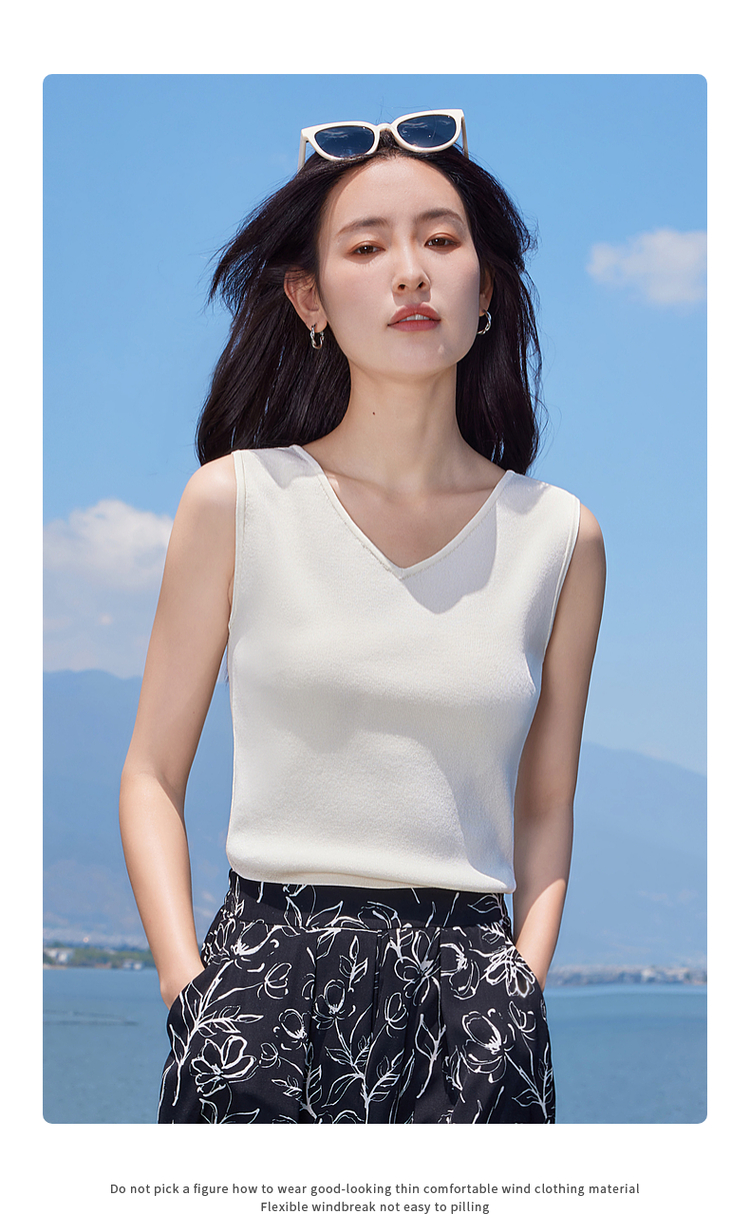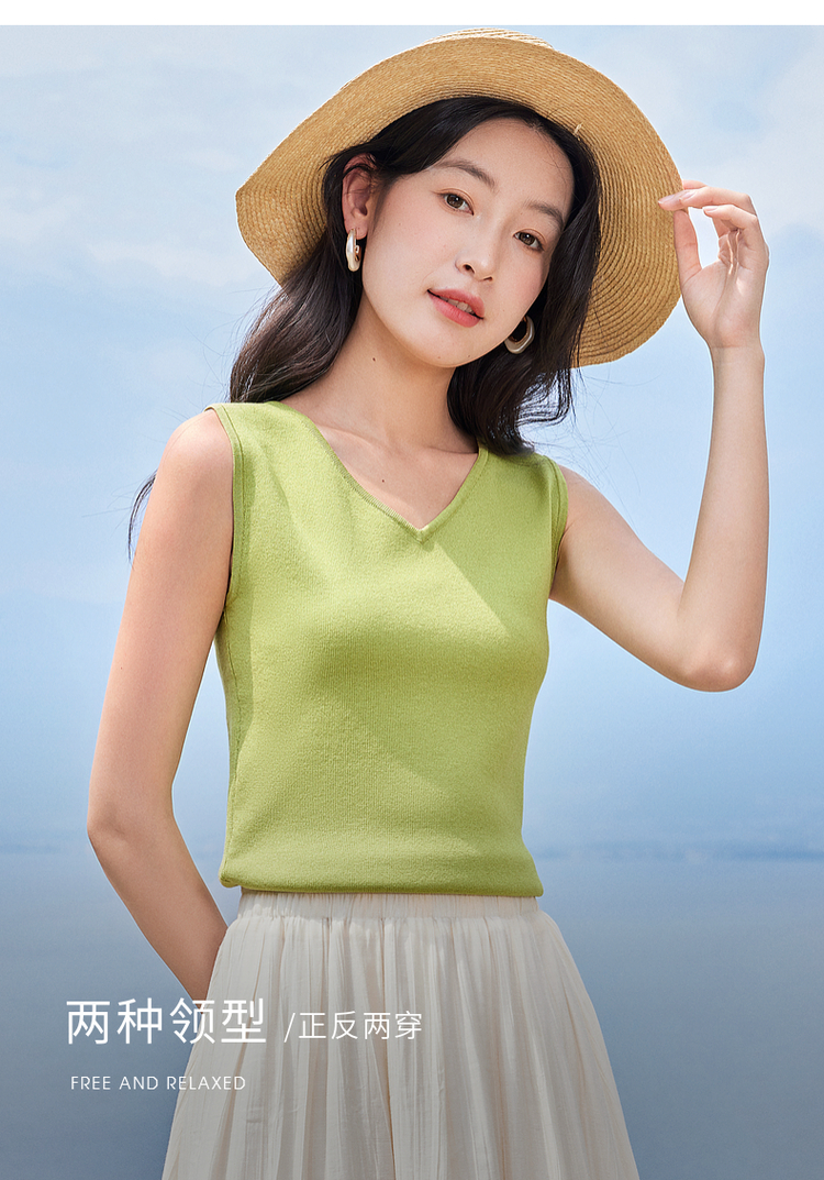 【周四狂欢价】熙世界双型领冰丝针织背心2025夏新款内搭纯色百搭无袖V领上衣