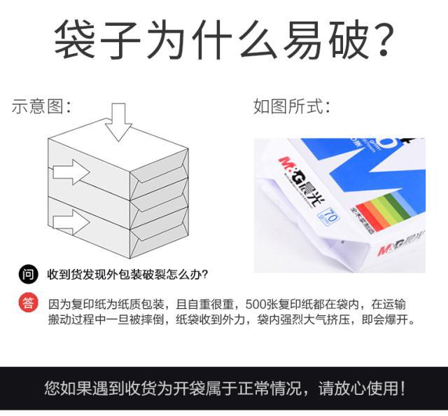 每一包打印纸发出去是保证包装完好的,由于产品自身较重,在快递运输途中,袋子内的空气因为挤压碰撞导致包装会破开,会对包装产生影响,不影响纸张的使用,此类属于正常情况。无法避免!如介意,请慎拍!!