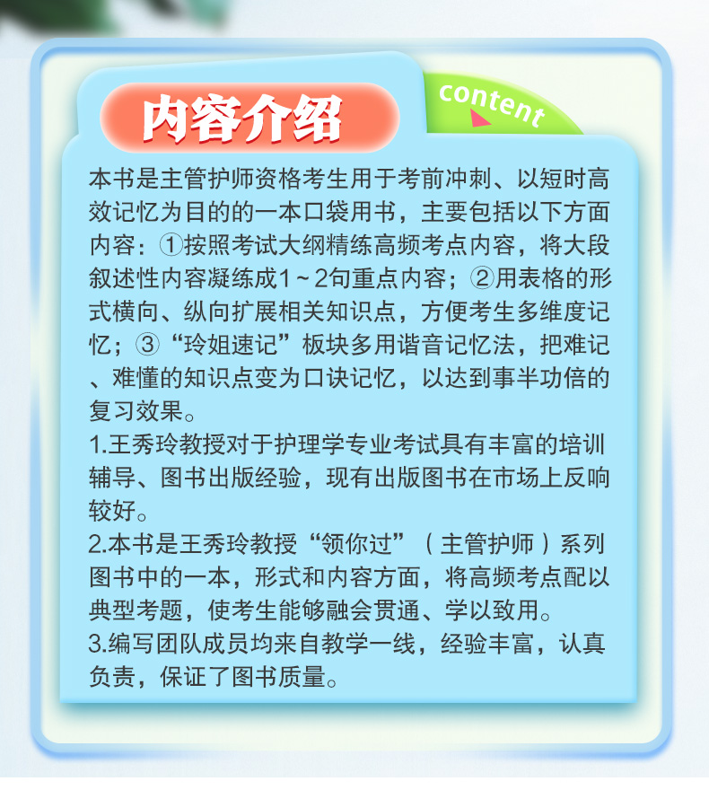 2.本书是王秀玲教授“领你过”(主管护师)系列图书中的一本,形式和内容方面,将高频考点配以典型考题,使考生能够融会贯通、学以致用。