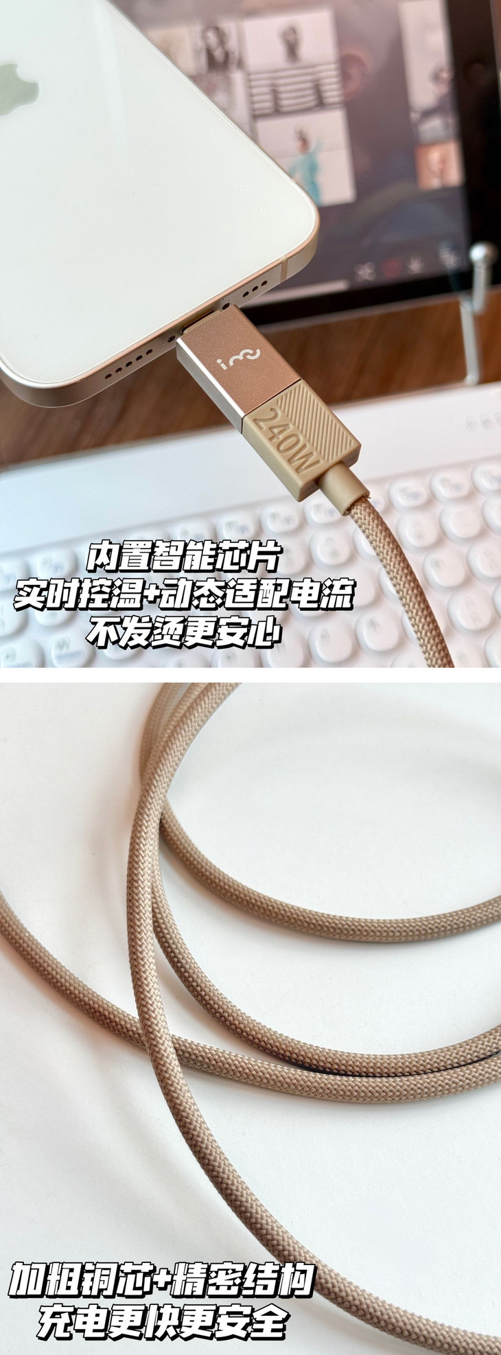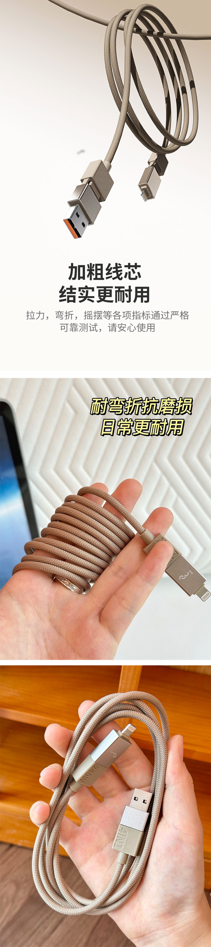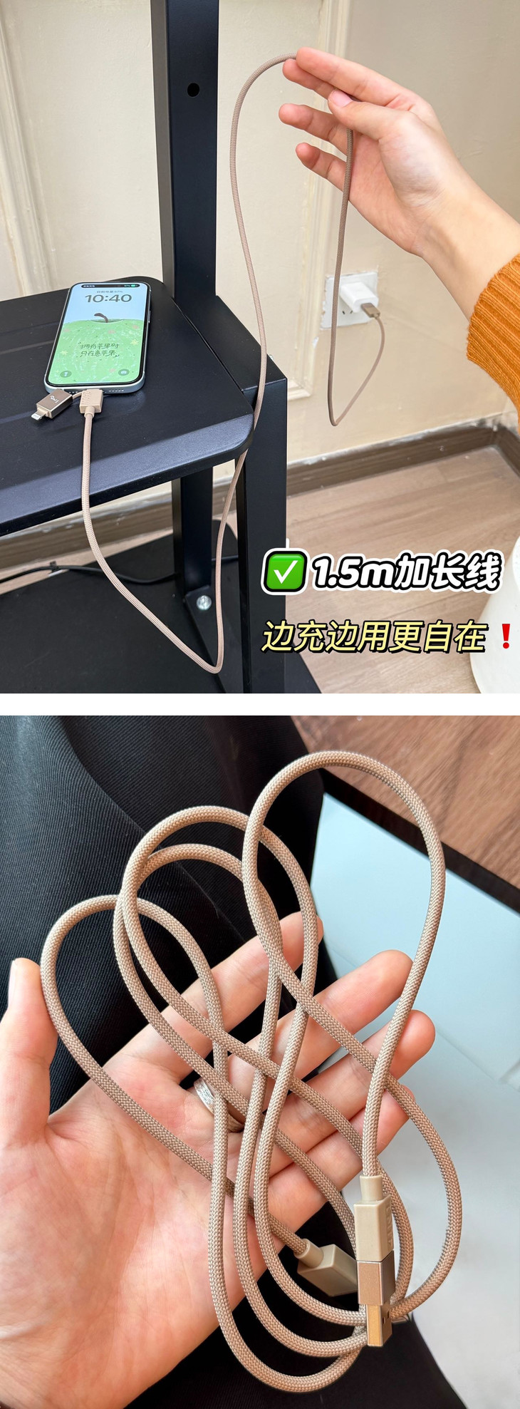 ✅外观做工很精致,玫瑰金色低调耐看 这根数据线的颜值真的很能打❗️玫瑰金色低调耐看,质感满满 它体积轻巧不占地,1.5米的主线收纳也很方便,家里、办公室、车里都好用 线身手感顺滑细腻,日常收纳不容易打结,出行携带也超方便 ✨细节做工也很到位:接头做了加固处理,耐弯折更耐用,接口处还有精致倒角和金属质感点缀 整体配色统一和谐,不张扬却很显品位,和各种设备都能完美搭配❗️ 看着舒服,握着也顺手,用起来心情都变好了😌