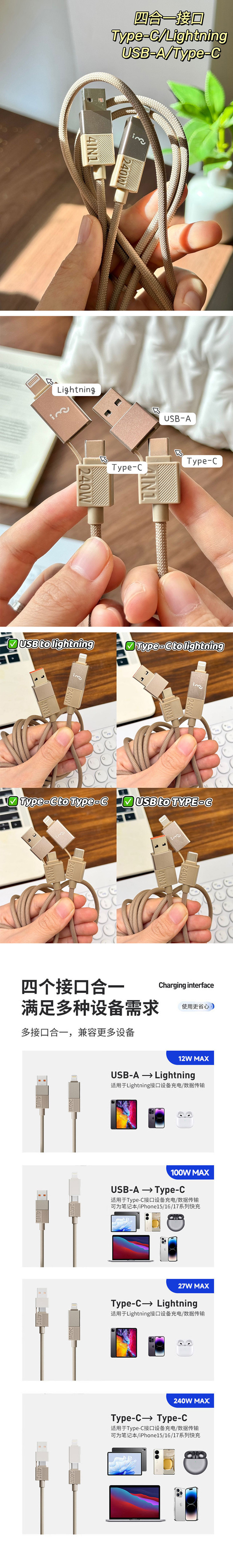✅四合一接口,匹配各种手机、平板、笔记本电脑、耳机、音箱等设备 这条线🈶️两个输入口和两个输出口 🔻双输入:USB-A/Type-C,插电更灵活 🔻双输出:Type-C+Lightning,新老设备全覆盖 等于同时拥有四条线: 1⃣️Type-C→Type-C2⃣️USB-A→Type-C 3⃣️Type-C→Lightning4⃣️USB-A→Lightning 👉🏻Type-C接口支持240W极速快充,苹果15-17、华为/小米/OPPO/VIVO/荣耀等品牌安卓机型充电速度狂飙,最快30分钟🉑充🈵 👉🏻Lightning接口适配苹果8-14系列机型,PD快充协议加持,充电稳定不弹窗 充电速度直接拉满❗️比普通数据线快3倍都不止,喝杯咖啡的功夫,设备电量全补满❗️ 出差赶时间、通勤路上、居家刷剧、办公赶方案,随时快速满血复活🔋 一根线顶四根,满足出差、通勤、居家、办公等各种场