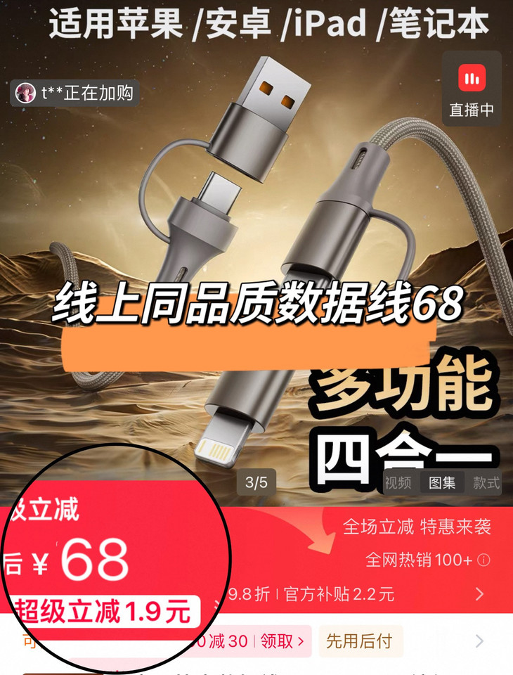 👀太狠了❗️比完才知道有多香❗️同规格的240W四合一数据线,线上同品质至少要68❗️ 🔥这次我们直接把价格打穿底价!专属福利价只要19.9元就可以拿下❗️ 这个价真的很少见,错过这波,后面基本不可能再有了❗️ 不管是自己用、给家人备,还是送同事朋友 想要一条顶四条、充电又快又稳的,直接入两根,家里一根包里一根,省心不将就💥