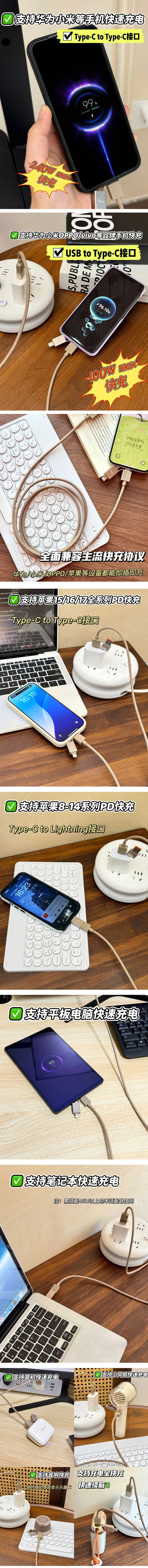 ✅快充兼容性拉满❗️四种连接全覆盖,新老设备一根通吃 不管是新旗舰、老机型,还是Type-C、苹果接口,这根线全适配,彻底告别“接口不对、协议不兼容”的麻烦❗️❗️ 🌟Type-C→Type-C:240W顶速快充,全协议兼容 ▪️240WMax超猛输出,安卓旗舰机、轻薄本极速补电 ▪️支持华为/小米/OPPO/VIVO/荣耀等品牌手机/平板快充协议 ▪️向下兼容120W/100W/66W/40W/22.5W等主流快充模式 ▪️苹果15-17系列可开启PD快充模式,全新iPhone充电不打折 🌟Type-C→Lightning:27WMax,苹果设备专属快充 ▪️适配iPhone8-14系列、老款iPad,稳定支持PD快充 ▪️充电不弹窗、不中断,老苹果用户也能高效补能 🌟USB→Type-C:100W顶速快充,全协议兼容 ▪️100WMax输出,满足安卓平板、中端手机快充需求 ▪️向下兼容66W/40W