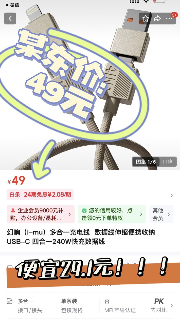 咱买东西主打的就是一个性价比❗ 幻响四合一240W快充数据线官方价49元🔥现在参加团购,秒杀只要19.9元💰,真的太合适啦😍 对比某东,咱们这次团购价简直就是捡大漏❗
