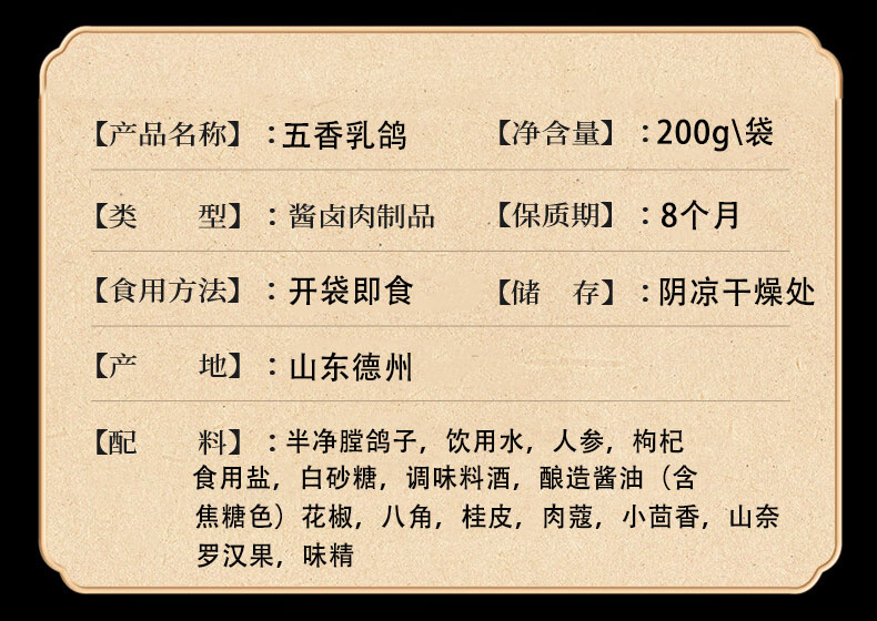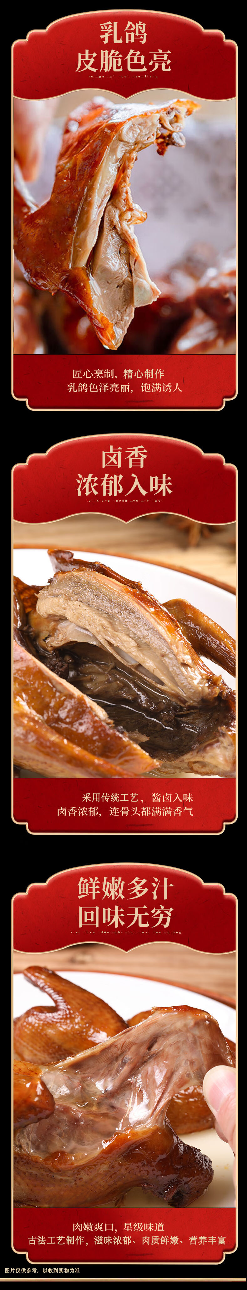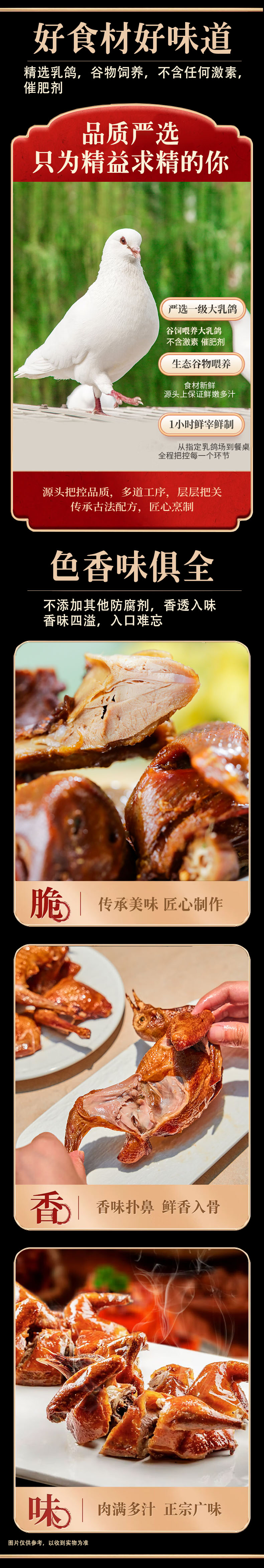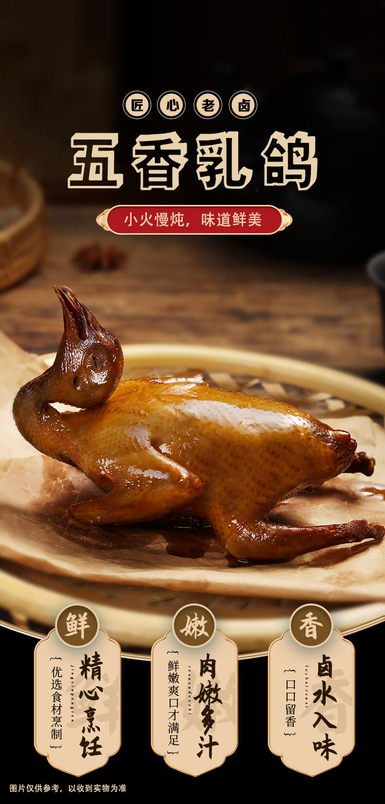 人参五香乳鸽,6袋装,精选谷物饲养足龄乳鸽,不含激素,催肥剂,搭配人参,枸杞等多种营养食材,古法技艺制作,配料干净,滋味浓郁、肉质鲜嫩、营养丰富,解馋过瘾M