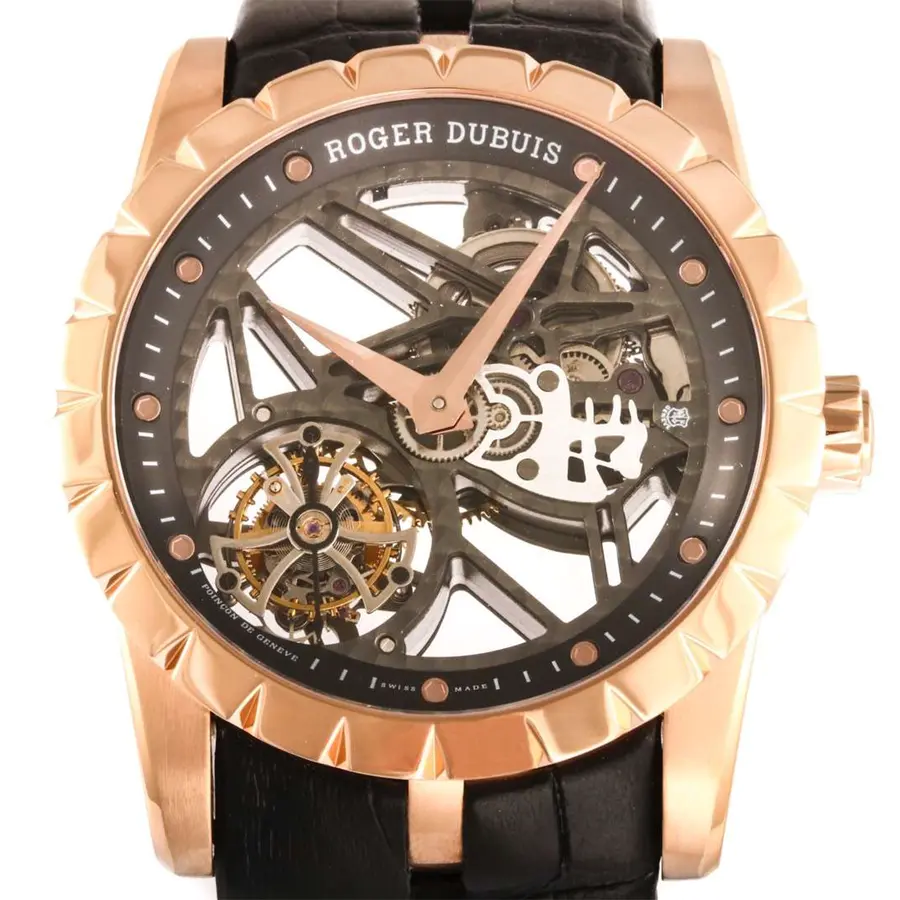 JB罗杰杜biEXCALIBUR王者系列金壳RDDBEX0392,45mm直径,皮表带,陀飞轮机芯,男士腕表,透底