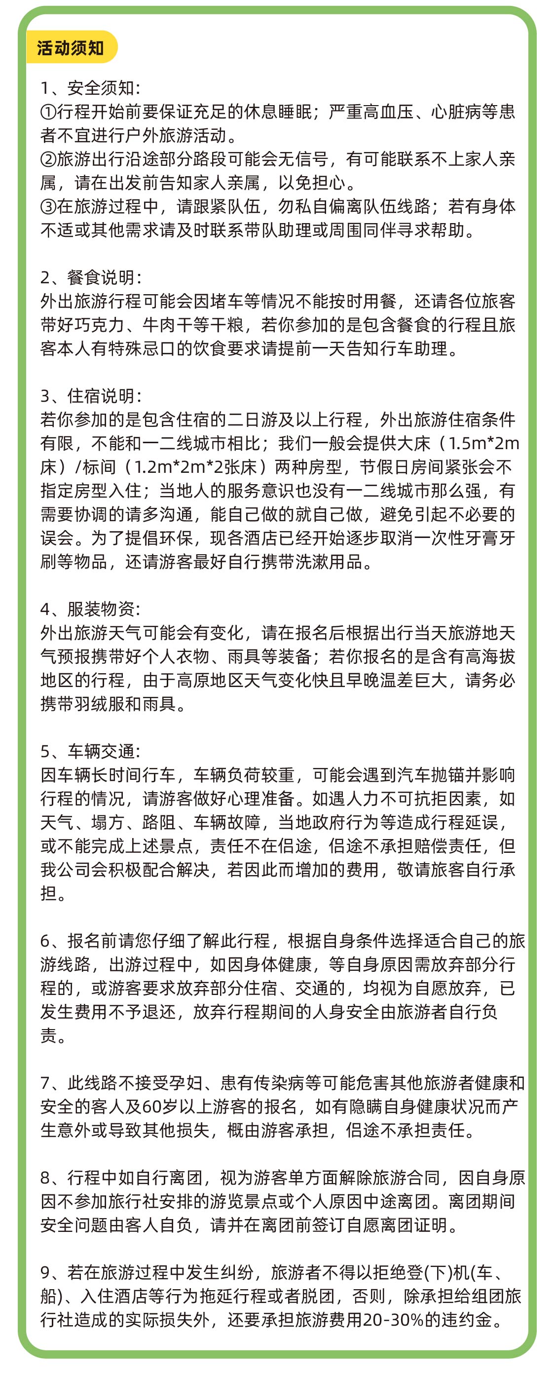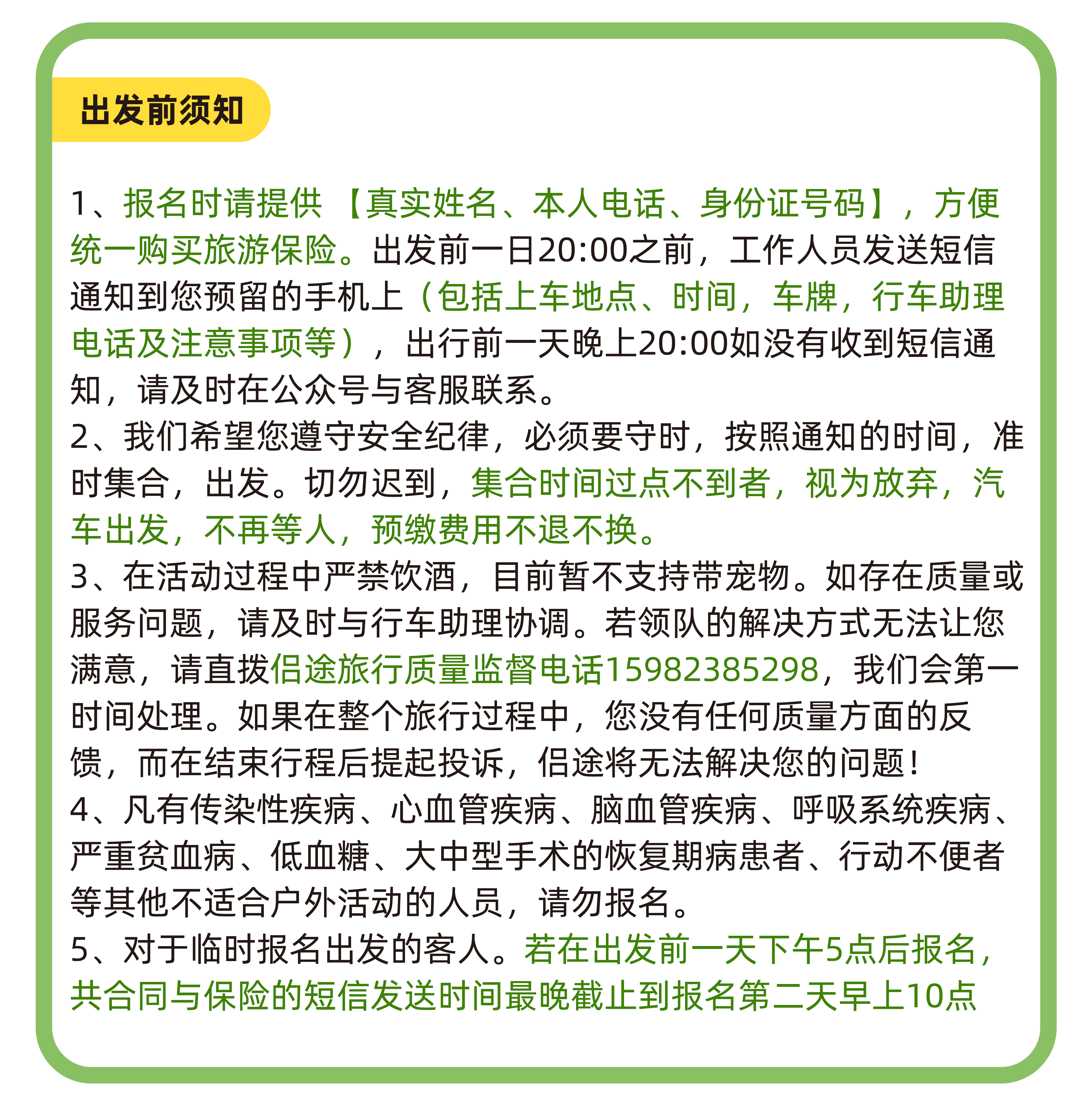 | 清明等节假日、周末,为了大家有更好的游玩体验,会调整出发至早上【6:00-6:30】,请大家提前 做好安排哦 | |