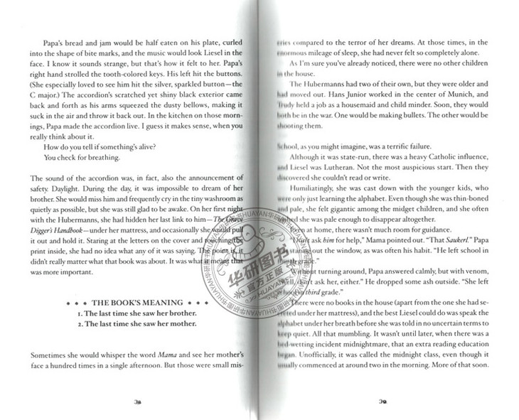 The Book Thief《偷书贼》是澳大利亚畅销作家马克斯·苏萨克创作的一部反战文学作品,2006年被亚马逊网络书店评为年度选书。33岁的作者马克斯·苏萨克在平静描述中,将亲情、友情、爱情、战争、死亡、生存、欺骗、诚实这许多熟悉的字眼以完全不熟悉的方式展现出来。马克斯以自己的方式,歌颂着书籍和文字的力量。正是文字,将人性之美之善之丑之恶照得雪亮。推荐理由:1.曾登《纽约时报》青少年文学排行榜榜首,发行三个月销量就超越百万;2.获奖无数,如美国图书馆协会Pintz奖,2006年Book Sense儿童文学类年度选书,犹太图书馆小说奖,澳大利亚图书产业奖等等;3.关注社会热点问题,同时是一部优秀的青少年文学作品,适合各个年龄层的读者;4.英文原版图书,摒除了翻译过程中的语言转变,更加原汁原味。It’s just a small story really, about among other things: a girl, some words, an accordionist, some fanatical Germans, a Jewish fist-fighter, and quite a lot of thievery… Set during World War II in Germany, Markus Zusak’s groundbreaking new novel is the story of Liesel Meminger, a foster girl living outside of Munich. Liesel scratches out a meager existence for herself by stealing when she encounters something she can’t resist—books. With the help of her accordion-playing foster father, she learns to read and shares her stolen books with her neighbors during bombing raids as well as with the Jewish man hidden in her basement before he is marched to Dachau. This is an unforgettable story about the ability of books to feed the soul.Reviews:“Unsettling, thought-provoking, life-affirming, triumphant and tragic, this is a novel of breath-taking scope, masterfully told... A wonderful page-turner.” — The Guardian“The Book Thiefis unsettling and unsentimental, yet ultimately poetic. Its grimness and tragedy run through the reader’s mind like a black-and-white movie, bereft of the colors of life. Zusak may not have lived under Nazi domination, but The Book Thief deserves a place on the same shelf with The Diary of a Young Girl by Anne Frank and Elie Wiesel’s Night. It seems poised to become a classic.”— USA Today“Zusak doesn’t sugarcoat anything, but he makes his ostensibly gloomy subject bearable the same way Kurt Vonnegut did in Slaughterhouse-Five: with grim, darkly consoling humor.”—Time Magazine“The Book Thief will be appreciated for Mr. Zusak’s audacity, also on display in his earlier I Am the Messenger. It will be widely read and admired because it tells a story in which books become treasures. And because there’s no arguing with a sentiment like that.”— New York Times