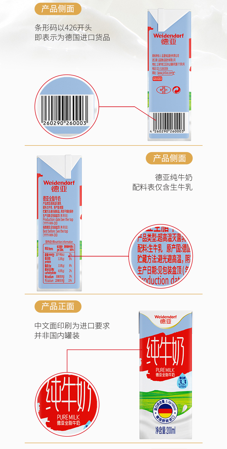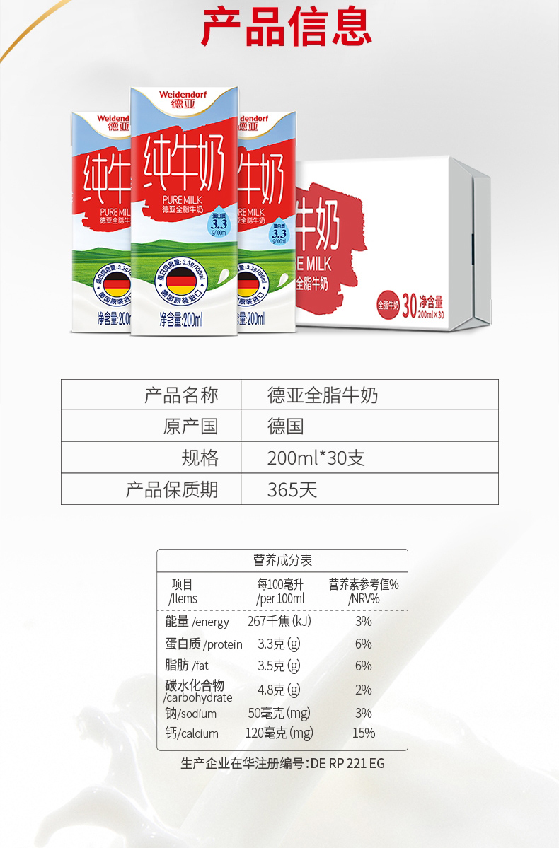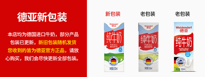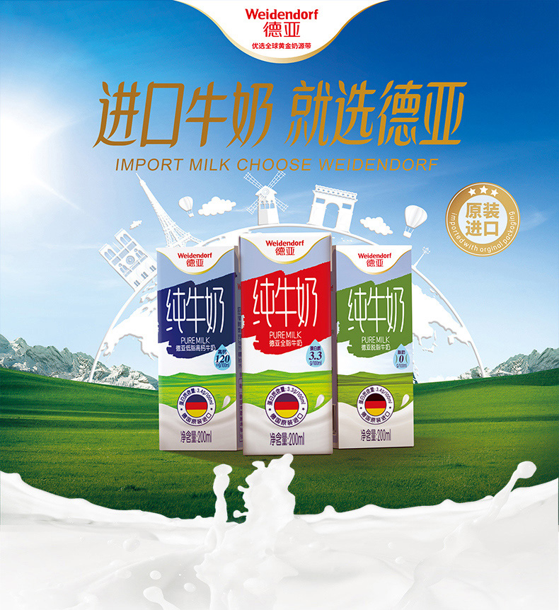 德国进口牛奶 德亚(Weidendorf)全脂纯牛奶早餐奶200ml*30盒整箱装(新老包装随机发货)优质乳蛋白