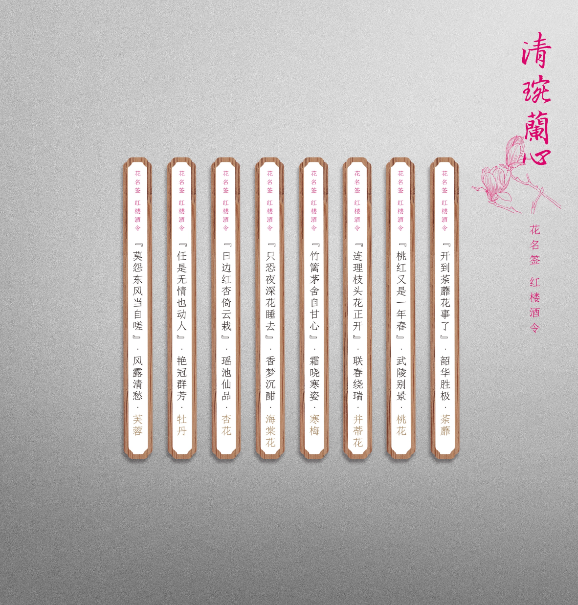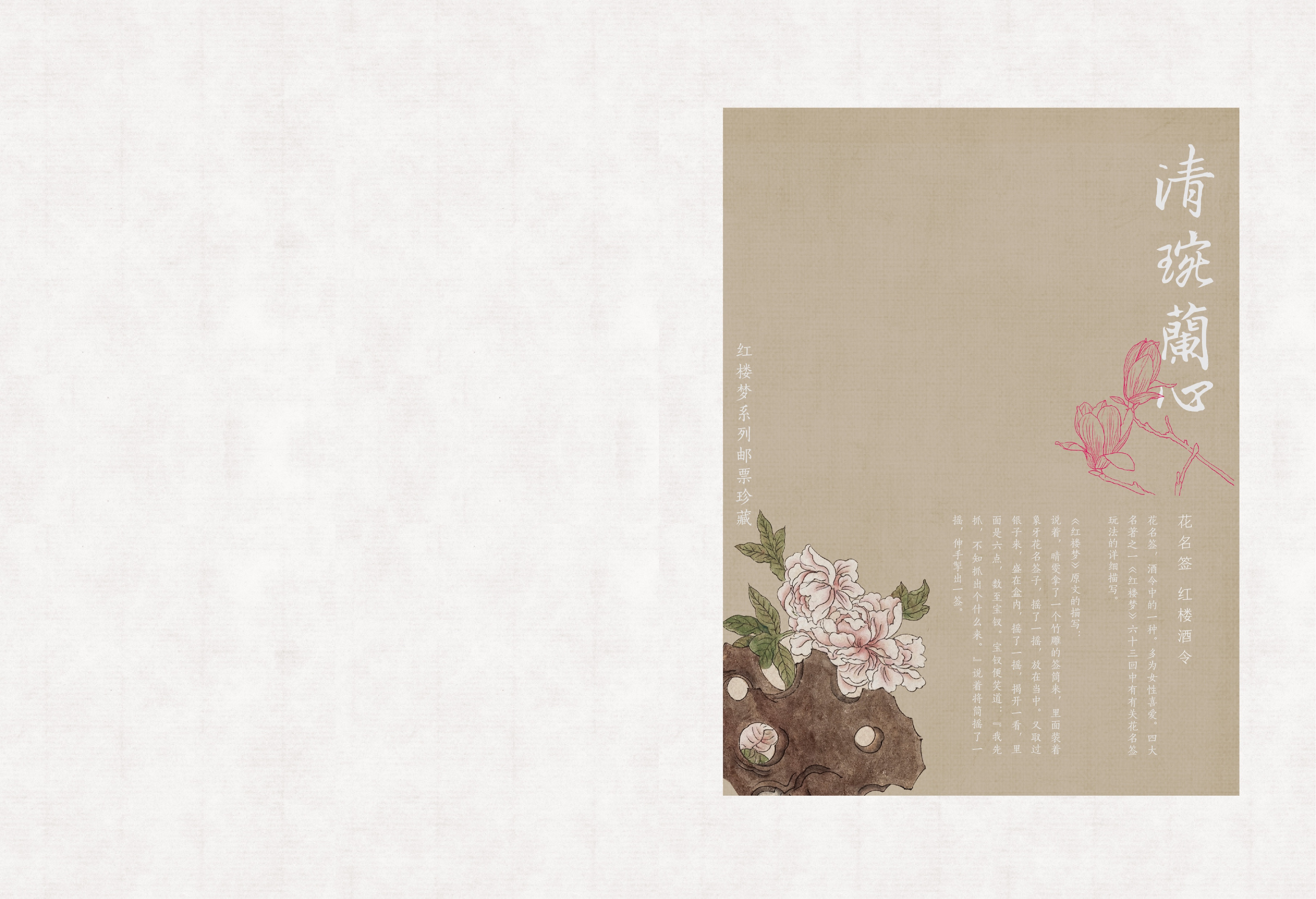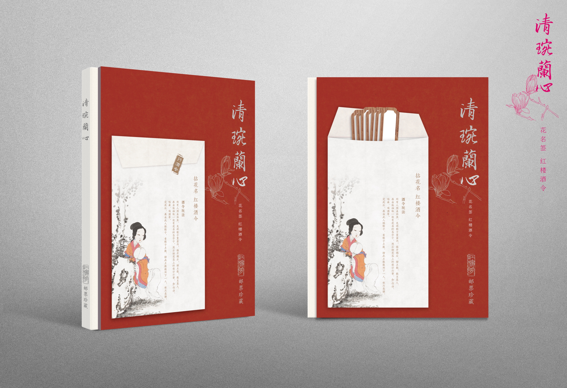 本邮册创新设计了《花名签 红楼酒令》,汲取《红楼梦》第六十三回中的花名签为灵感,设计出一款小游戏,适合好友小聚、酒桌游戏、公司团建等,既能玩出乐趣、又能增长知识。游戏规则:所有人围桌而坐先由一人掷骰子,按点数数至某人,再由他抽取一枚有花名的签子,然后按花签上的提示行事,如喝酒,作诗,唱歌,讲笑话等。