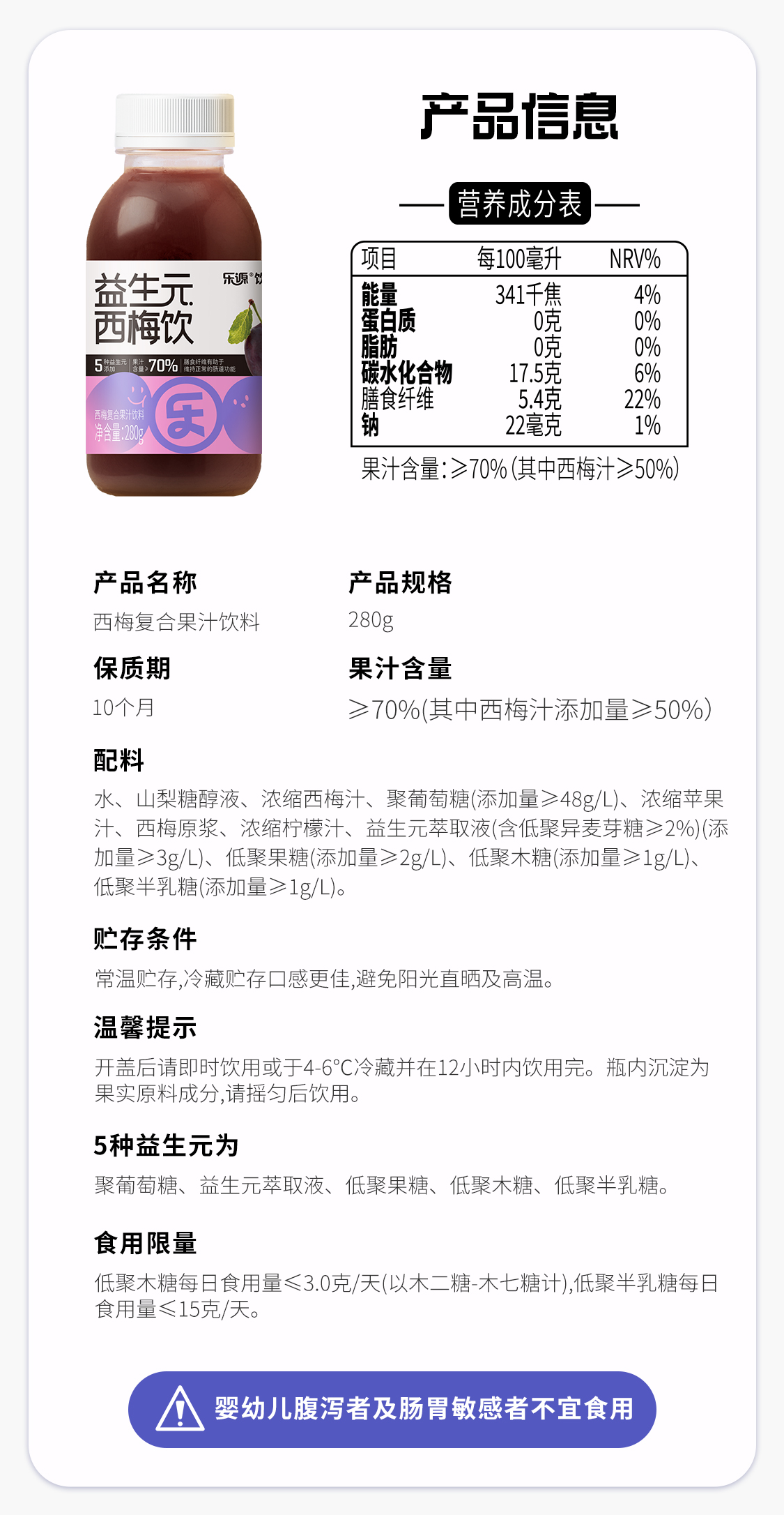 乐源 益生元西梅饮西梅汁280克*8瓶 0脂纯浓缩原浆果蔬汁饮料