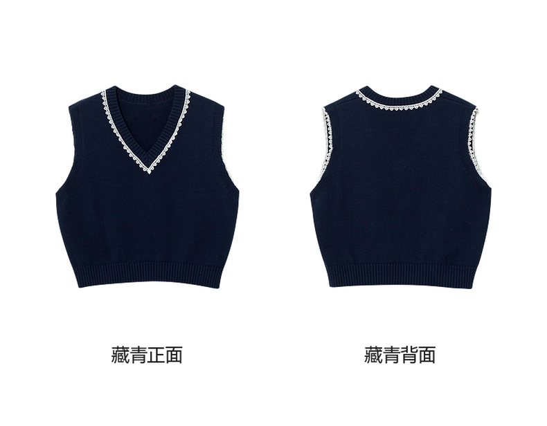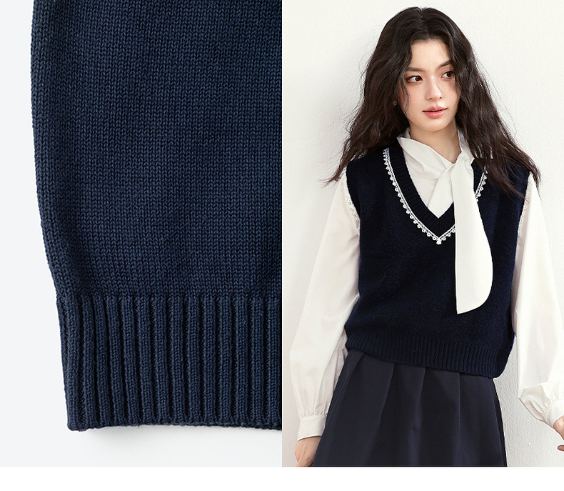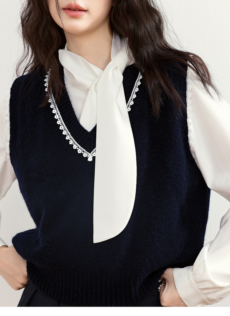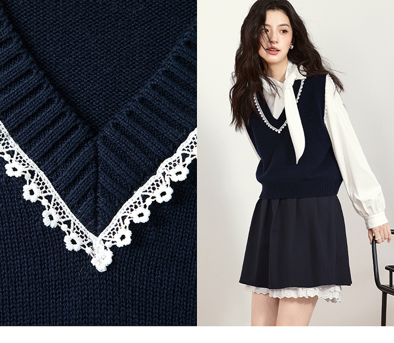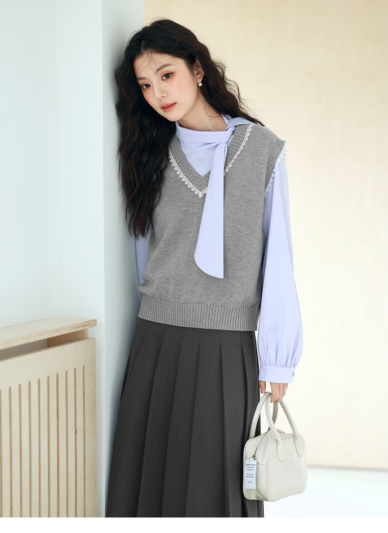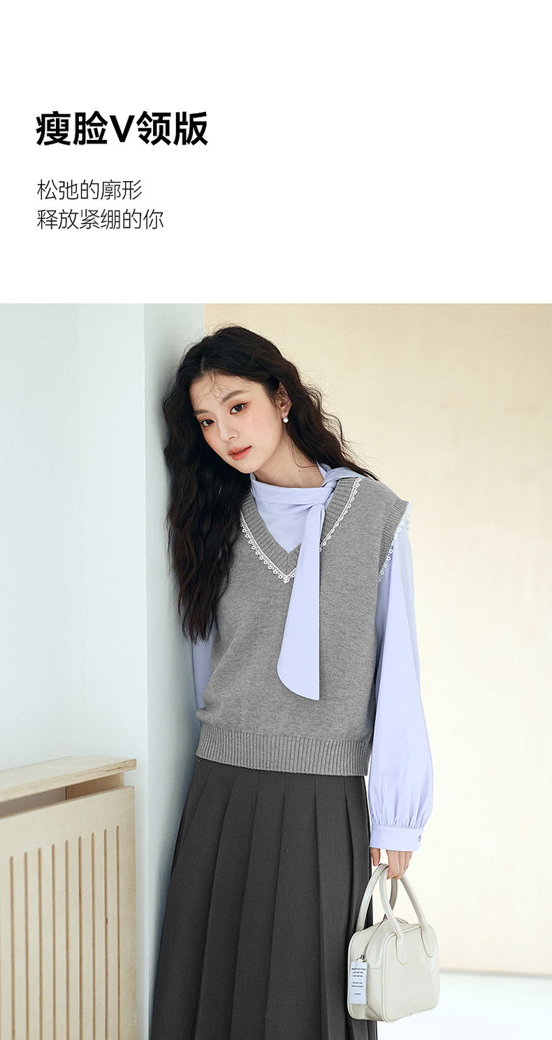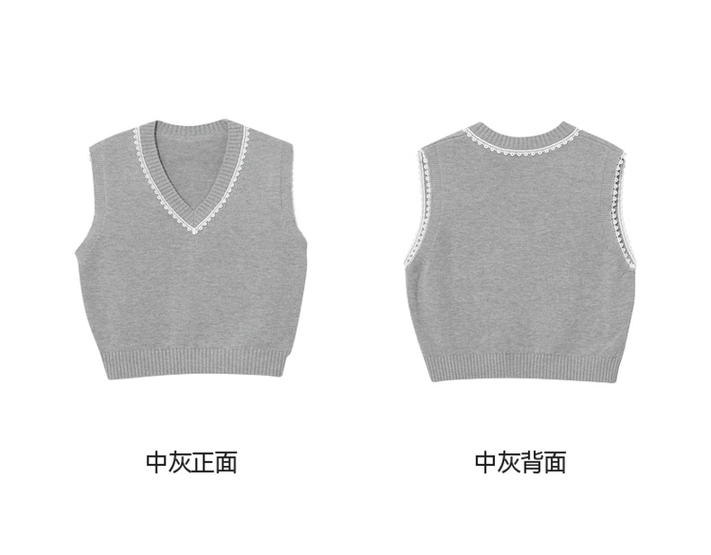 【严选】诗凡黎100%棉V领花边拼接针织马甲25春新品灰色百搭叠穿上衣7G1130681